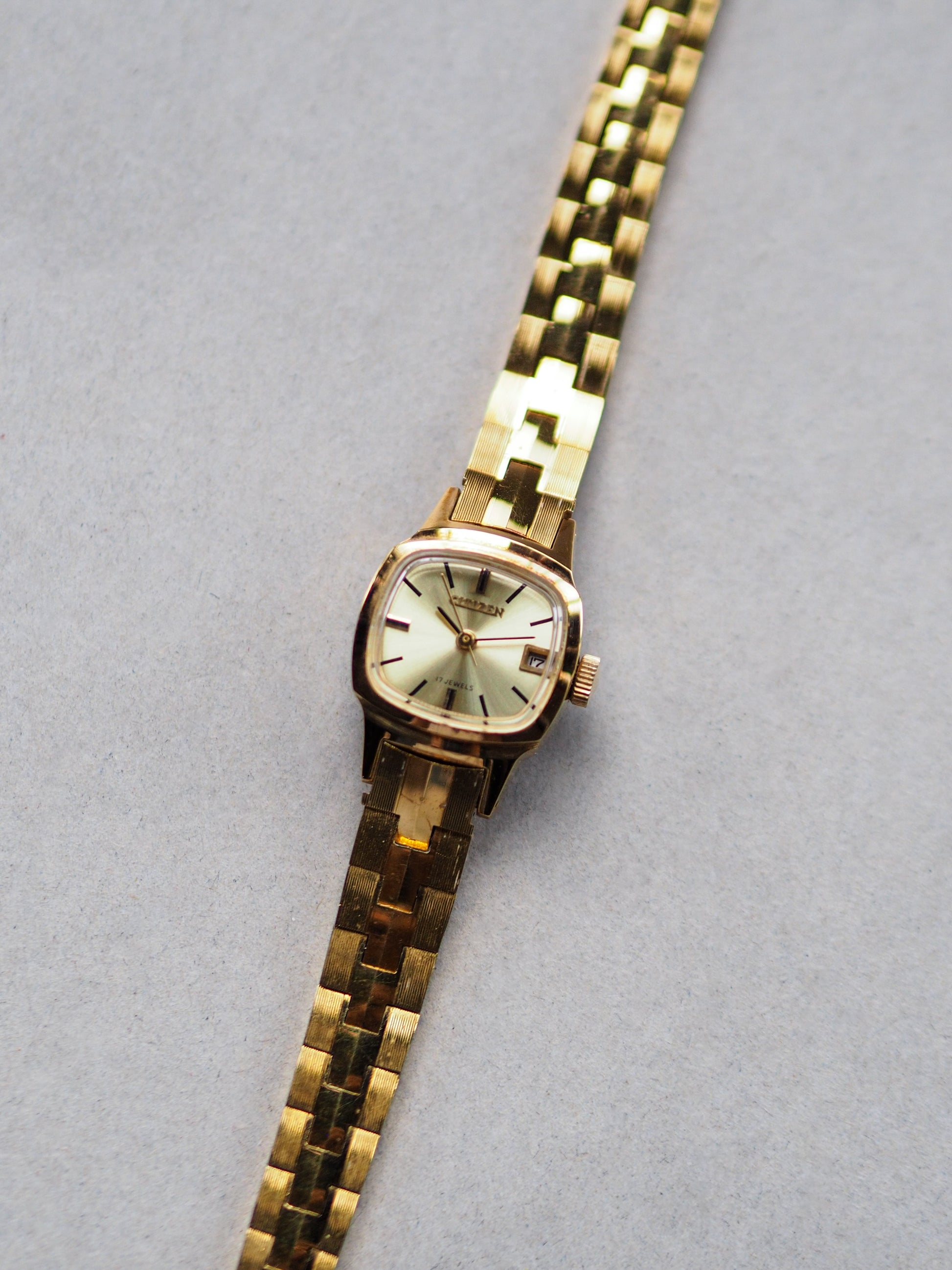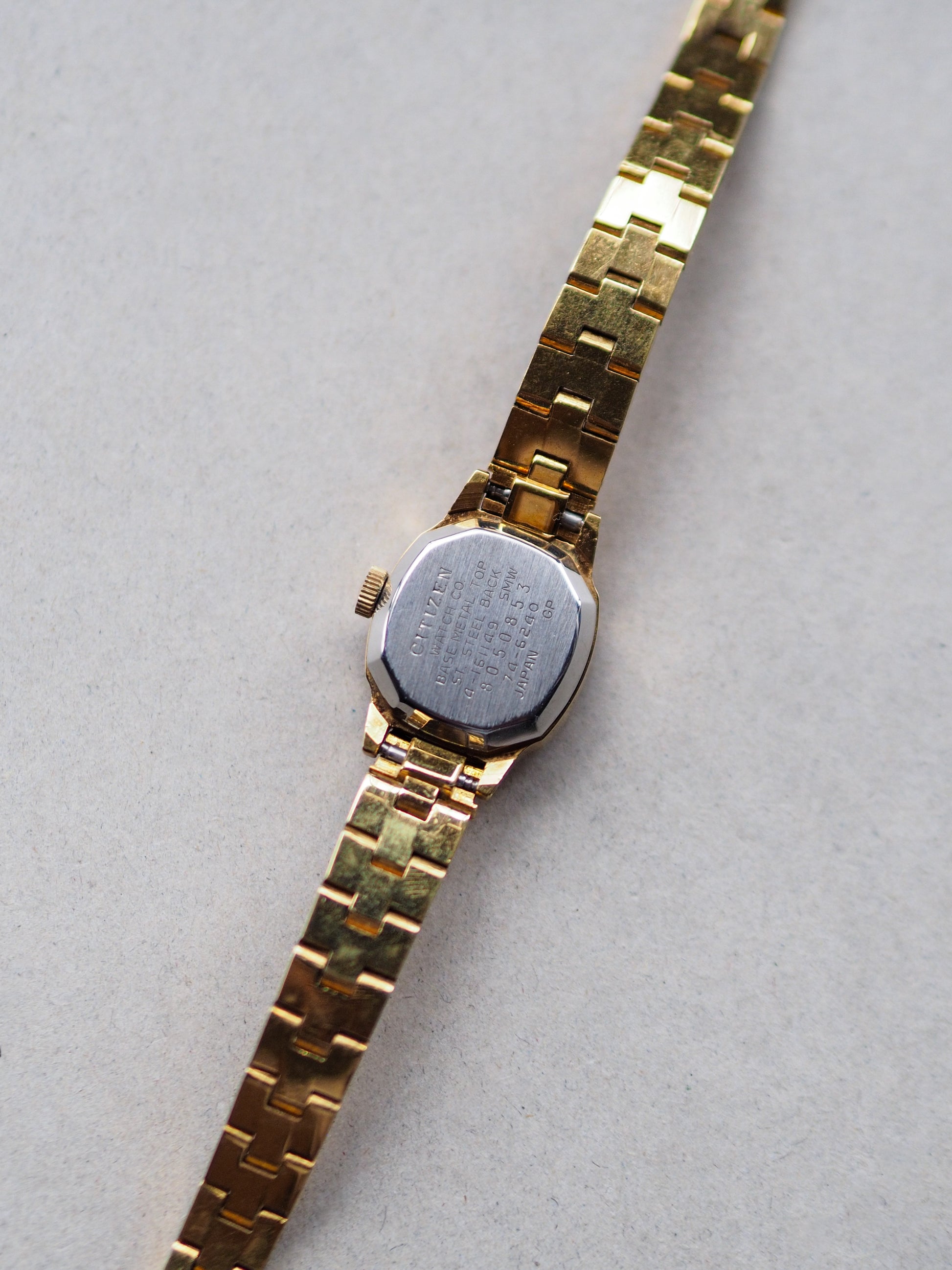 The watch is housed in a gold-plated base metal cushion case with a stainless steel caseback, fully signed “Citizen Watch Co.” and marked Japan. Its smaller ladies-size case gives a delicate and elegant presence on the wrist, making it ideal for everyday wear or as a vintage dress watch.