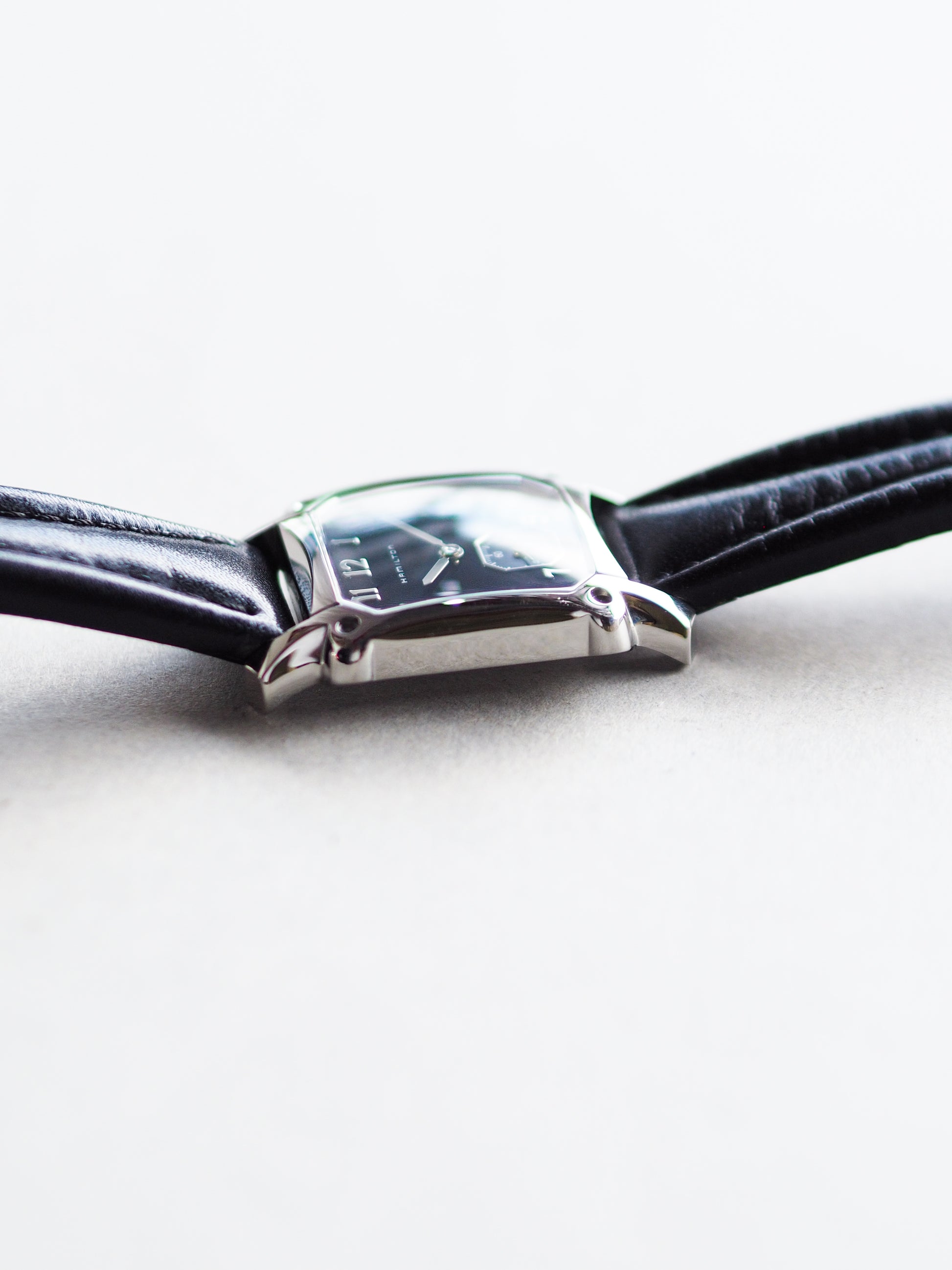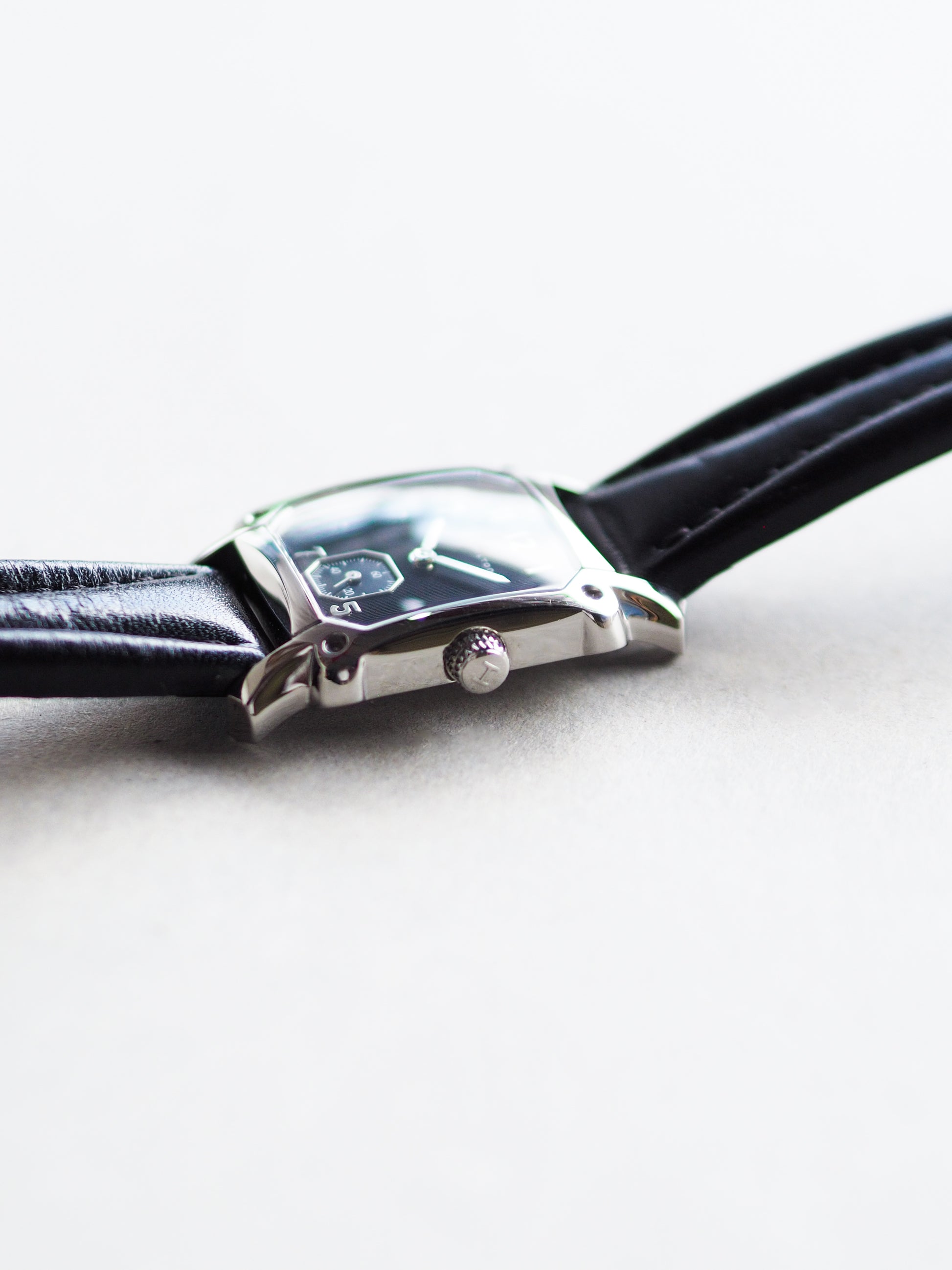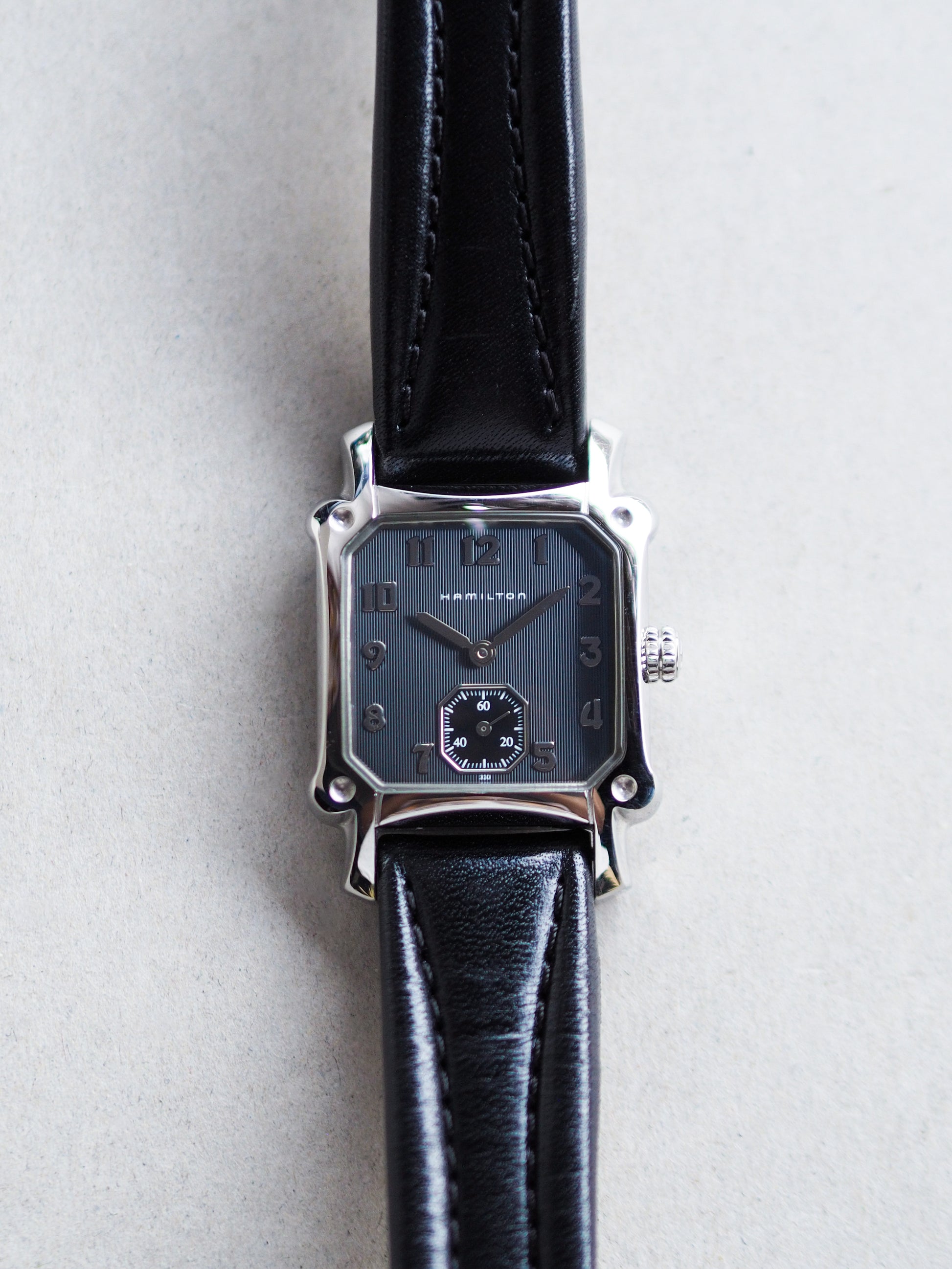 This Hamilton Lloyd 6341 reissue captures the spirit of the original, blending mid-century elegance with modern detail. Its curved square case, domed sapphire crystal, and octagonal black dial with vertical pinstripe motif reflect Wright’s influence—particularly visible in the circular cornice detailing and bold, elongated lugs, which mirror architectural structures rather than conventional watch design.