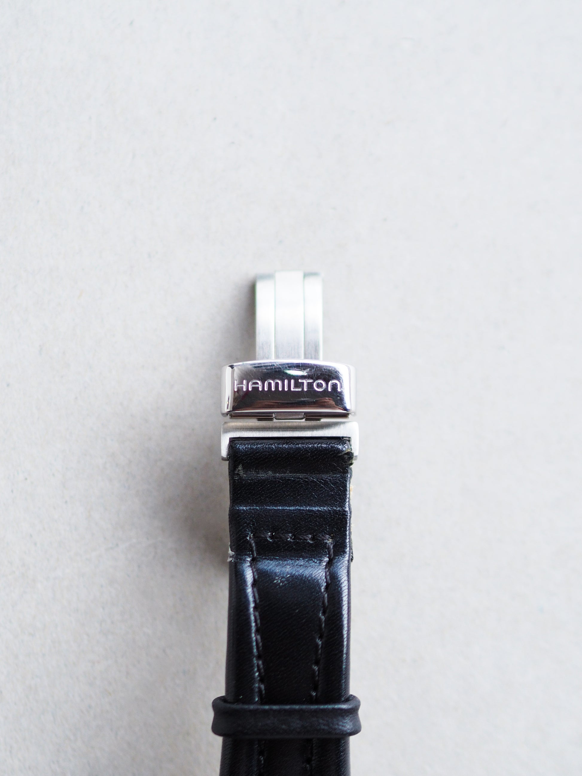 The watch is in excellent condition, featuring a clean dial, clear crystal, and only light signs of wear on the case. It retains the original Hamilton leather strap, gently worn and the original signed clasp.