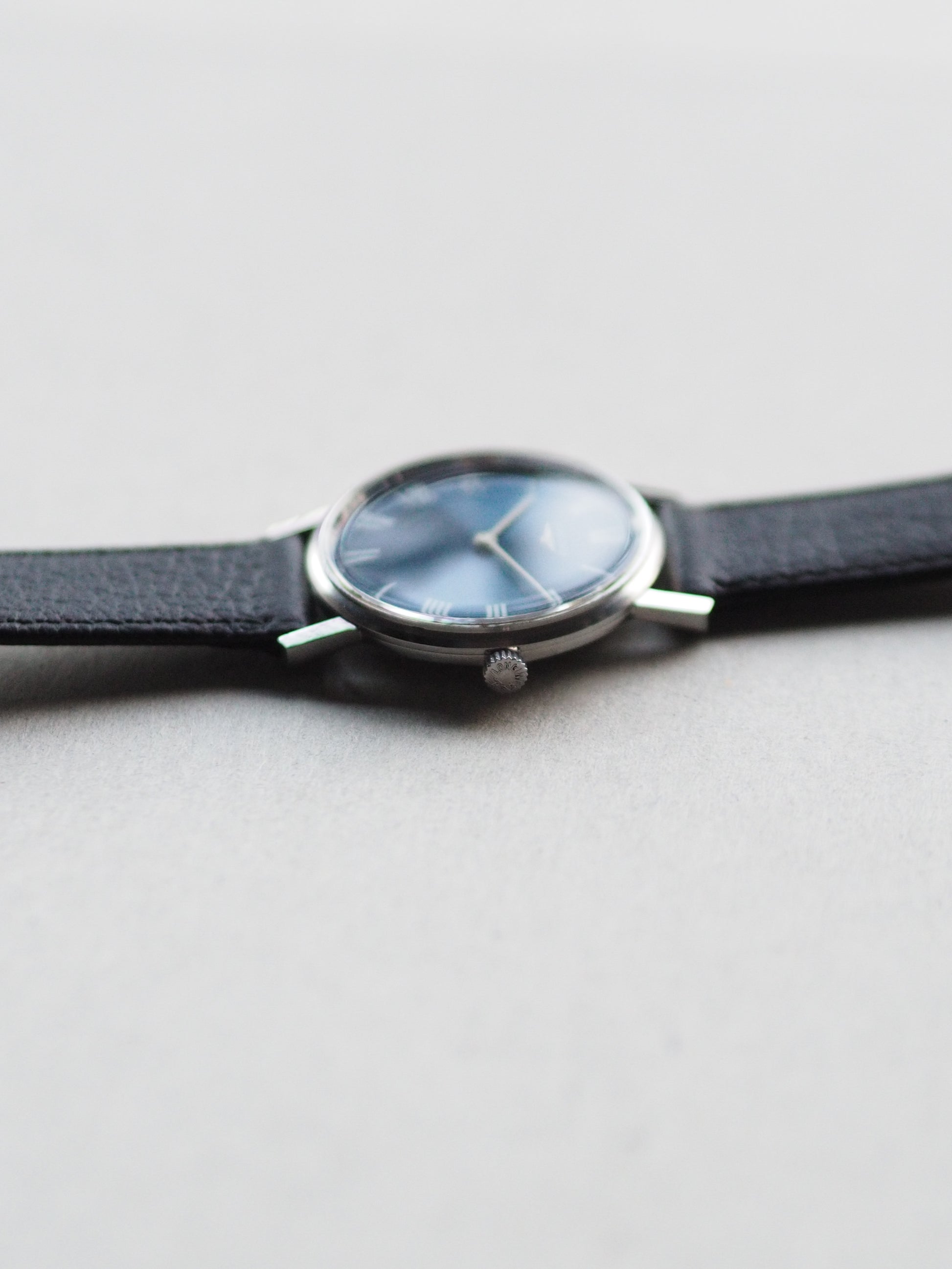 For sale a 1970s charming vintage Longines featuring a classic round case and a striking blue sunburst dial paired with crisp white Roman numerals and elegant pencil-style hands. A timeless combination that gives the watch a refined, understated character.