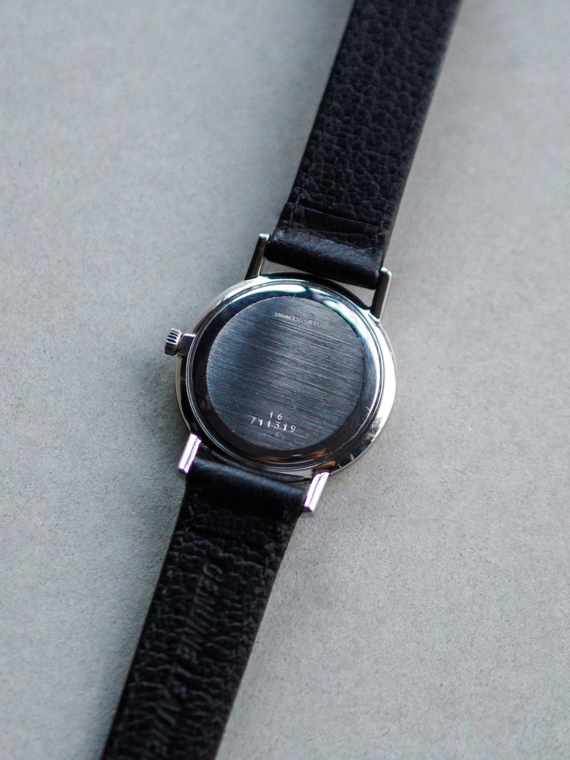 The manual winding Cal. 428 movement has been recently serviced and runs smoothly with light, clean winding action. The case shows minor light scratches consistent with gentle wear. The dial remains overall clean, while the crystal is clear with faint hairline scratches and a tiny dent near the edge, not very noticeable and fully unobtrusive to visibility.