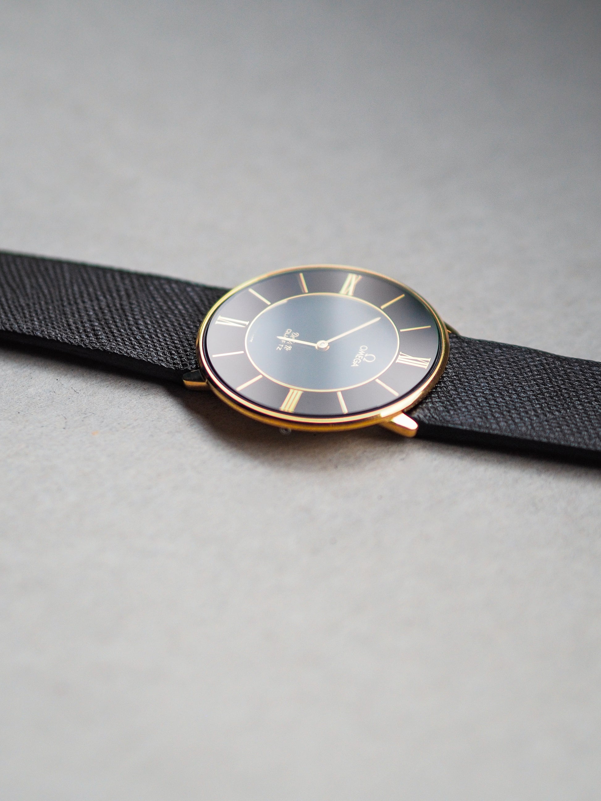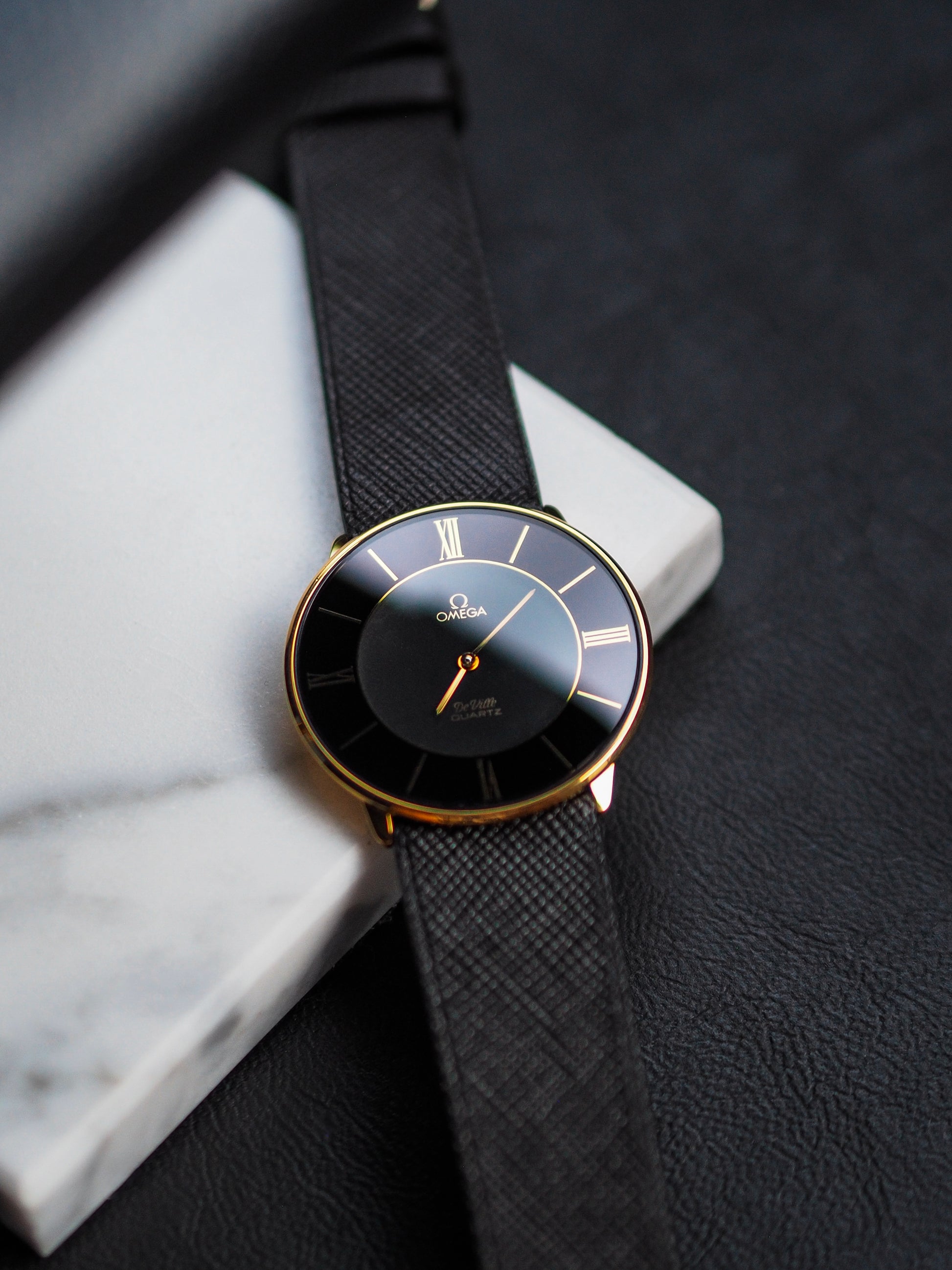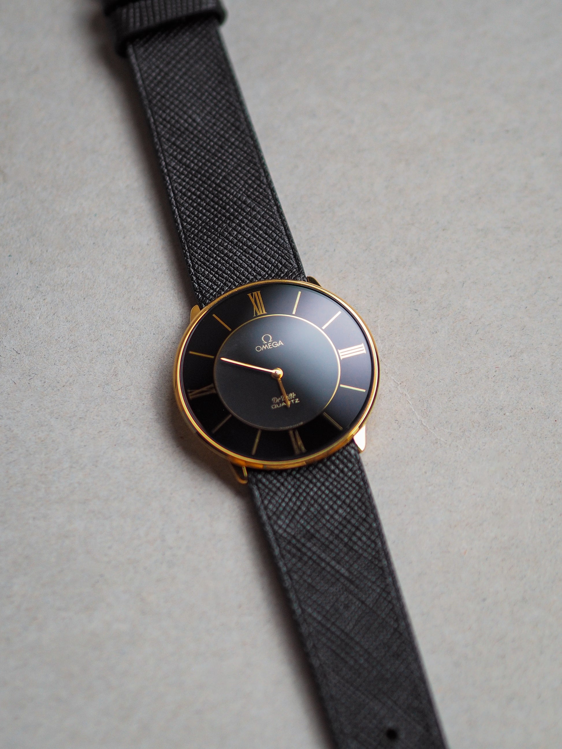 This Omega ref. 191.01016 is a rare and elegant model from the vintage Omega De Ville quartz line, embodying timeless sophistication and minimalist design. The slim gold-plated stainless steel case, with a thickness of just 5mm, complements its large black glass dial, featuring classic Roman numeral accents around a solid black center with gold hands, creating a refined and timeless look.