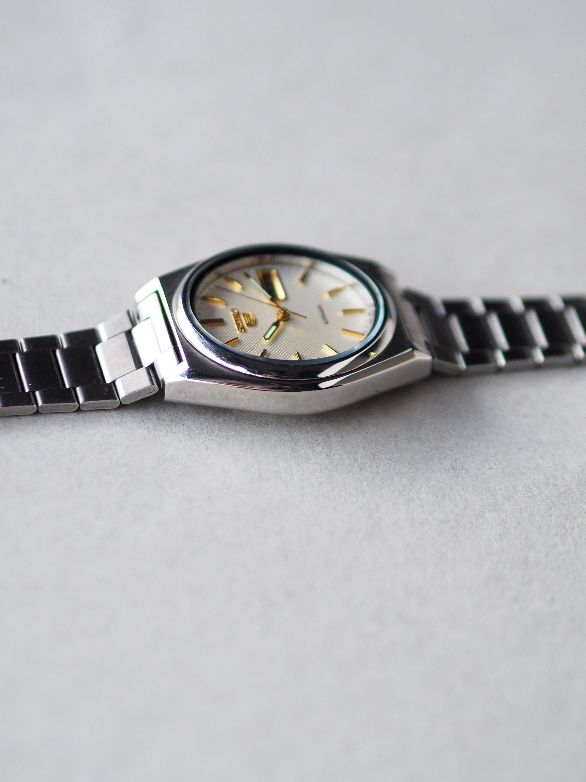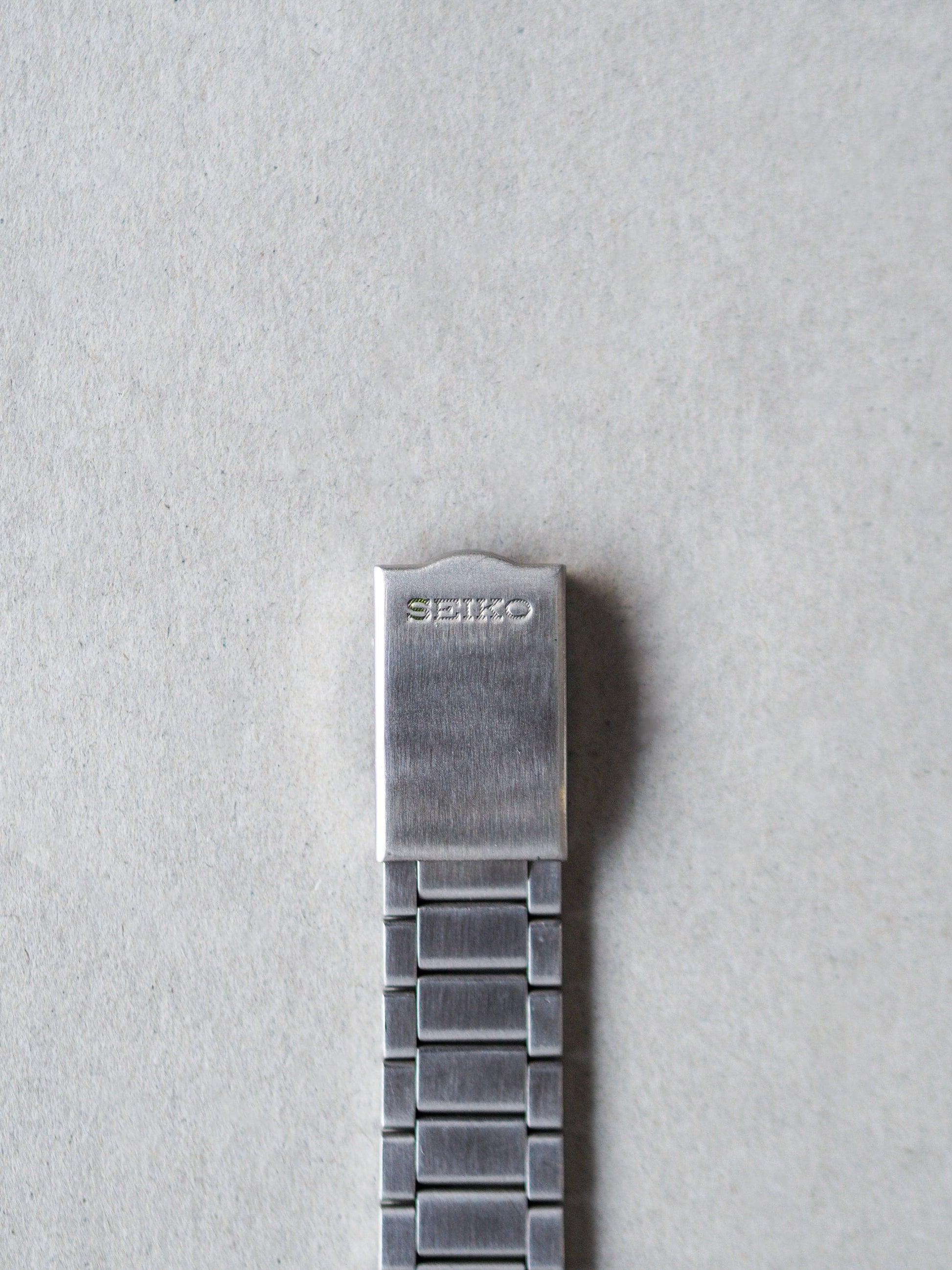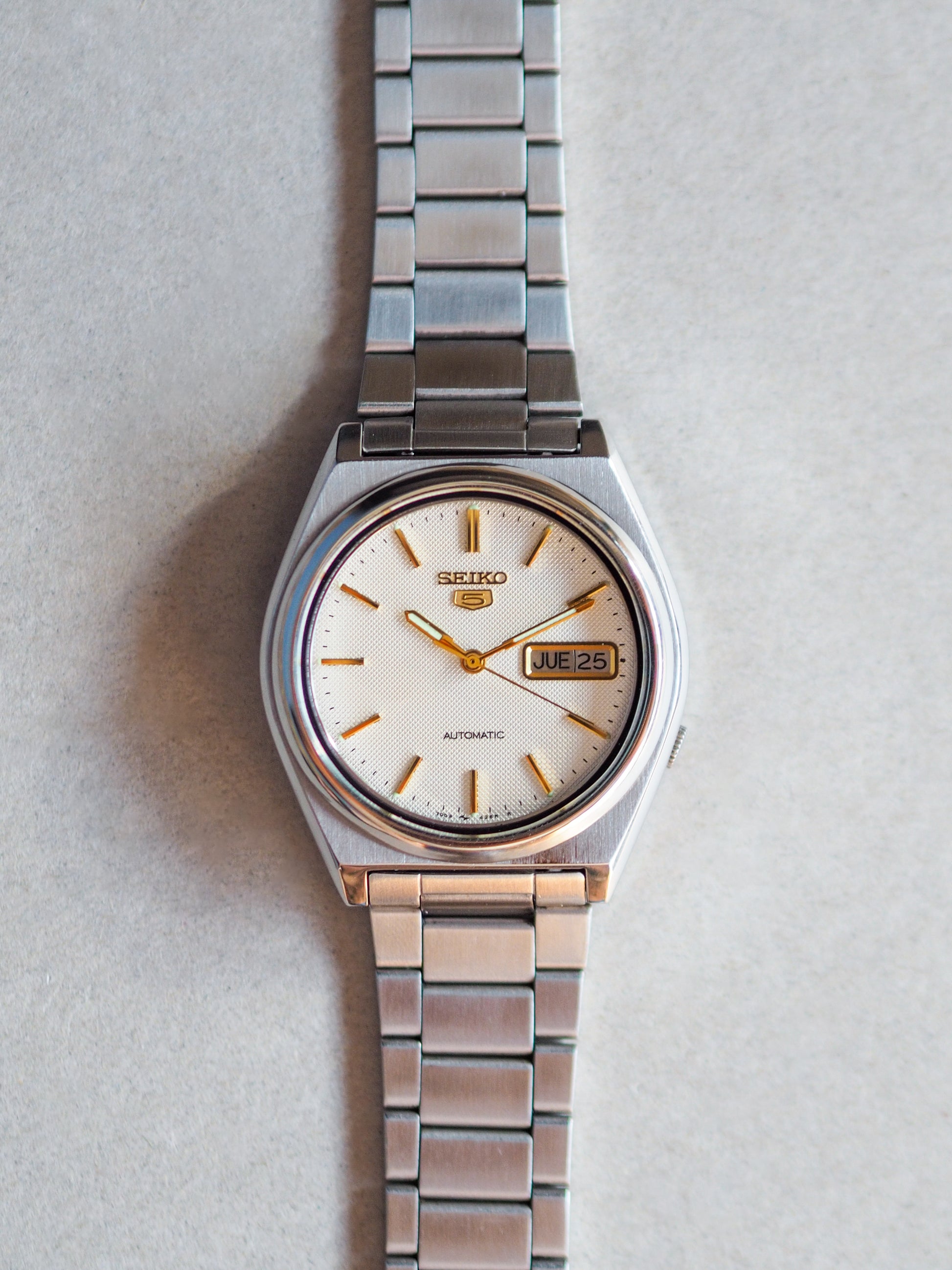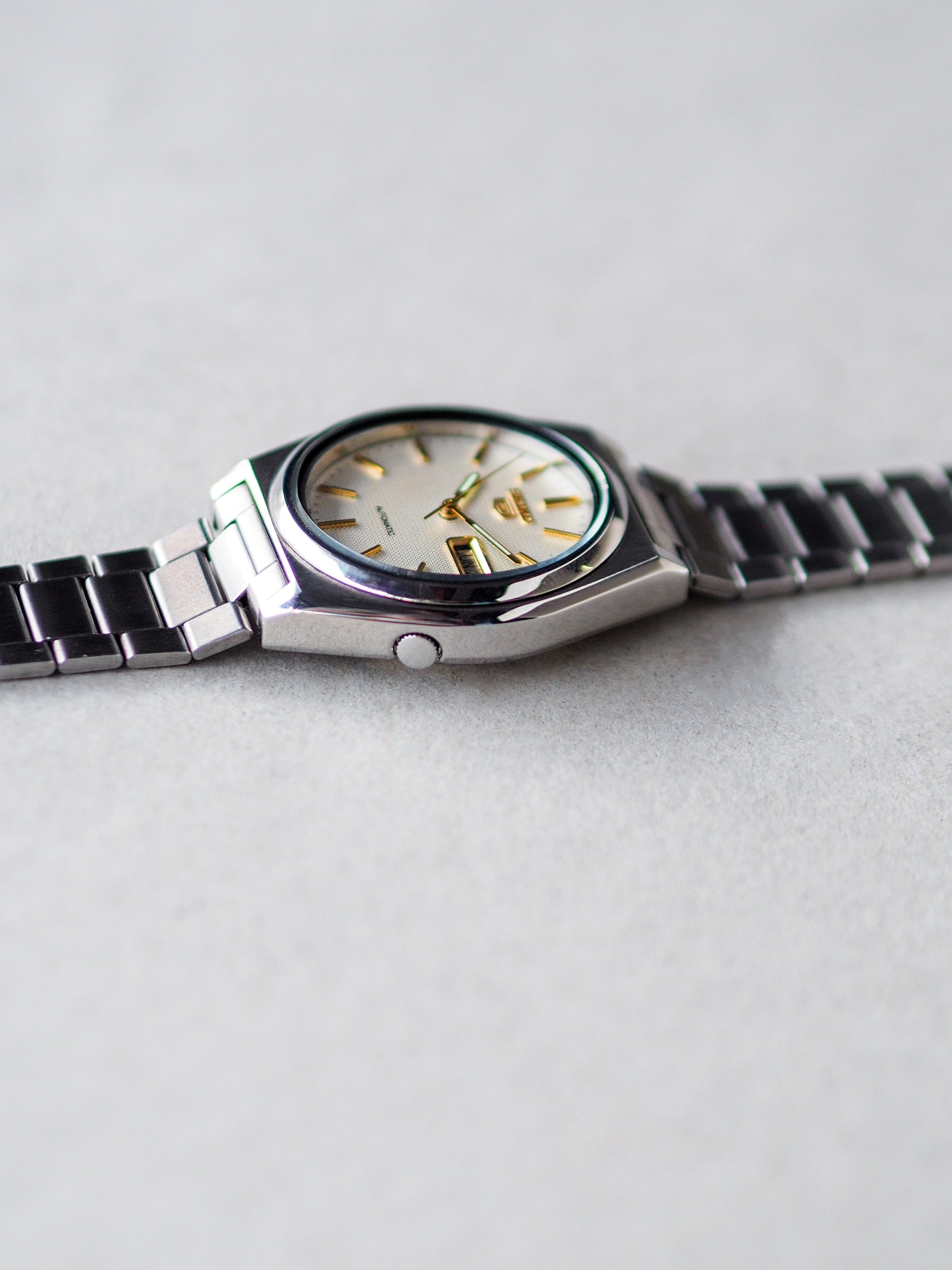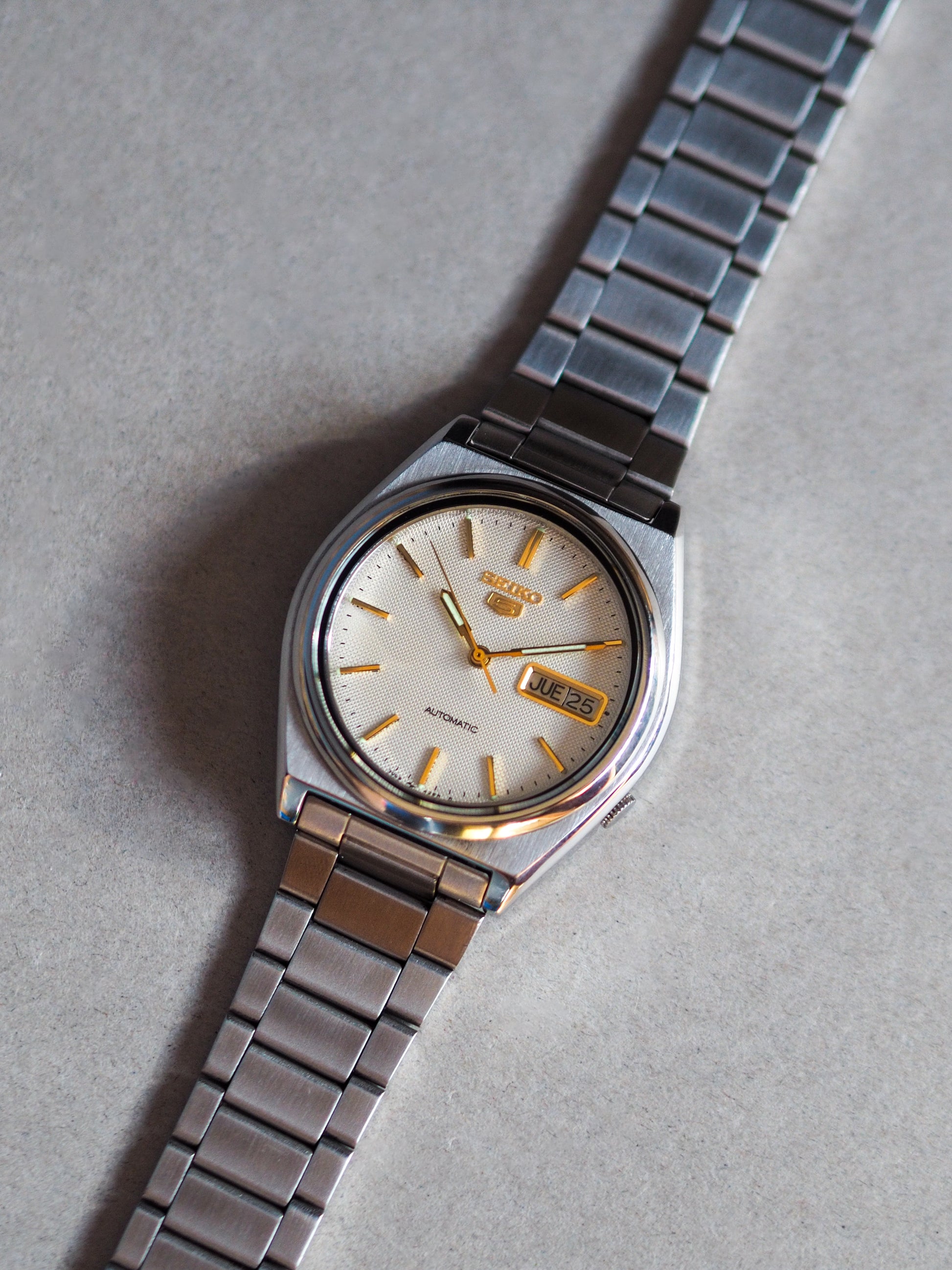 For sale is an early Seiko 5 ref. 7009-876A from 1982, powered by the reliable 7009 automatic movement. The watch presents a refined ivory hobnail-textured dial, accented with gold-tone indices, sword-style hands, applied logo, and a framed day/date window, giving it a sophisticated vintage charm. The round case with short, edgy lugs is paired with its original Seiko bracelet, fitting wrists up to approximately 17.5cm.
