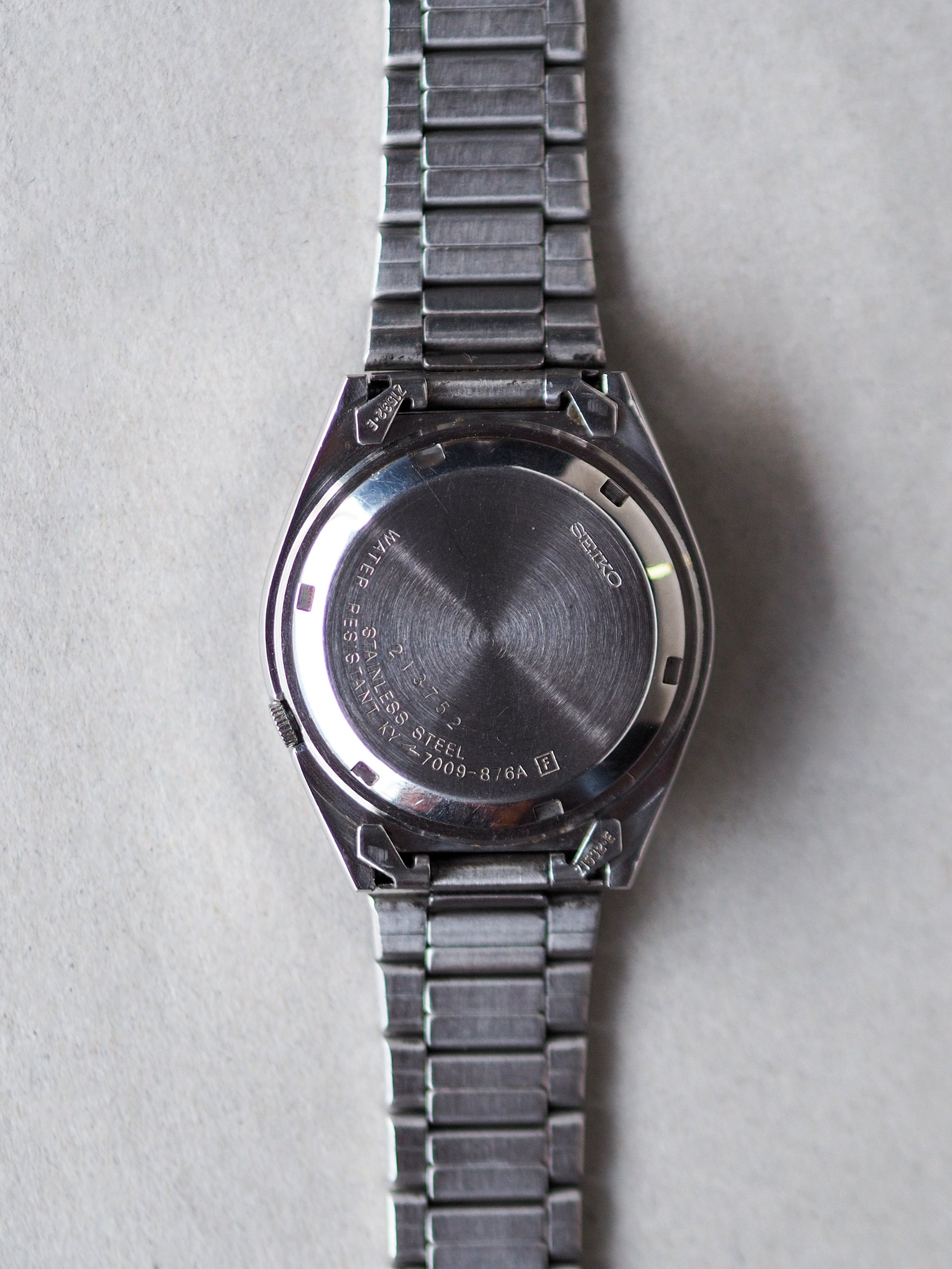 While the 7009 was positioned as a basic Seiko movement, it is regarded to have better build quality and materials than the later 7S26 found in most Seiko 5 models. Notably, it also features a bilingual English/Spanish day display with a quickset function operated by pushing the crown.