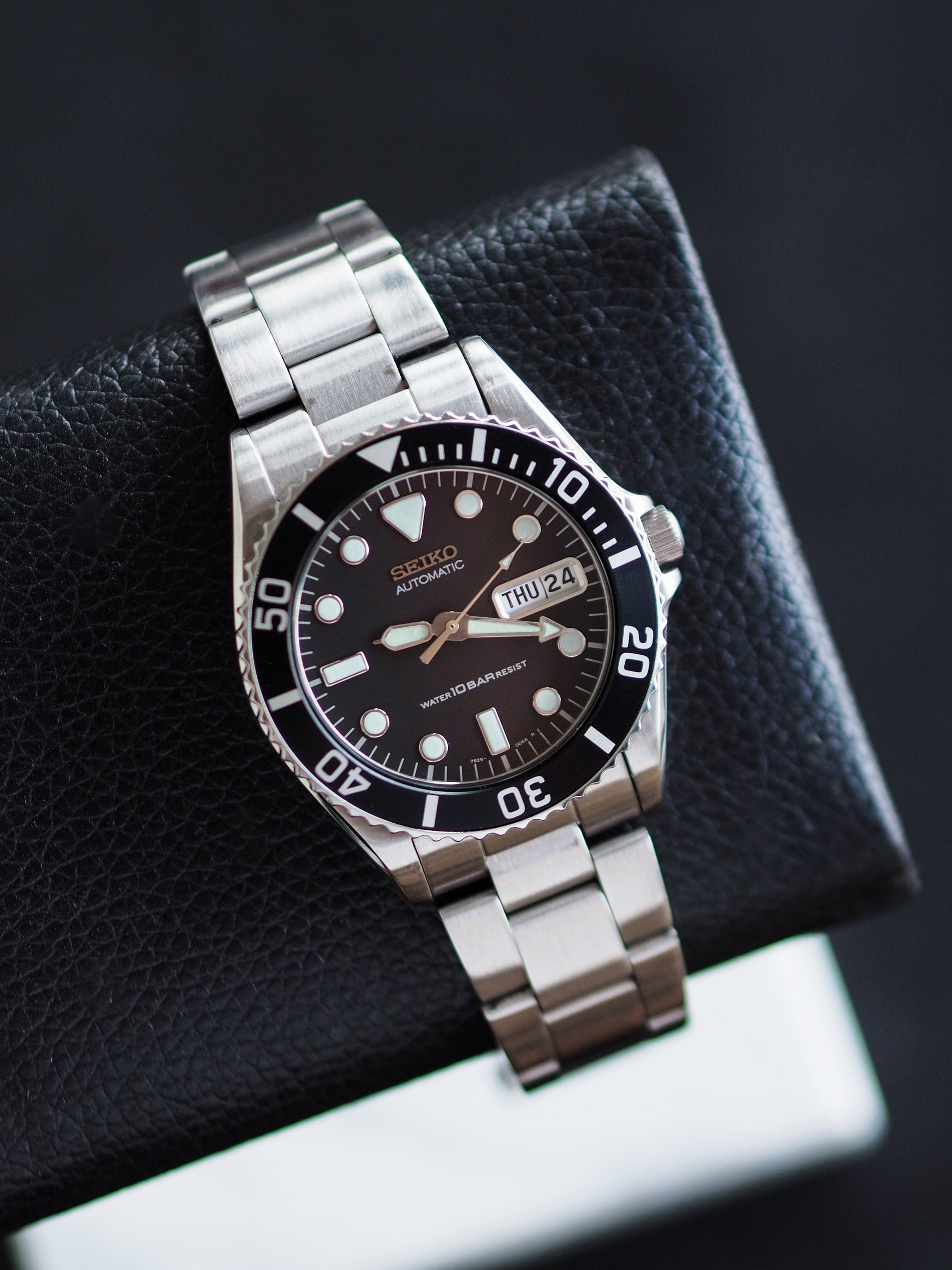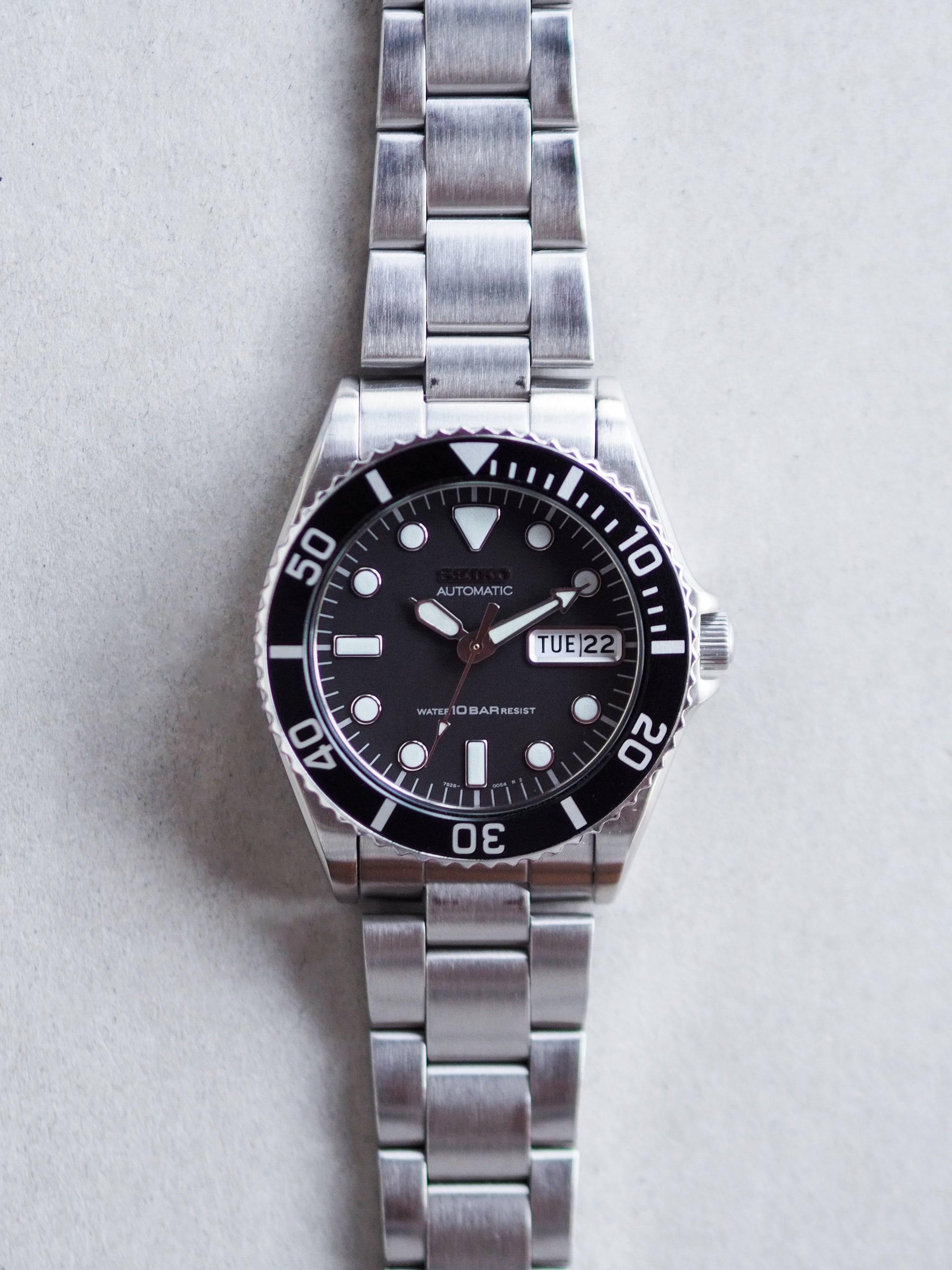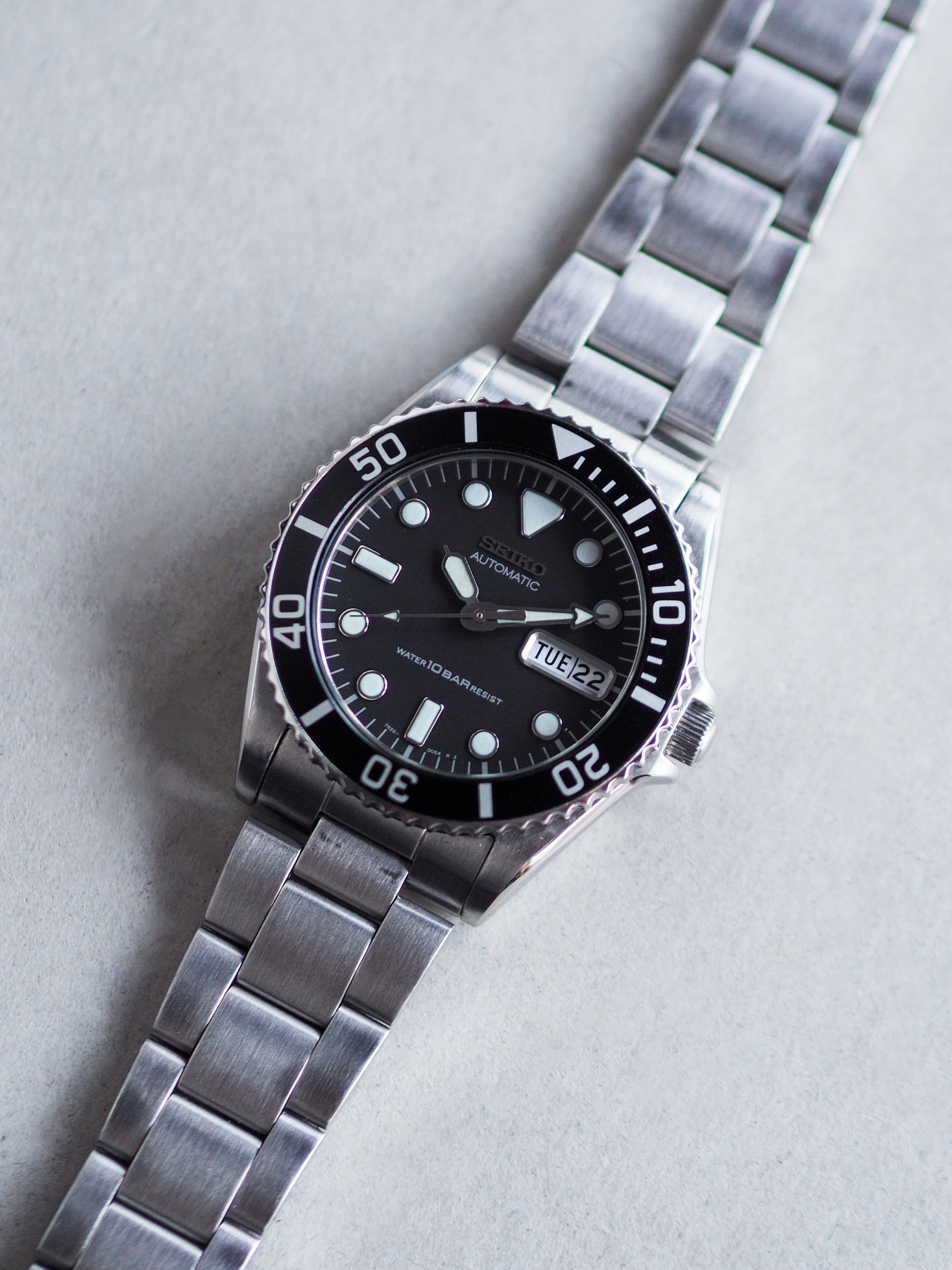 Inspired by classic Seiko dive watch aesthetics, the SKX023 features a black dial with bold luminous hands and hour markers for excellent readability, even in low-light conditions. A day-date display is positioned at 3 o’clock, adding everyday practicality.