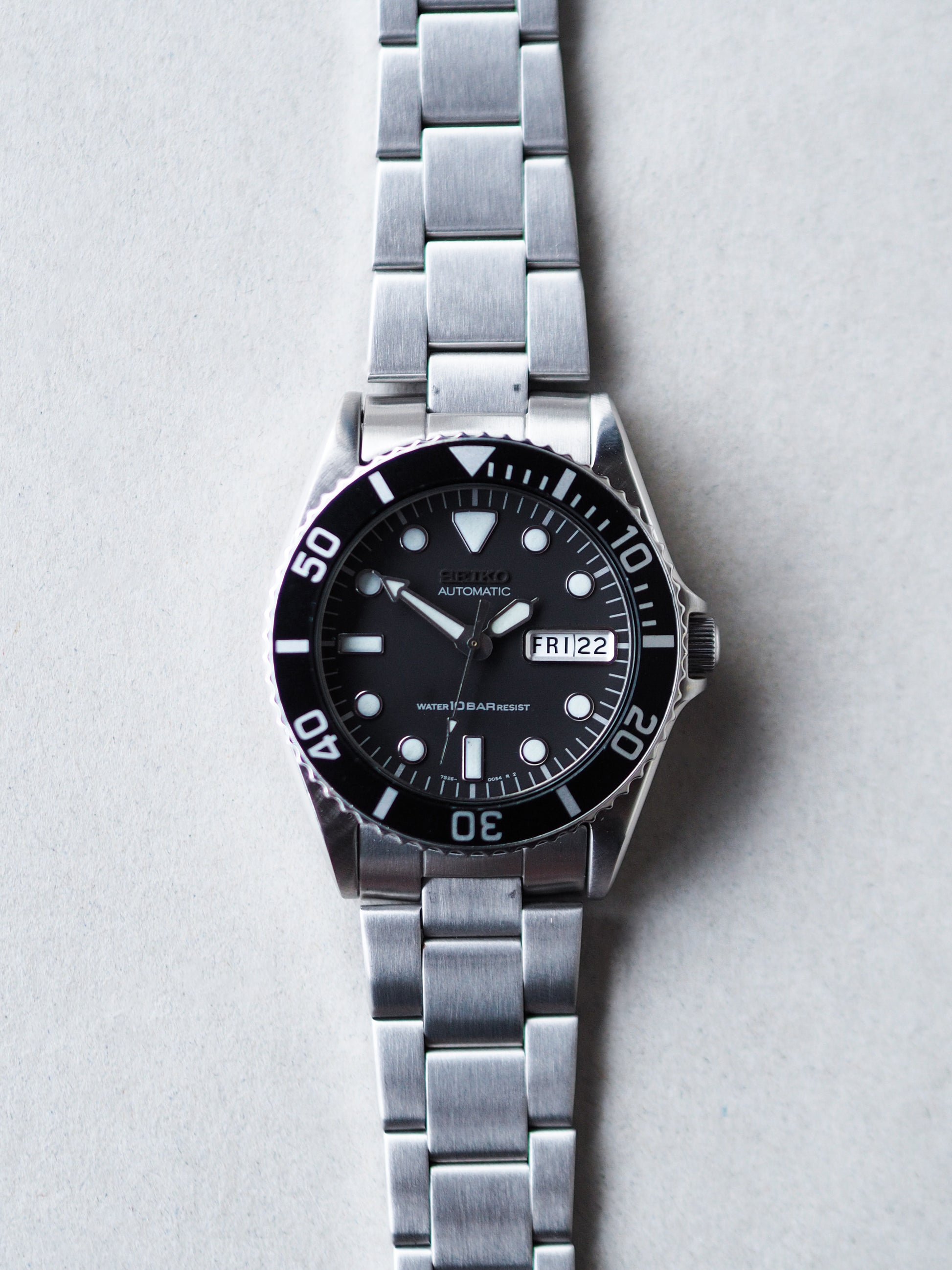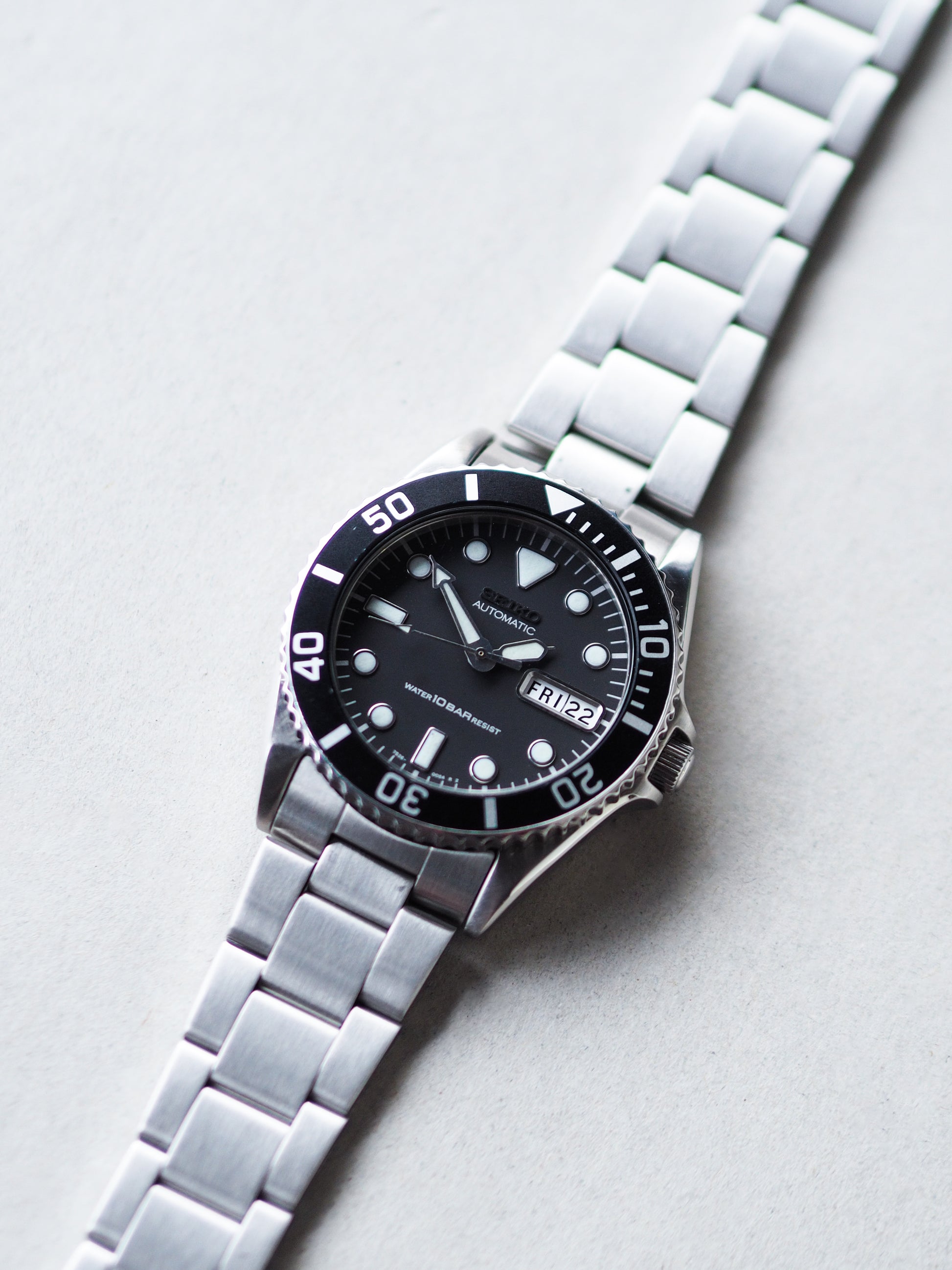 Inspired by classic Seiko dive watch aesthetics, the SKX023 features a black dial with bold luminous hands and hour markers for excellent readability, even in low-light conditions. A day-date display is positioned at 3 o’clock, adding everyday practicality.