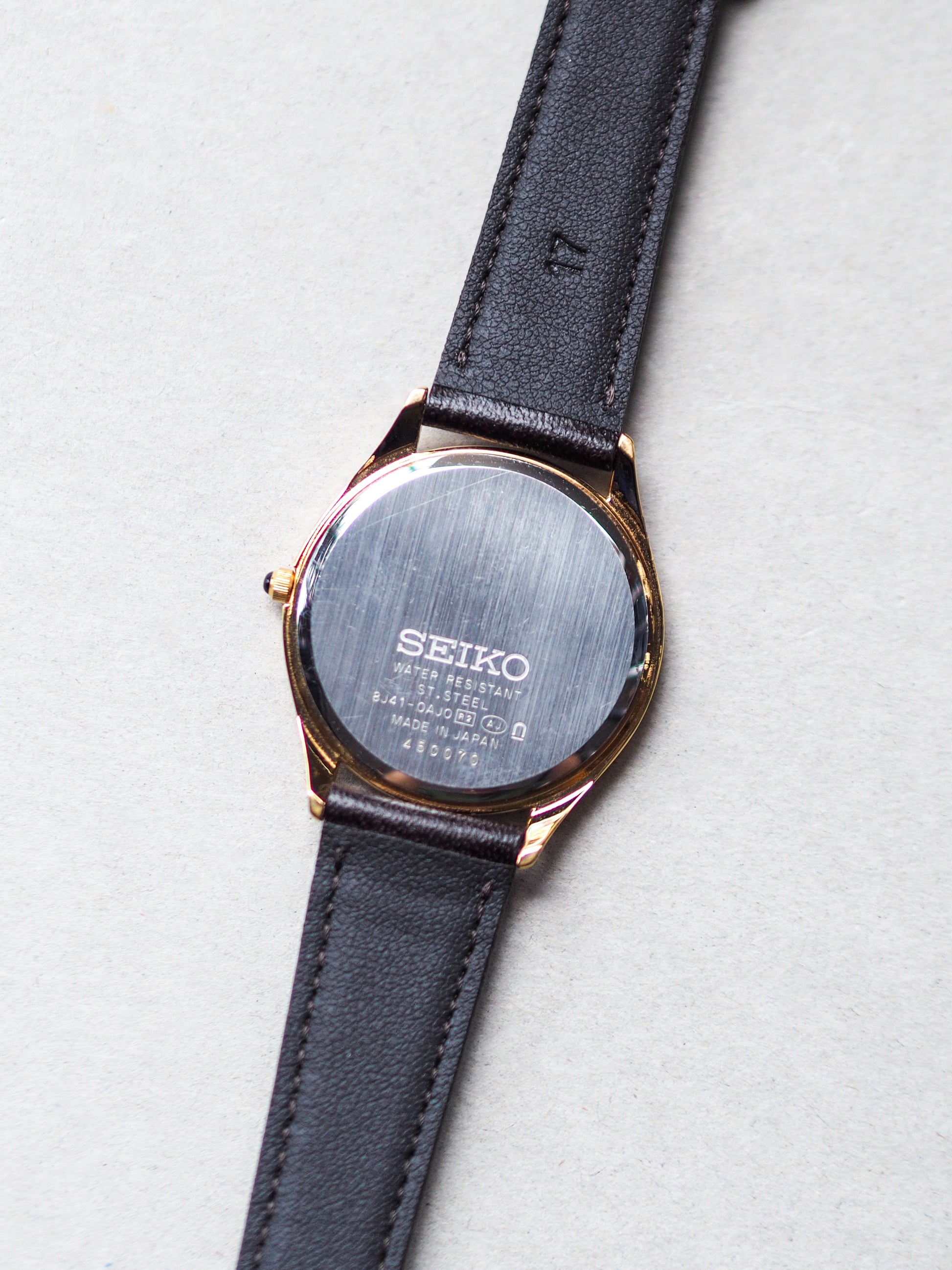 The Seiko 8J41-0AJ0 represents an affordable hidden gem within the realm of HAQ quartz movements. With its classic dressy design and gorgeous dial, this watch is in mint condition paired with its original Seiko buckle and a replaced leather strap, complete with its original box, exhibiting no visible signs of wear. It is a collectible and classy dress watch that promises accurate timekeeping for many years to come.