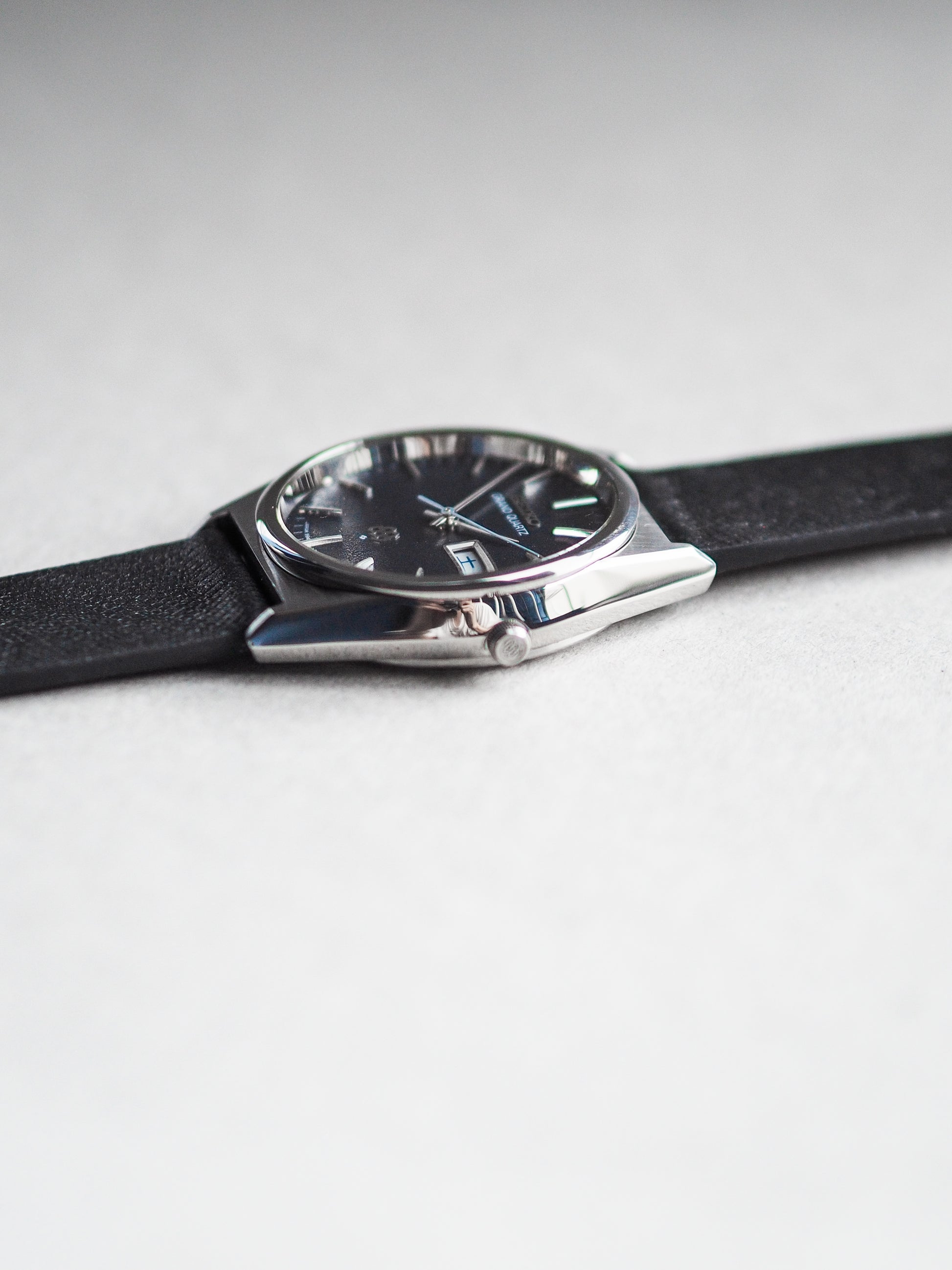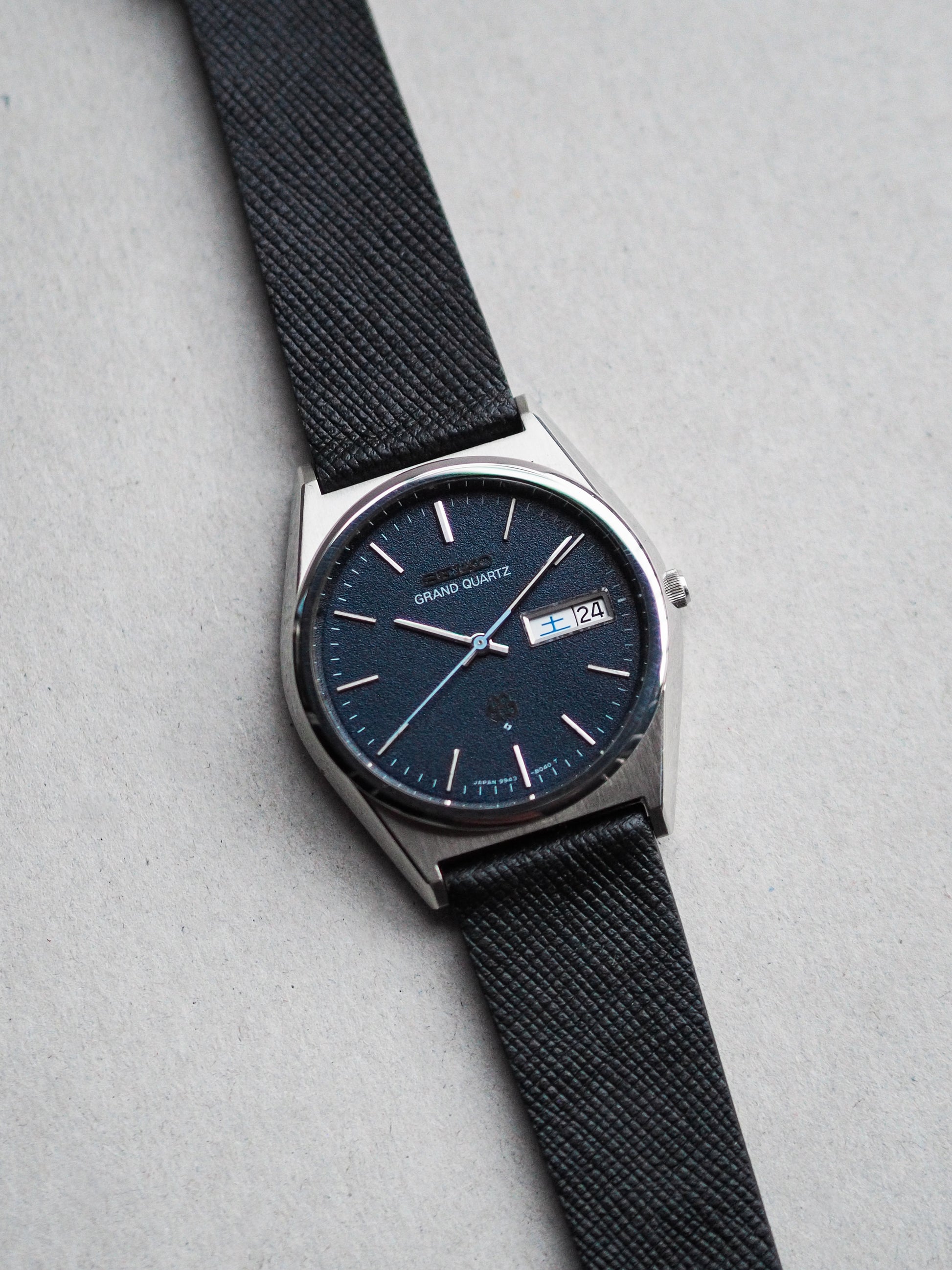 The highlight of this Grand Quartz is its captivating blue sand-textured dial, a striking and rare design that creates a sense of depth and elegance. The dial features a clean minute track, understated stick indices, and hands, with a unique blue-hued seconds hand that perfectly complements the dial's tone.