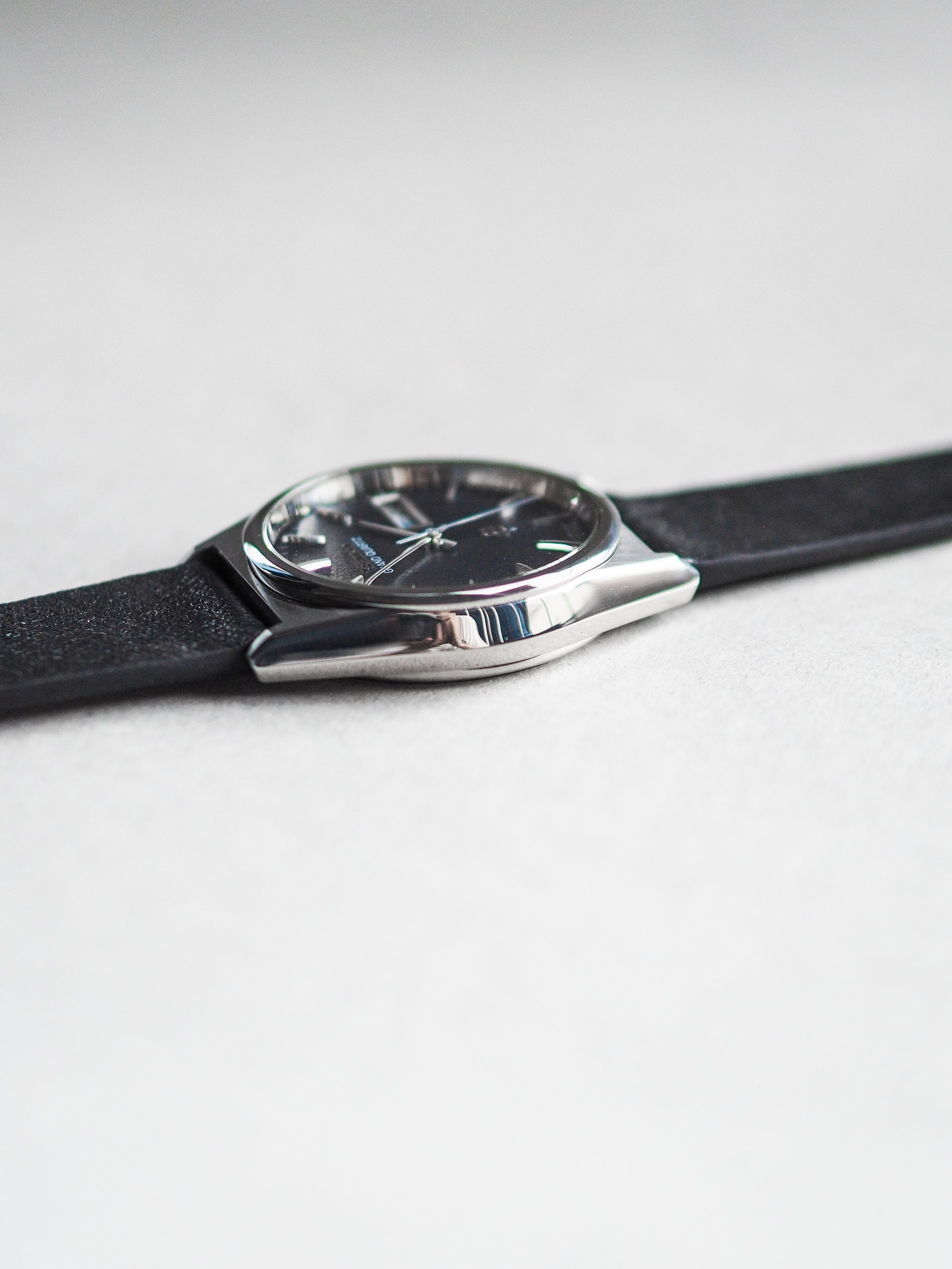 This watch is in excellent condition, showcasing an all-original head with minimal signs of wear. The dial, crystal, and case are pristine, maintaining the watch's timeless appeal. Paired with a black leather strap, it offers a sophisticated and classic look, ideal for both casual and formal occasions.
