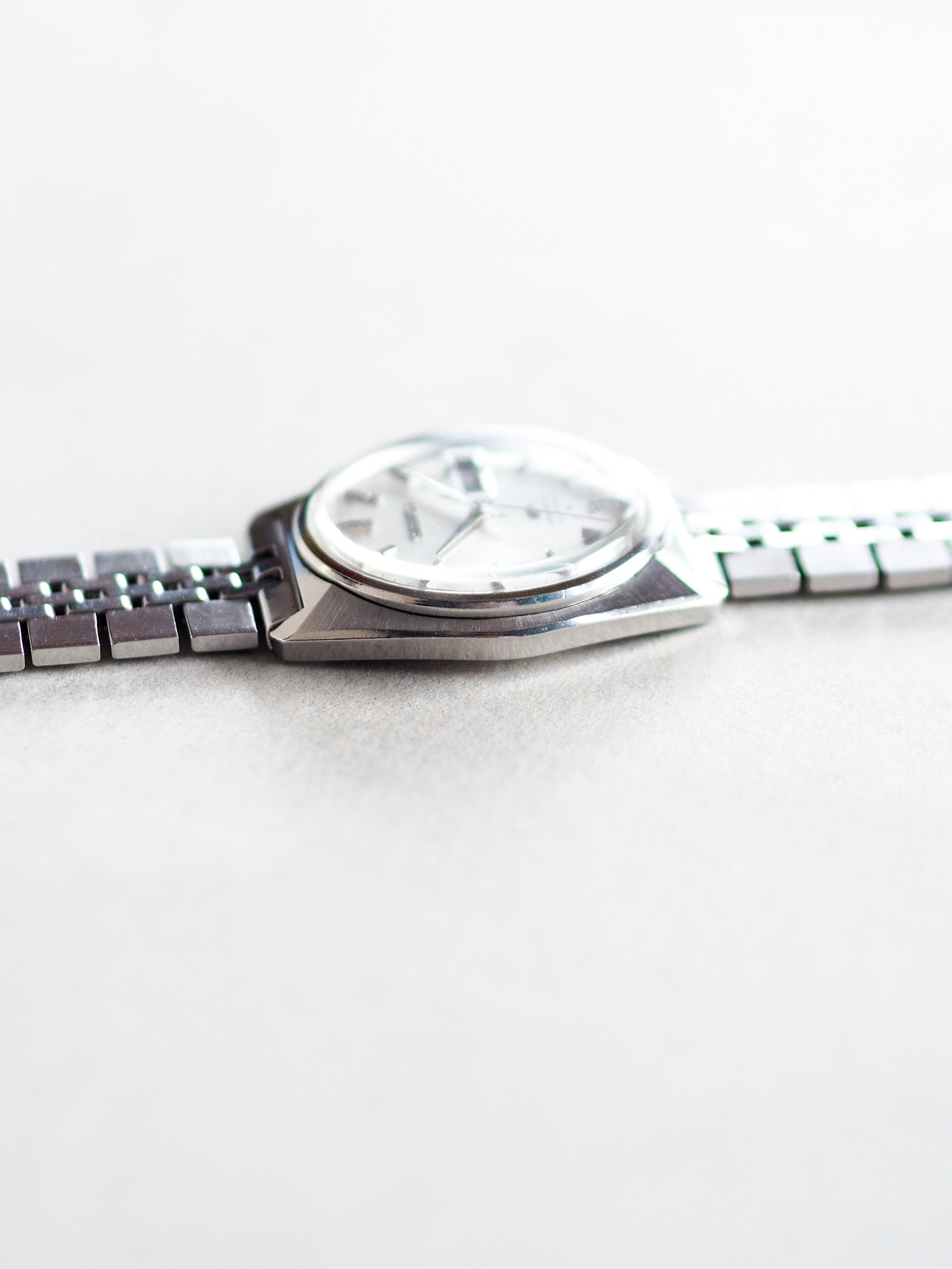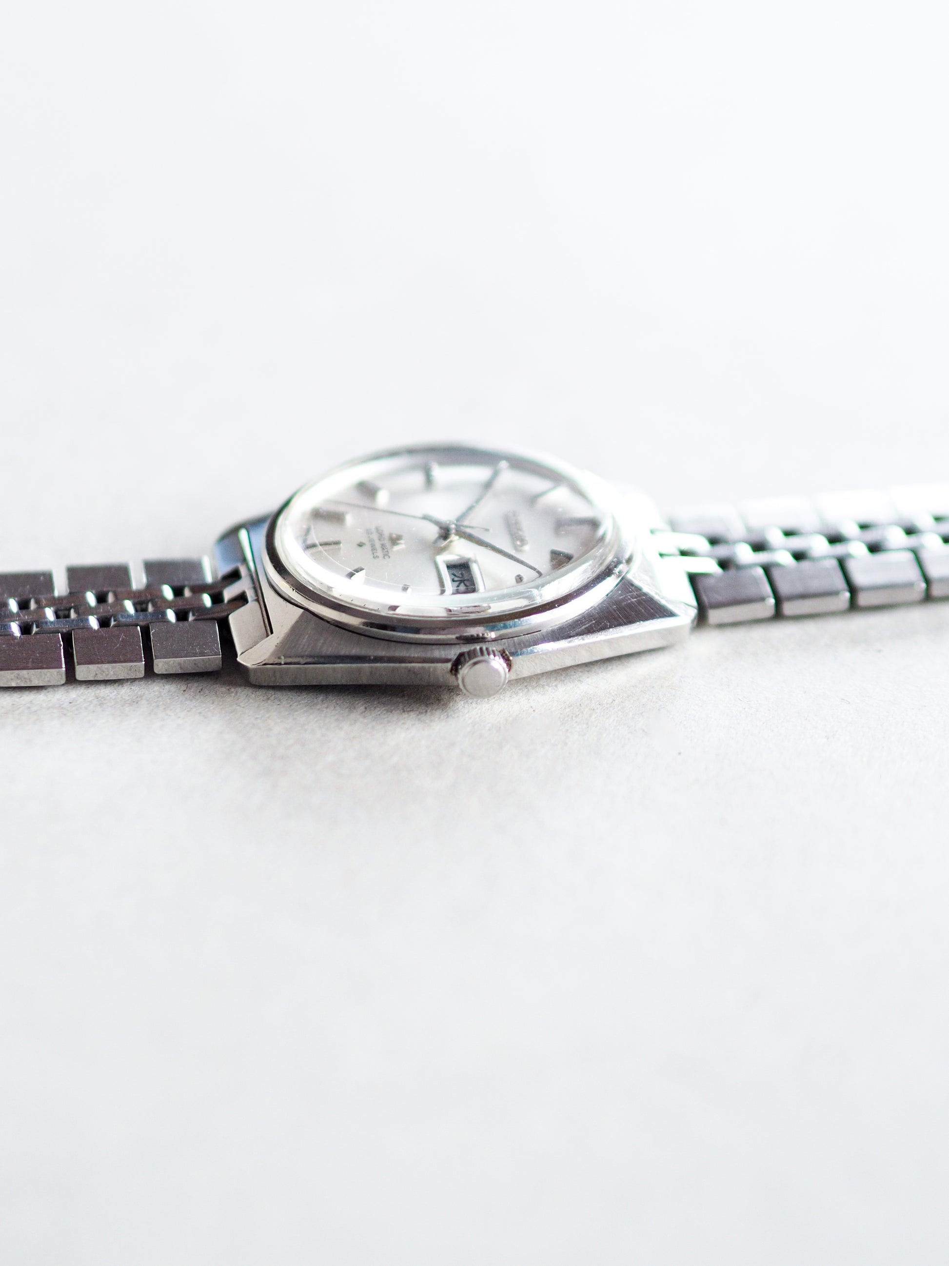 The 5606 movement, first produced around 1968, became the foundation for early 1970s King Seiko and Grand Seiko models. It features automatic and manual winding, a beat rate of 21,600 bph, and a day-date quickset function. As a JDM model, it includes a bilingual day display in Kanji and English.