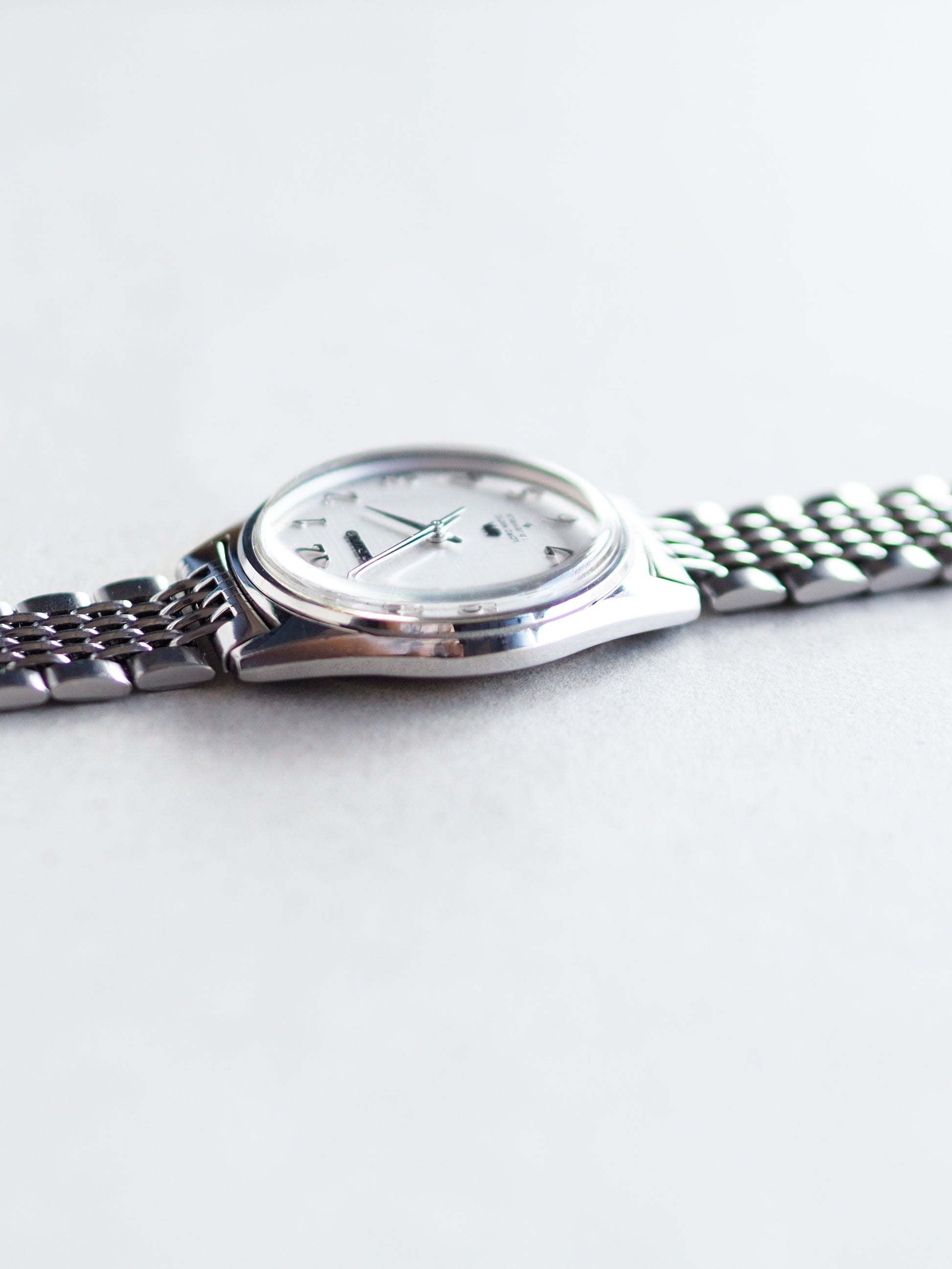 The dial of this 5601-9000 is similar to the famous Lord Marvel Hi-beat design. It features a silver linen pattern dial with Breguet indices and sword-style hands with black lines.