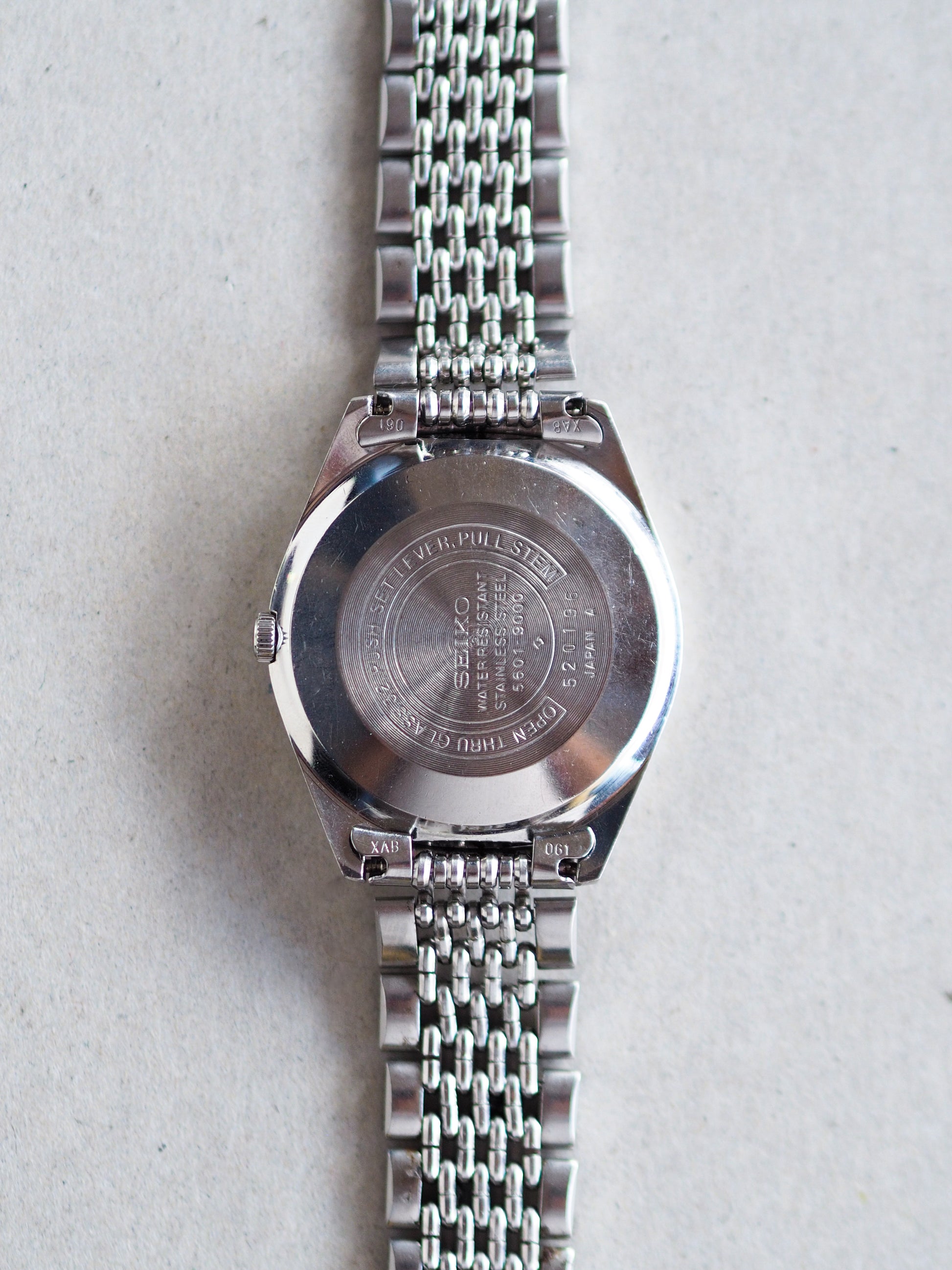 The Seiko 5601-9000 is one of the rare models in the popular Seiko Lord Matic lineup, notable for its dial without a day-date window. Produced in 1976, this specific Lord Matic uses the 5601 movement, designed without the day-date function, offering a symmetrical and balanced look.