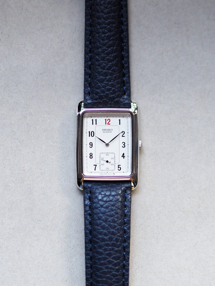 Presenting the Seiko 2G28-5010, a sought-after vintage tank-style timepiece from 1984. This watch features a timeless design with classic numeral indices on a white dial, with a unique detail—the 12-hour marker standing out in red. The sub-seconds dial is positioned above the 6 o’clock marker, enhancing its vintage appeal.