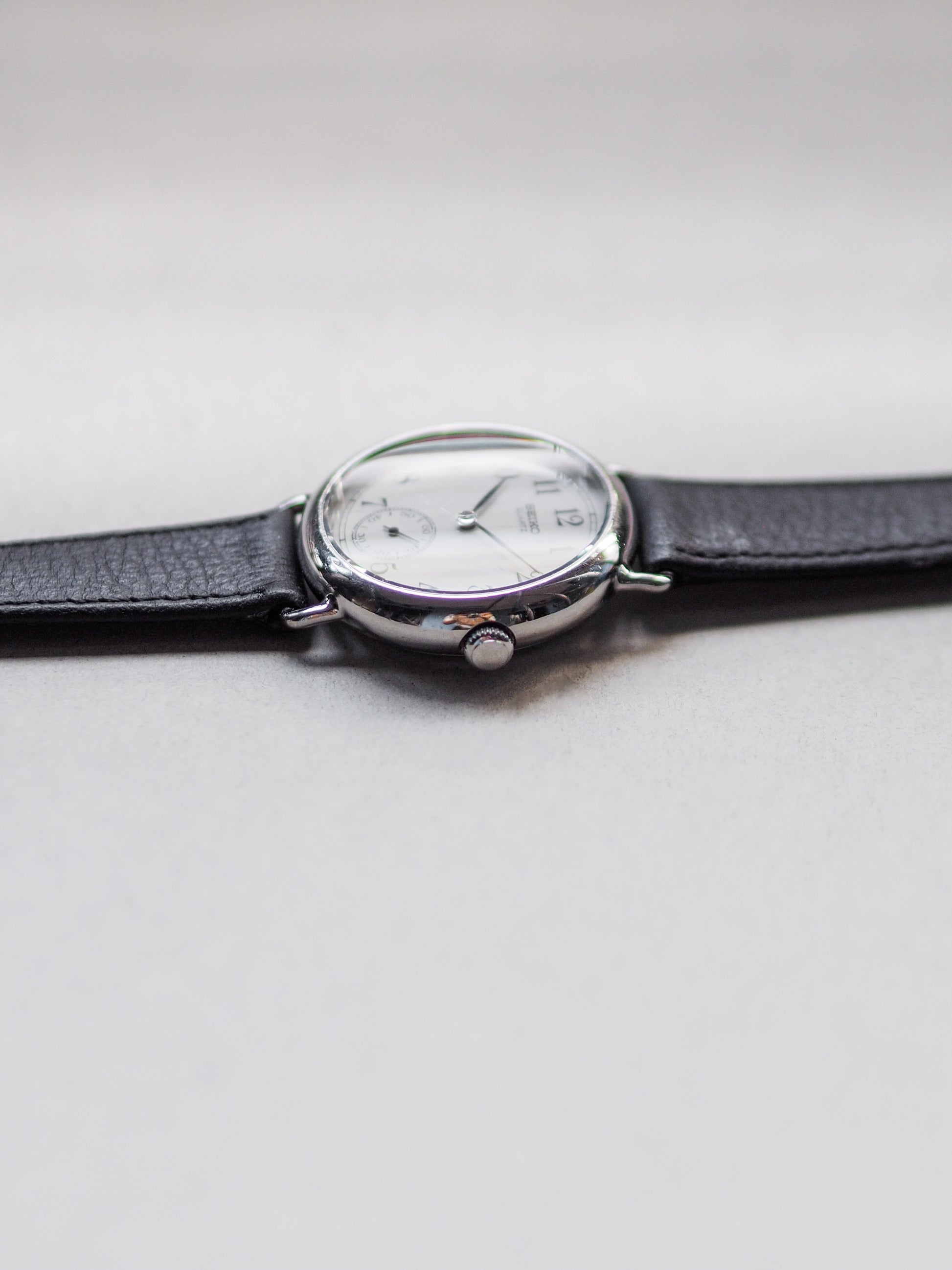 Powered by the 2G28 movement, crafted in the 1980s, this watch was specifically designed to accommodate the sub-seconds dial configuration, enhancing its vintage appeal. The round case shape, combined with classic hinged lugs, gives the watch a timeless, elegant look. The enamel-like white dial is adorned with numeric indices and a rail track minute marker, perfectly complemented by delicate leaf-style hands. The sub-seconds window above 6 o'clock adds an extra touch of sophistication to the design.