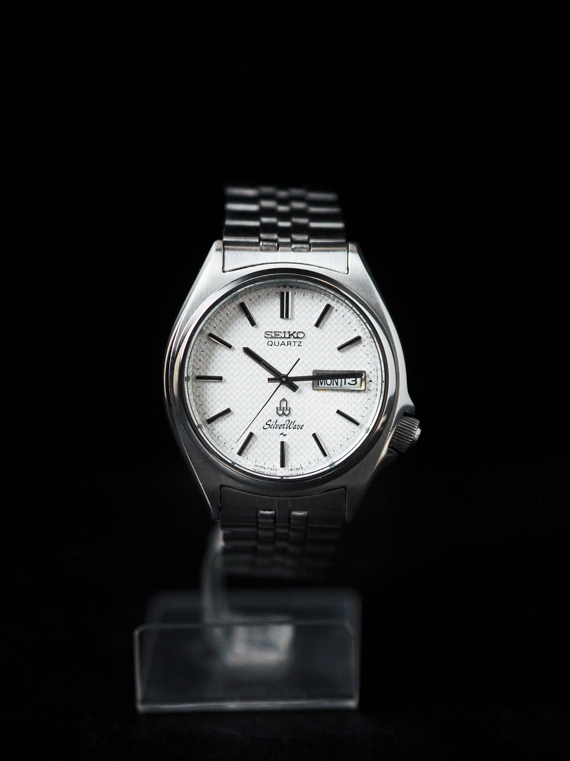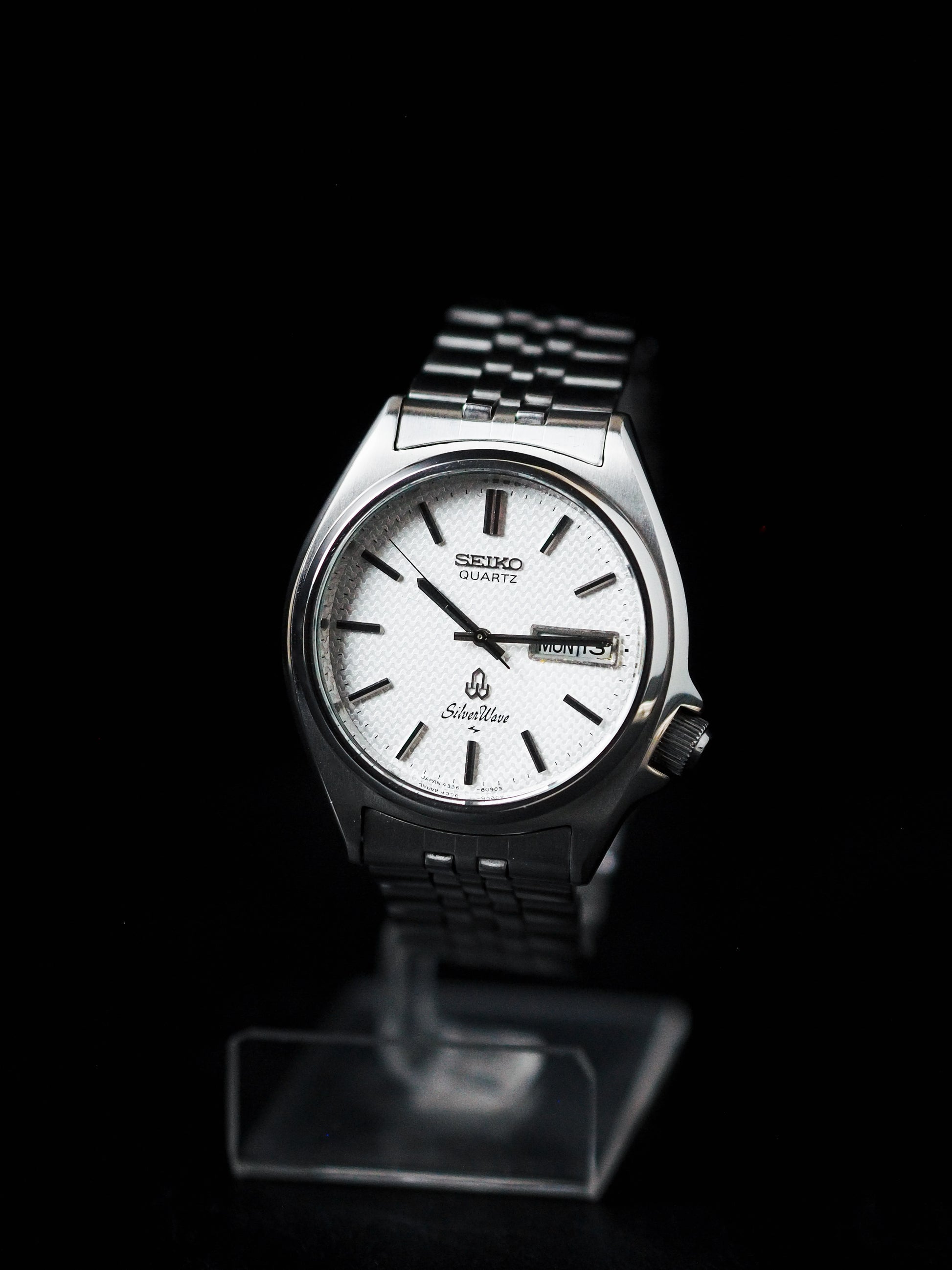 The Silverwave Quartz stands out as one of Seiko's early water-resistant watches, sporting its iconic tsunami wave logo on the case back. It features a screw-down crown, usually positioned at 3 or 4 o'clock, along with a crown guard and a screw-in case back for added protection.