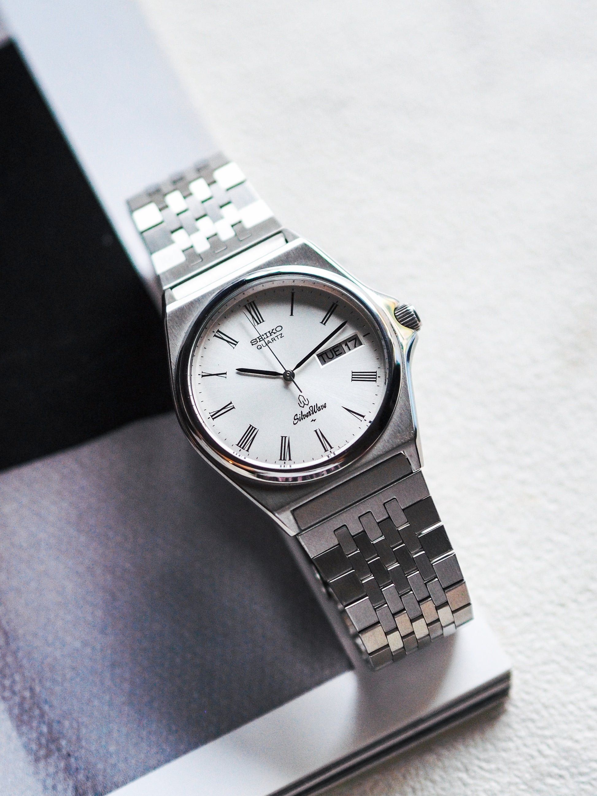 This Seiko 5933-7020, produced in 1981, features a design typical of the Silverwave lineup with a stainless steel case and silver sunburst dial. However, it stands out with more attractive Roman numeral indices instead of the usual stick indices and a two-tone day-date window.