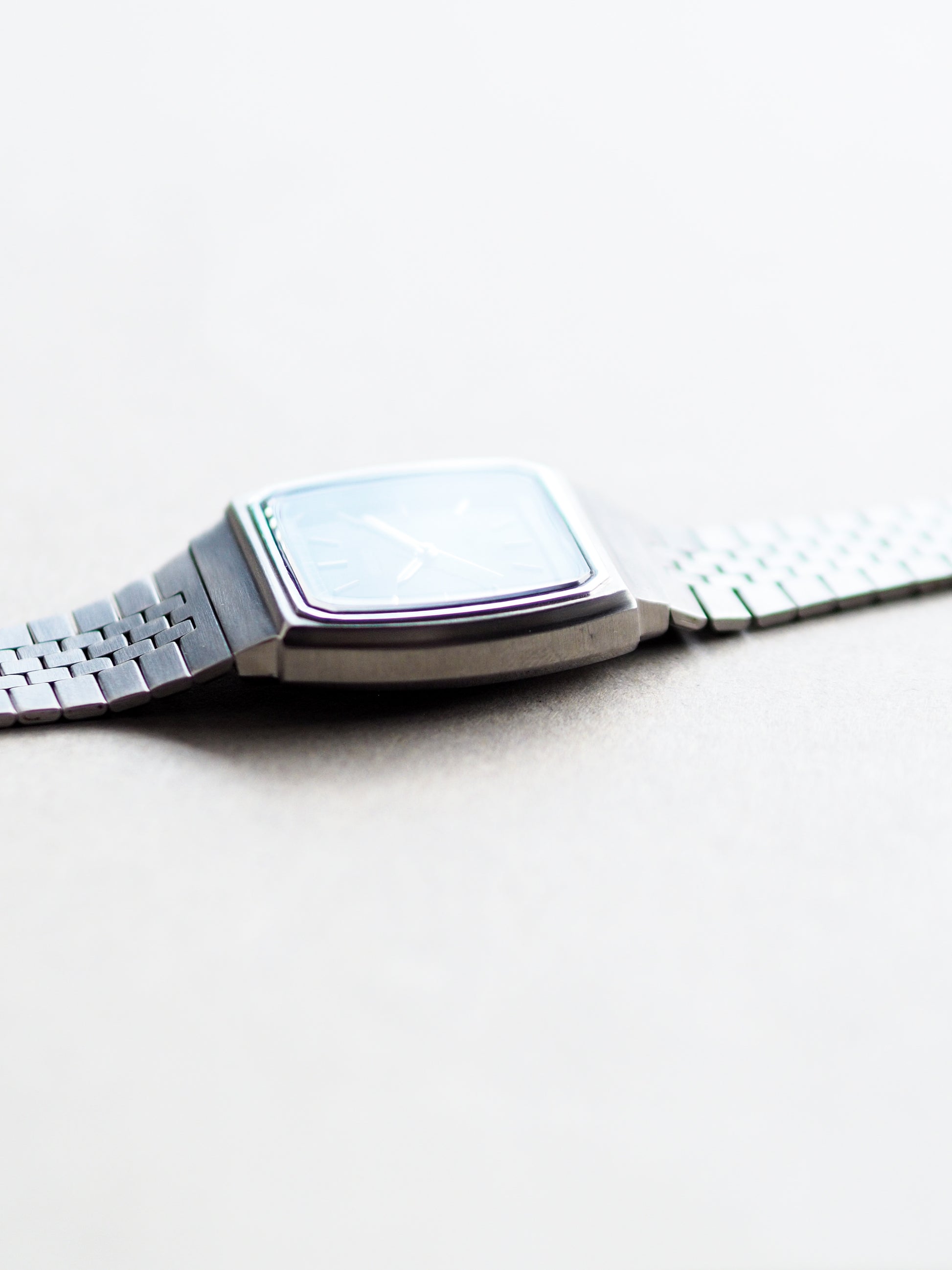 The Seiko 6030-5140 is a distinctive vintage model from the 1980s that captures the retro charm of the era through its unique TV-shaped case design. It features a striking black dial with a subtle metallic blue hue, giving it depth and elegance under different lighting. The absence of a date or day window lends the dial a perfectly balanced and symmetrical look, while the black inner minute track adds a subtle contrast and frames the dial neatly.