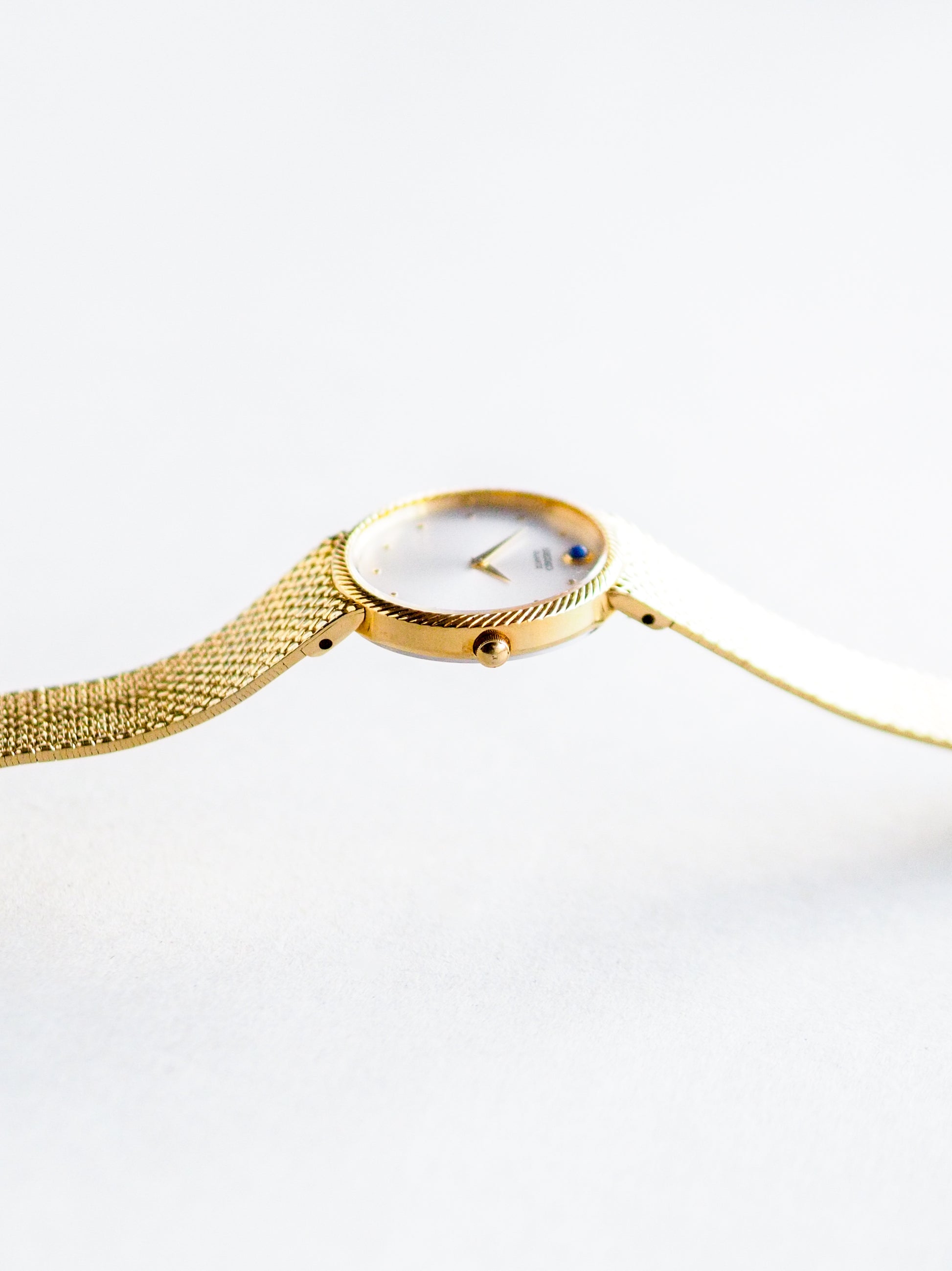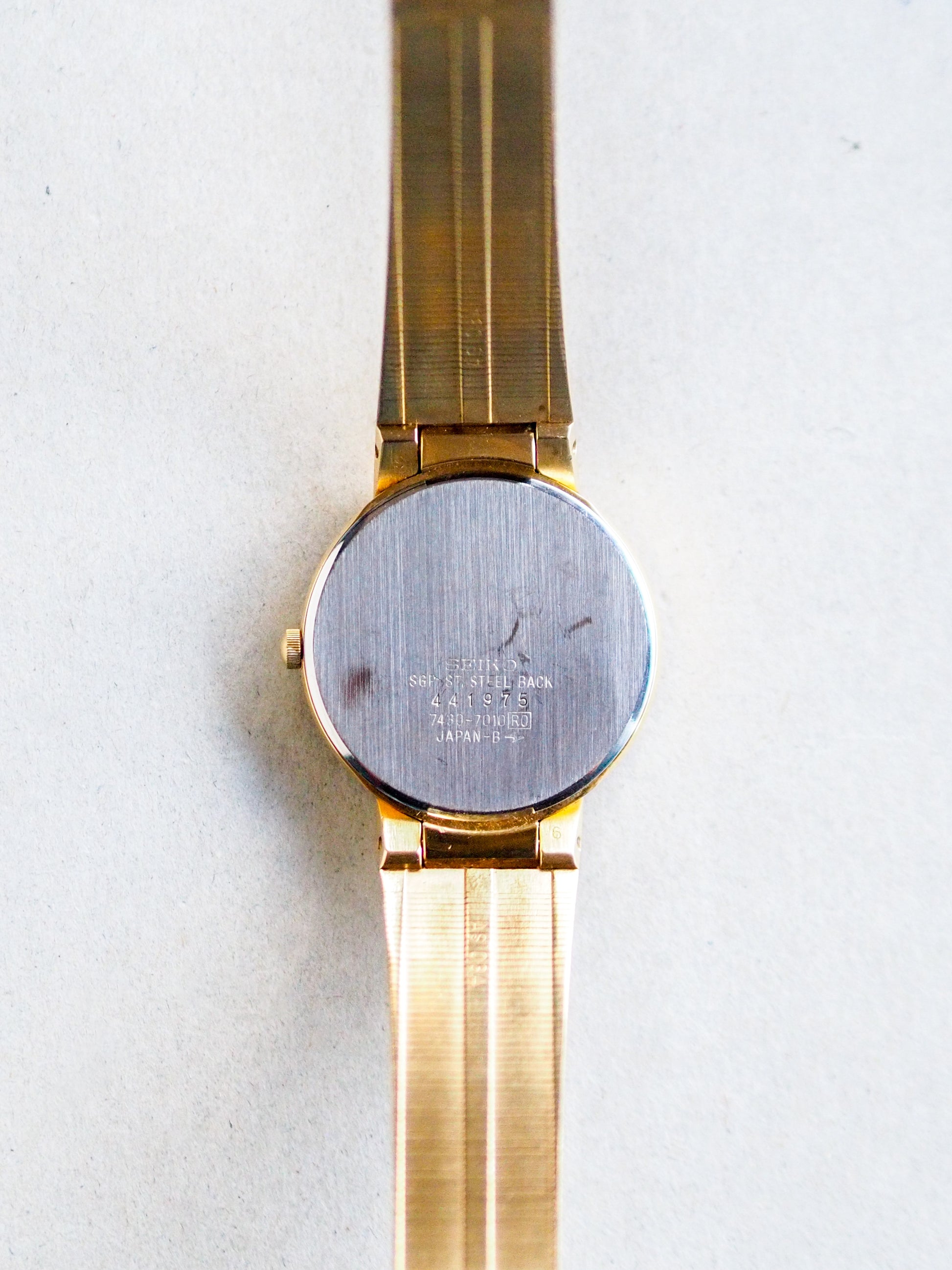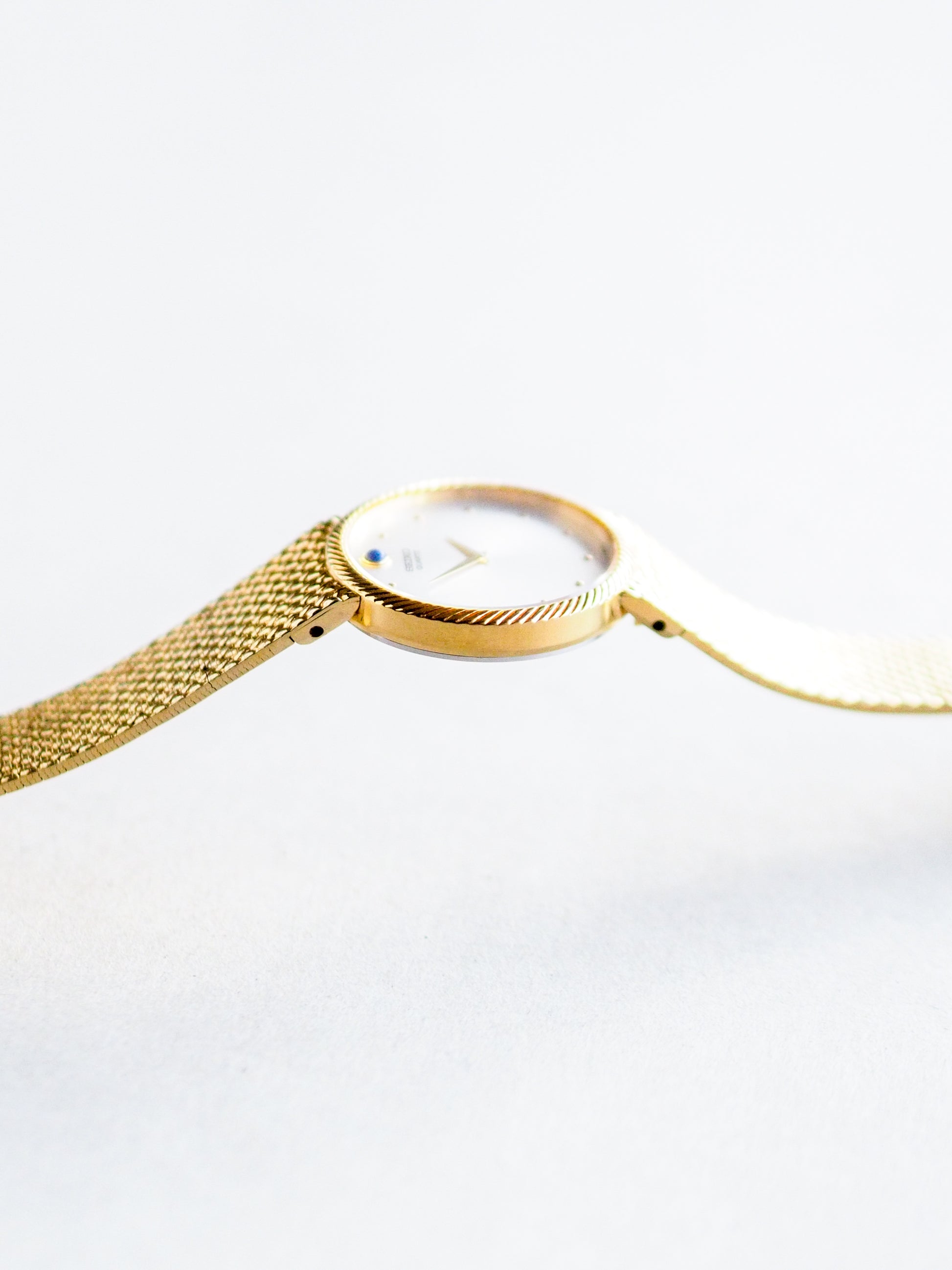 The Seiko 7430-7010 is a charming vintage dress watch from 1984, offering a refined and elegant look. It features an all SGP (Seiko Gold Plated) case and integrated bracelet, a fluted bezel, and a white textured dial with a soft sunburst effect. The minimalist two-hand layout, gold dot indices, and a blue stone set at the 12 o’clock marker add a unique and classy touch.