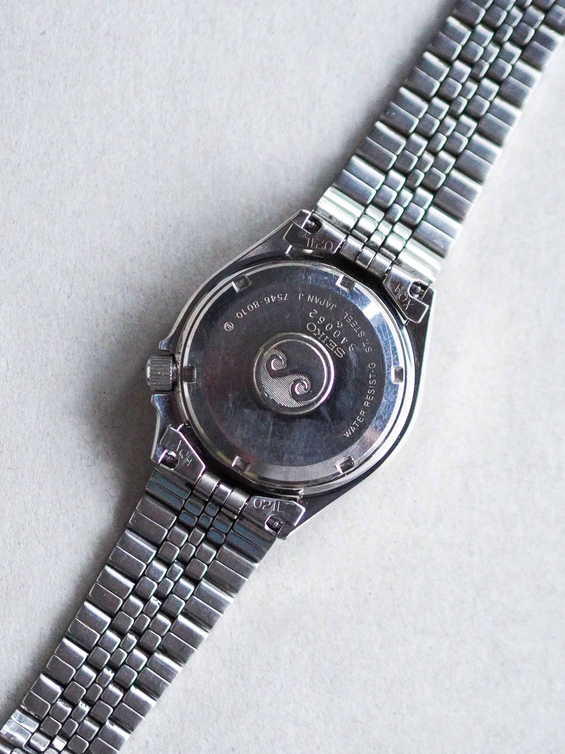 The Silverwave Quartz stands out as one of Seiko's early ventures into water-resistant quartz watches, distinguished by the iconic tsunami wave logo engraved on its screw-in case back. True to its tool-watch heritage, it features a screw-down crown—typically located at the 3 or 4 o'clock position—along with crown guards and solid construction for added durability.