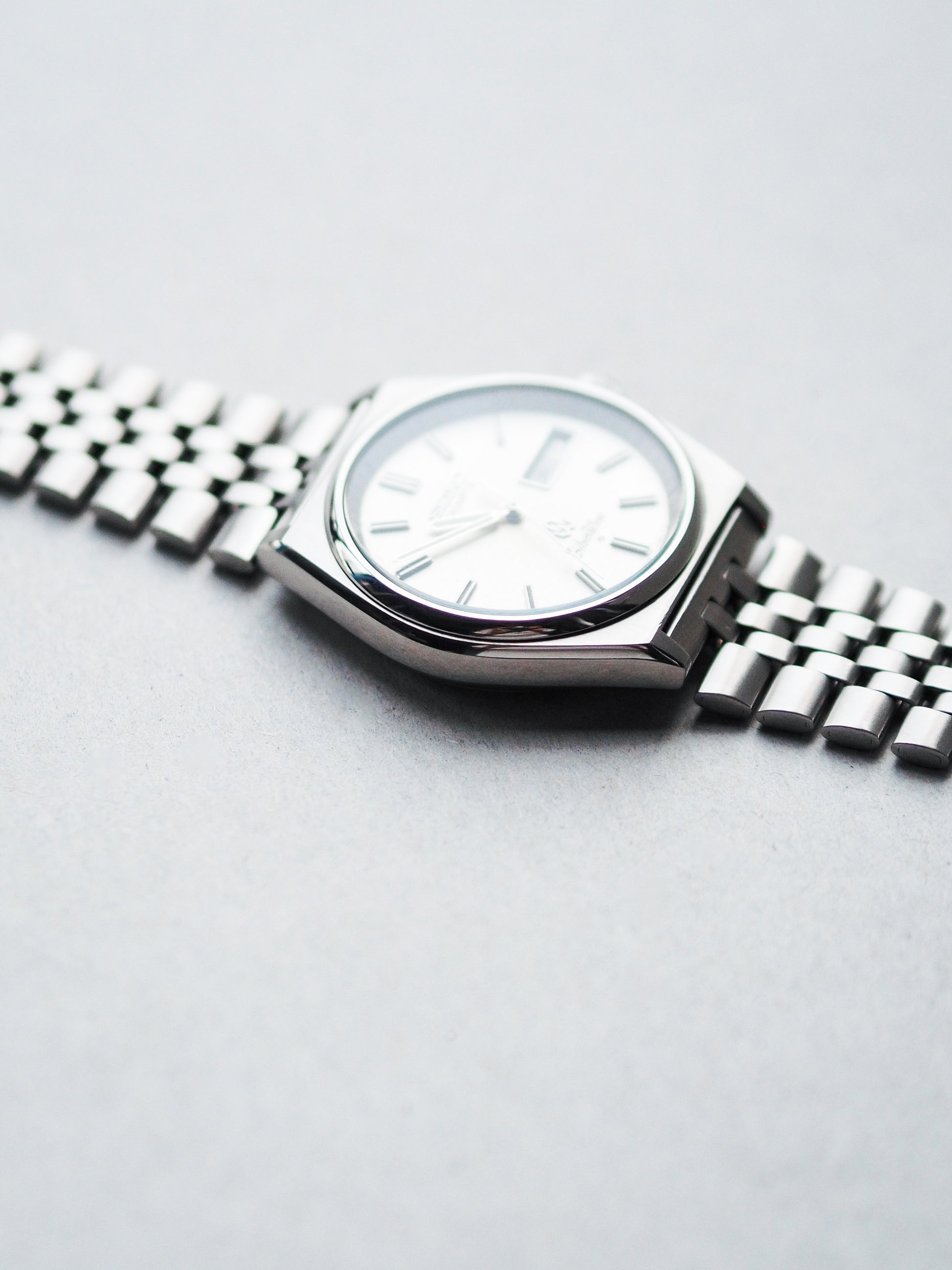 The Seiko Silverwave Quartz is one of the early models in Seiko’s water-resistant line, featuring the distinctive tsunami wave logo on the case back. It includes a screw-down crown at the 3 o’clock position with a crown guard, along with a screw-in case back for added durability.