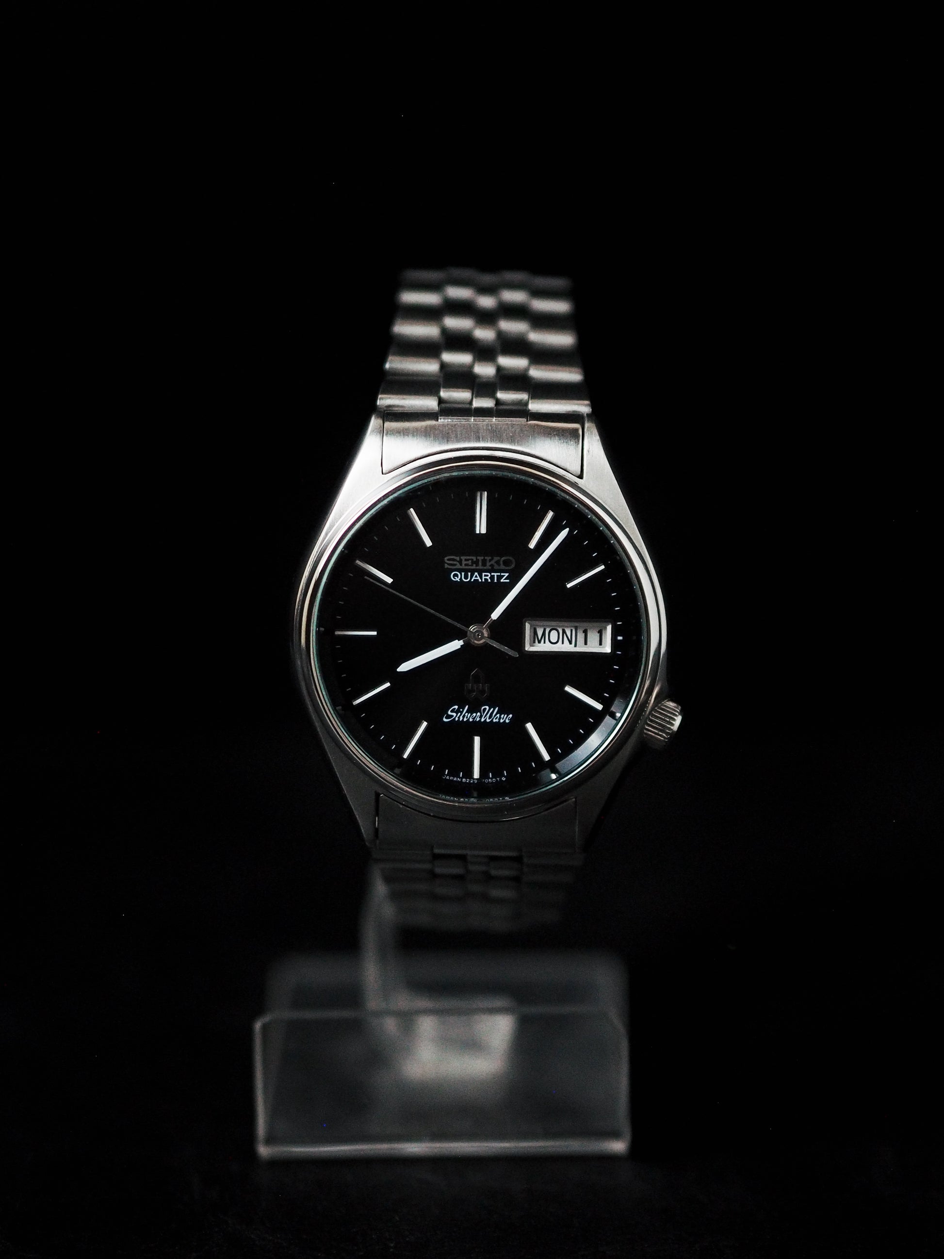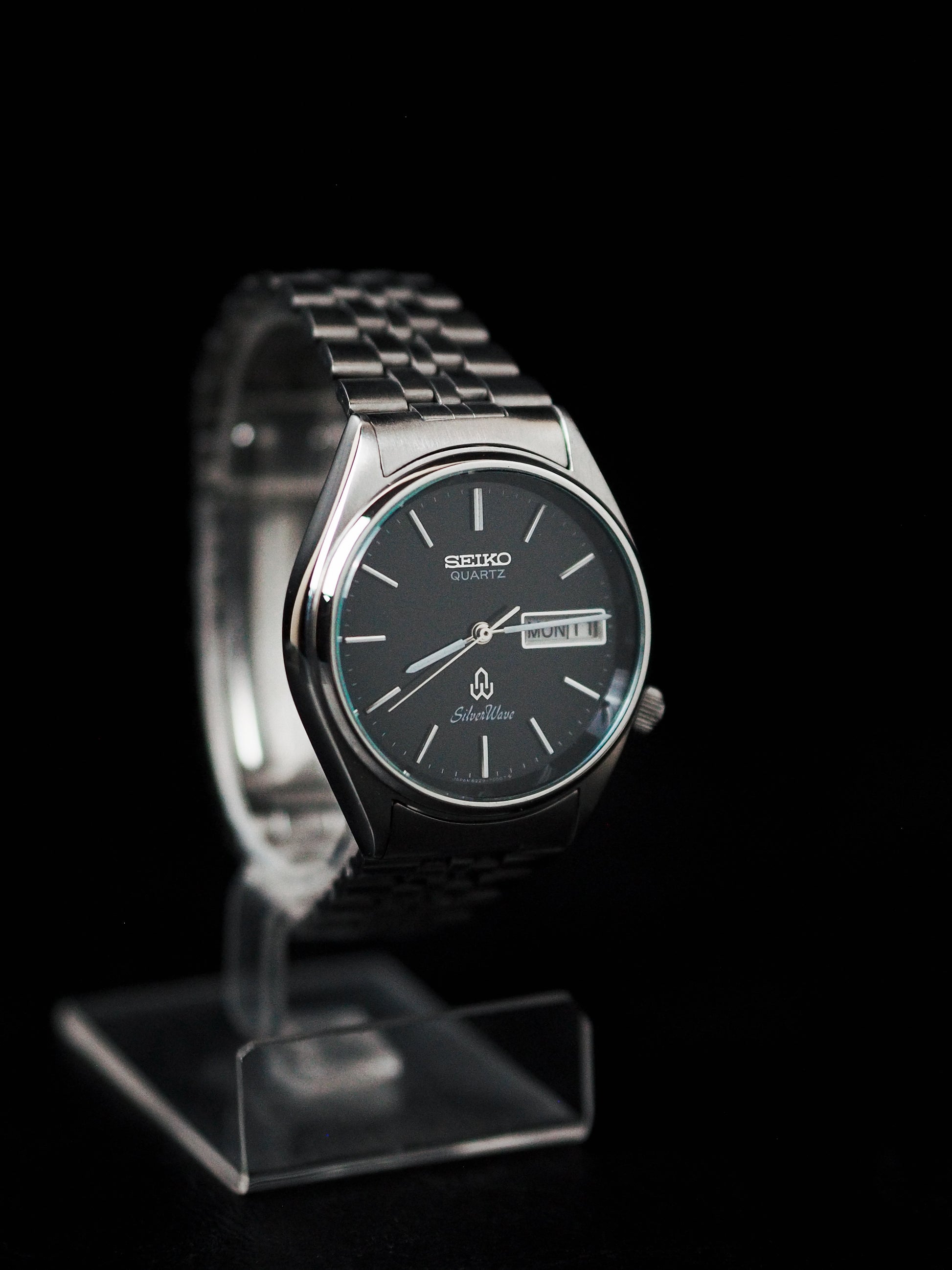 The Silverwave Quartz stands out as one of Seiko's early water-resistant watches, sporting its iconic tsunami wave logo on the case back. It features a screw-down crown, usually positioned at 3 or 4 o'clock, along with a crown guard and a screw-in case back for added protection.