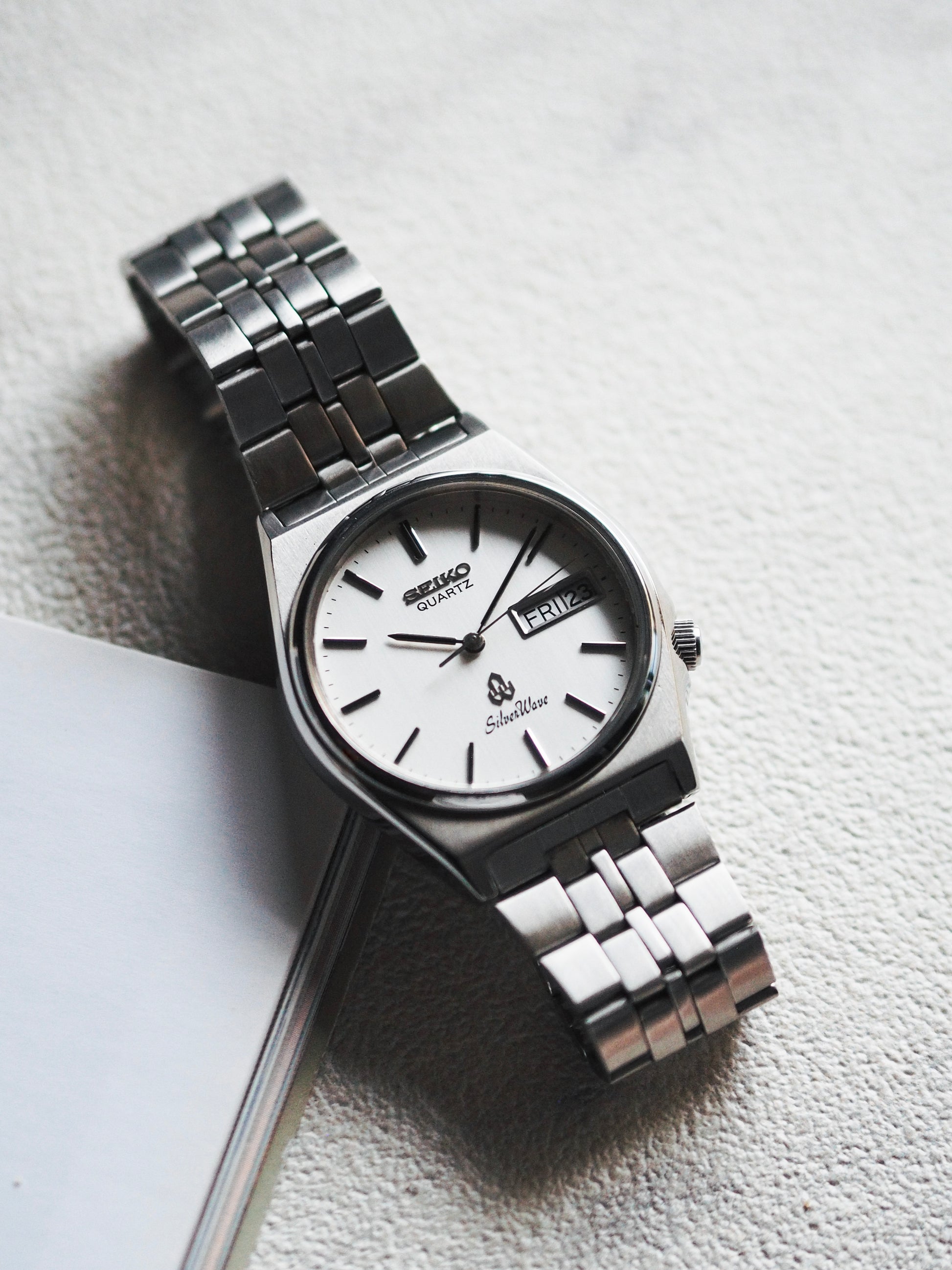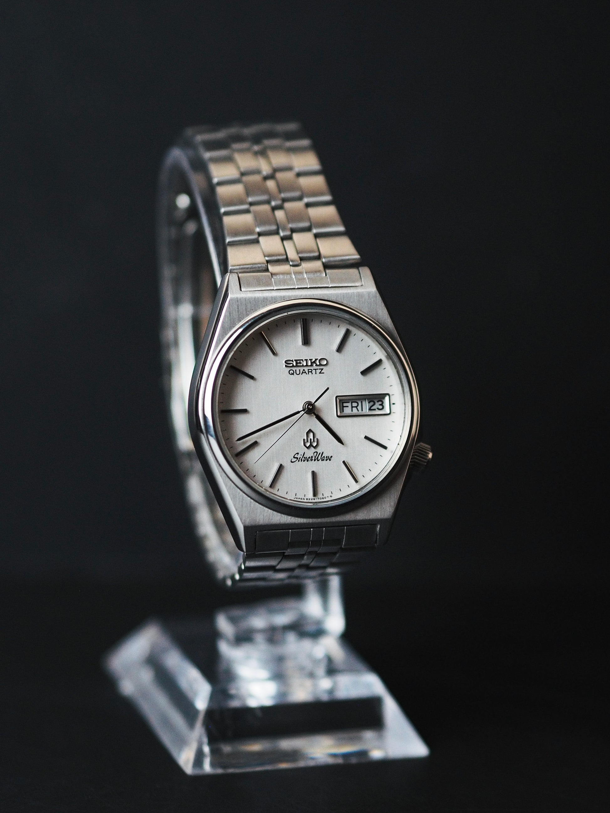 The Silverwave Quartz stands out as one of Seiko's early water-resistant watches, sporting its iconic tsunami wave logo on the case back. It features a screw-down crown, usually positioned at 3 or 4 o'clock, along with a crown guard and a screw-in case back for added protection.