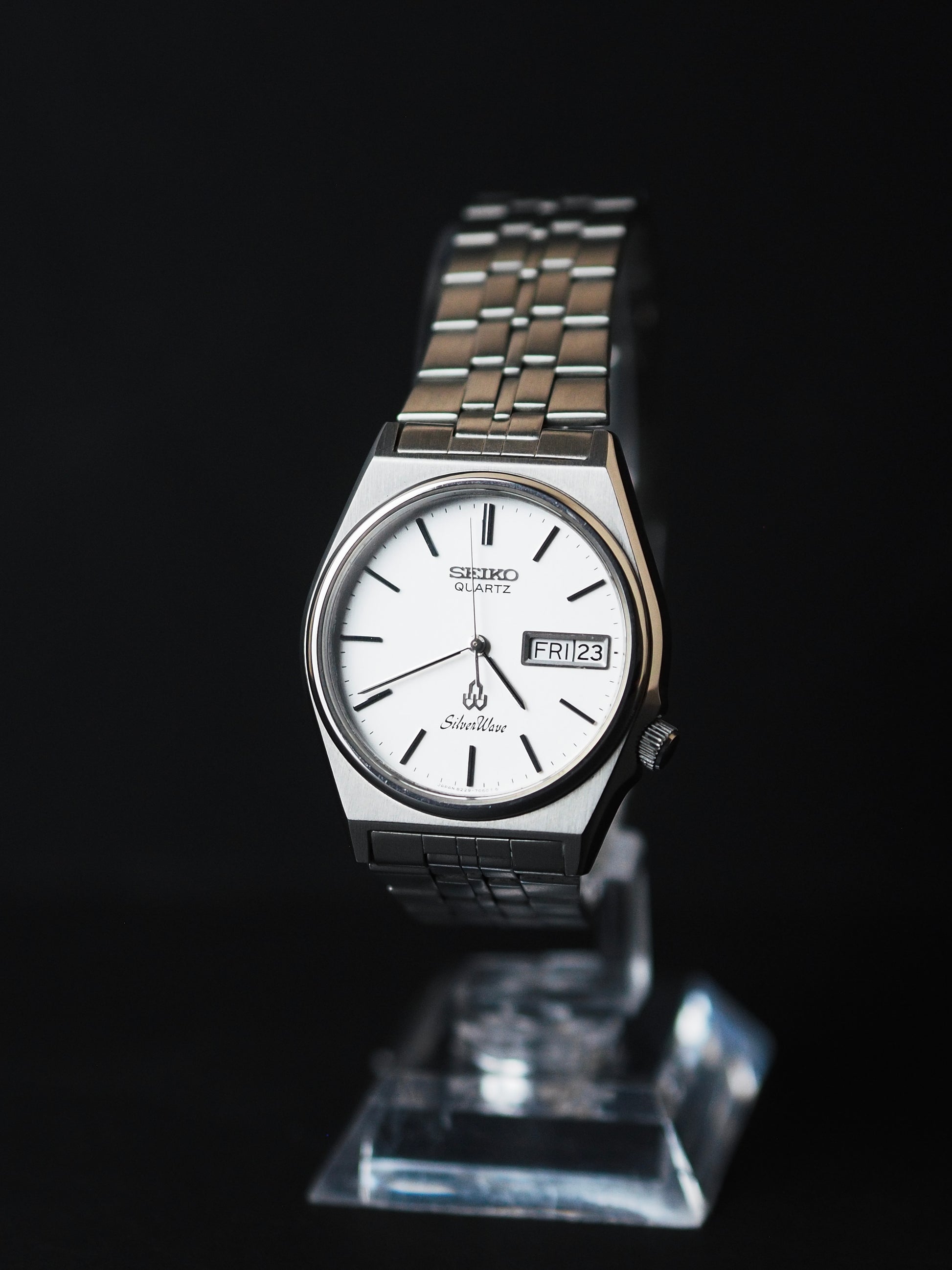 This Seiko Silverwave 8229-7040 from 1982 is in excellent condition with no obvious signs of wear, and the back case still has the blue sticker intact. This watch features a simple white linen dial with clear logos and Silverwave markings, stick indices, and sword hands. It comes with the original bracelet, suitable for wrist sizes of approximately 18.5 cm.