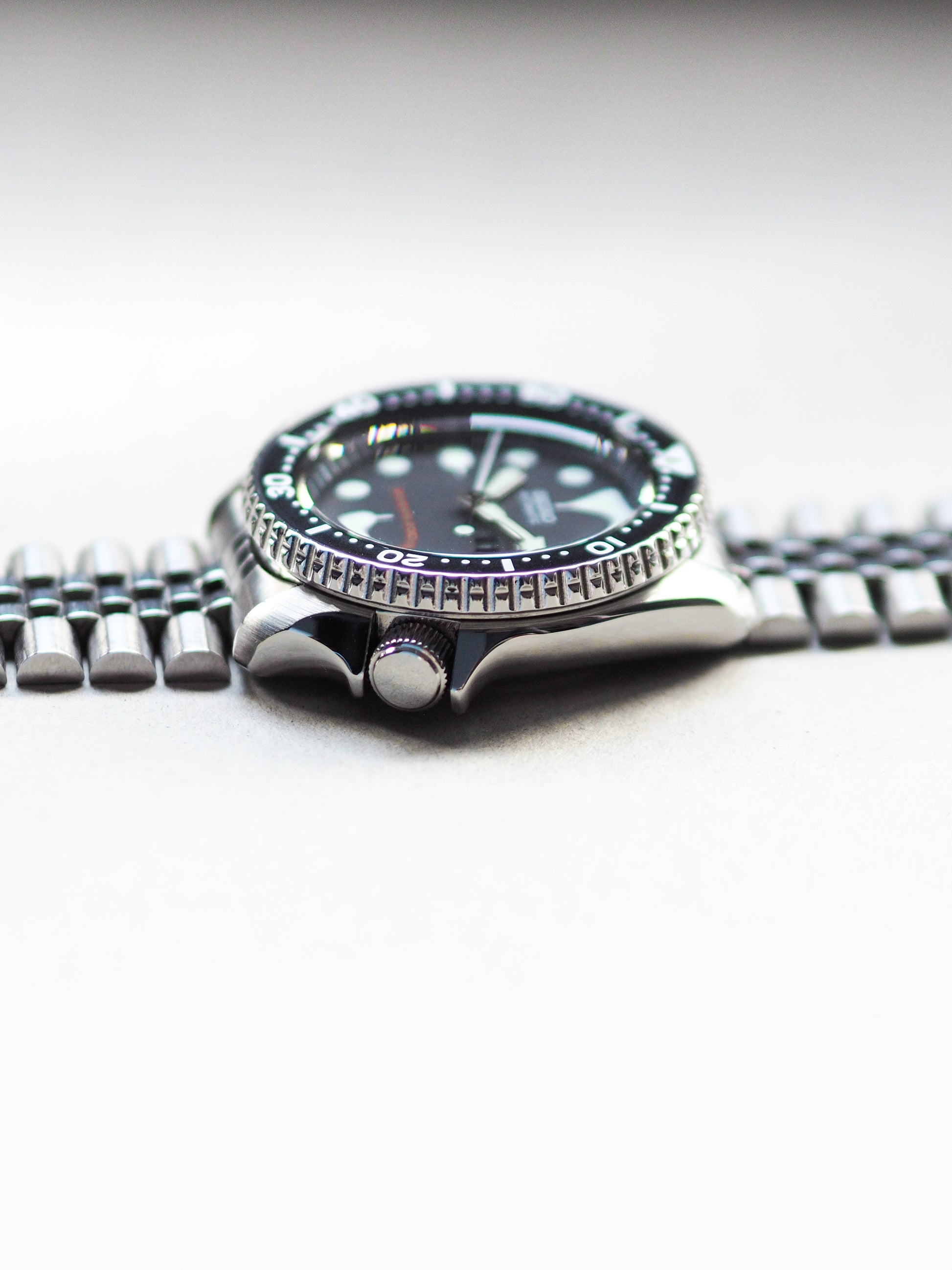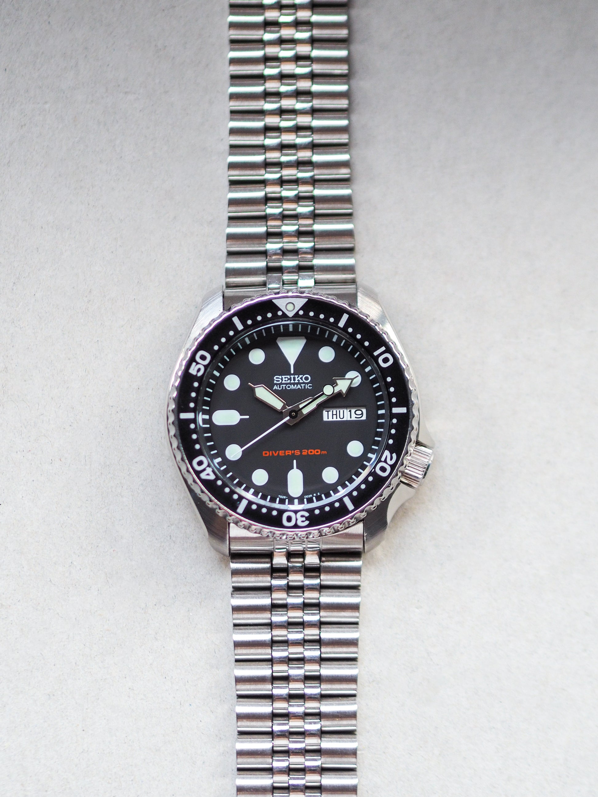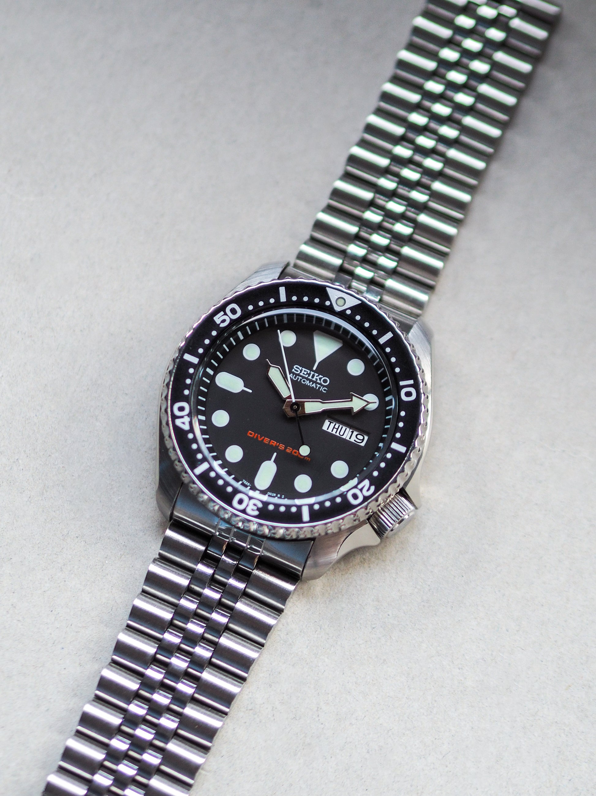 This particular 2018 SKX007, remains in very good condition. The dial and crystal are clean, the case is mint, and only a faint, barely visible scratch can be seen on the bezel. It comes with its original box and is currently fitted with an aftermarket jubilee bracelet with the Seiko clasp. The movement has been recently serviced and runs with good accuracy.