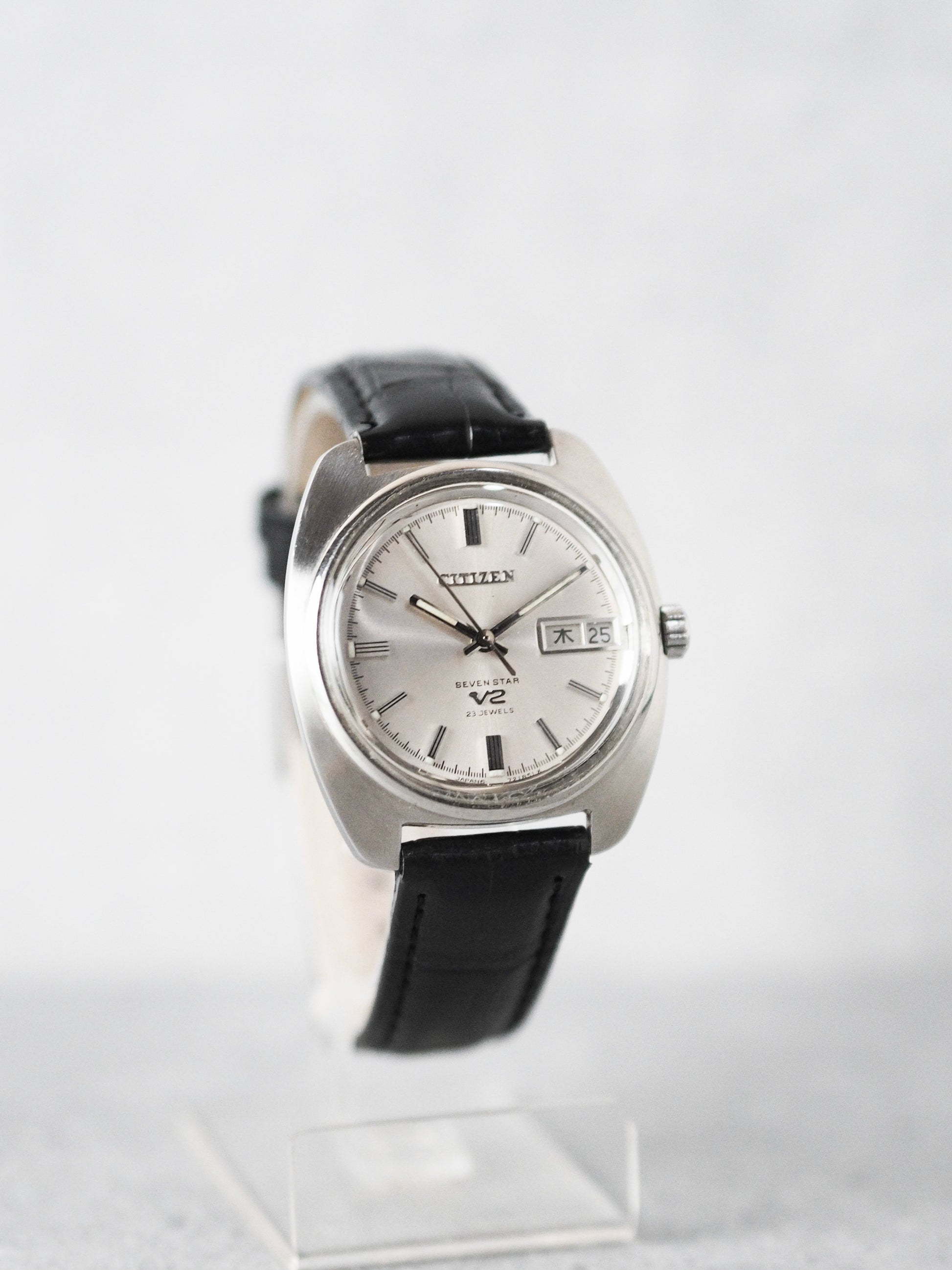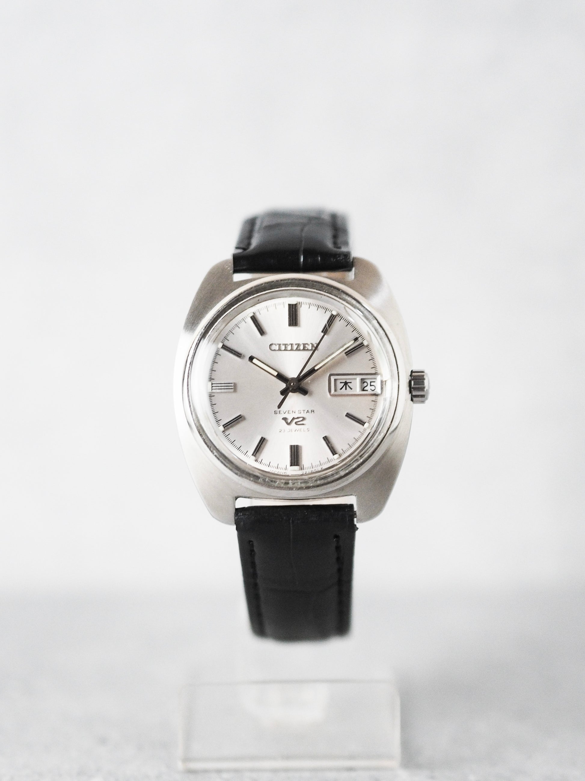This 1970s model of the Citizen Seven Star V2 showcases a cushion-shaped case crafted from stainless steel, featuring a brushed front and polished sides. Its silver sunburst dial is adorned with stick indices, with double indices at six, nine, and twelve o'clock. Enhancing its aesthetic appeal, the luminescent material is applied to the indices and hands, while the dial features the Citizen and V2 logos. Additionally, a small minutes rail is present on the dial, showcasing Citizen's meticulous attention to detail, along with a stamped crown.