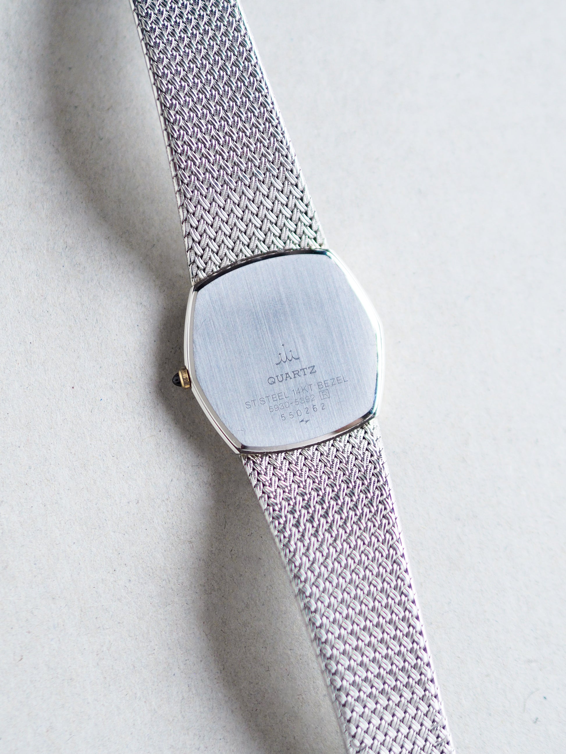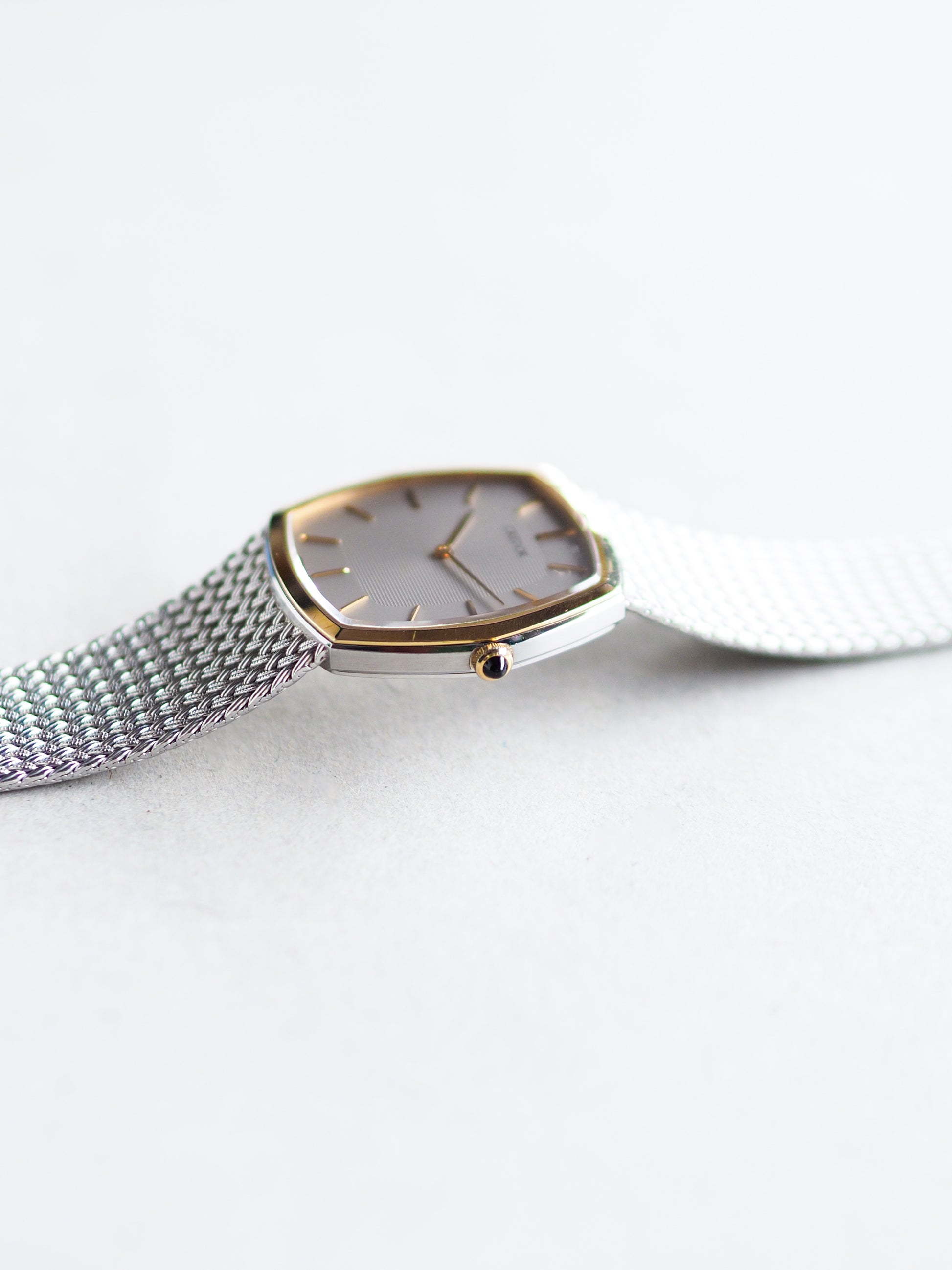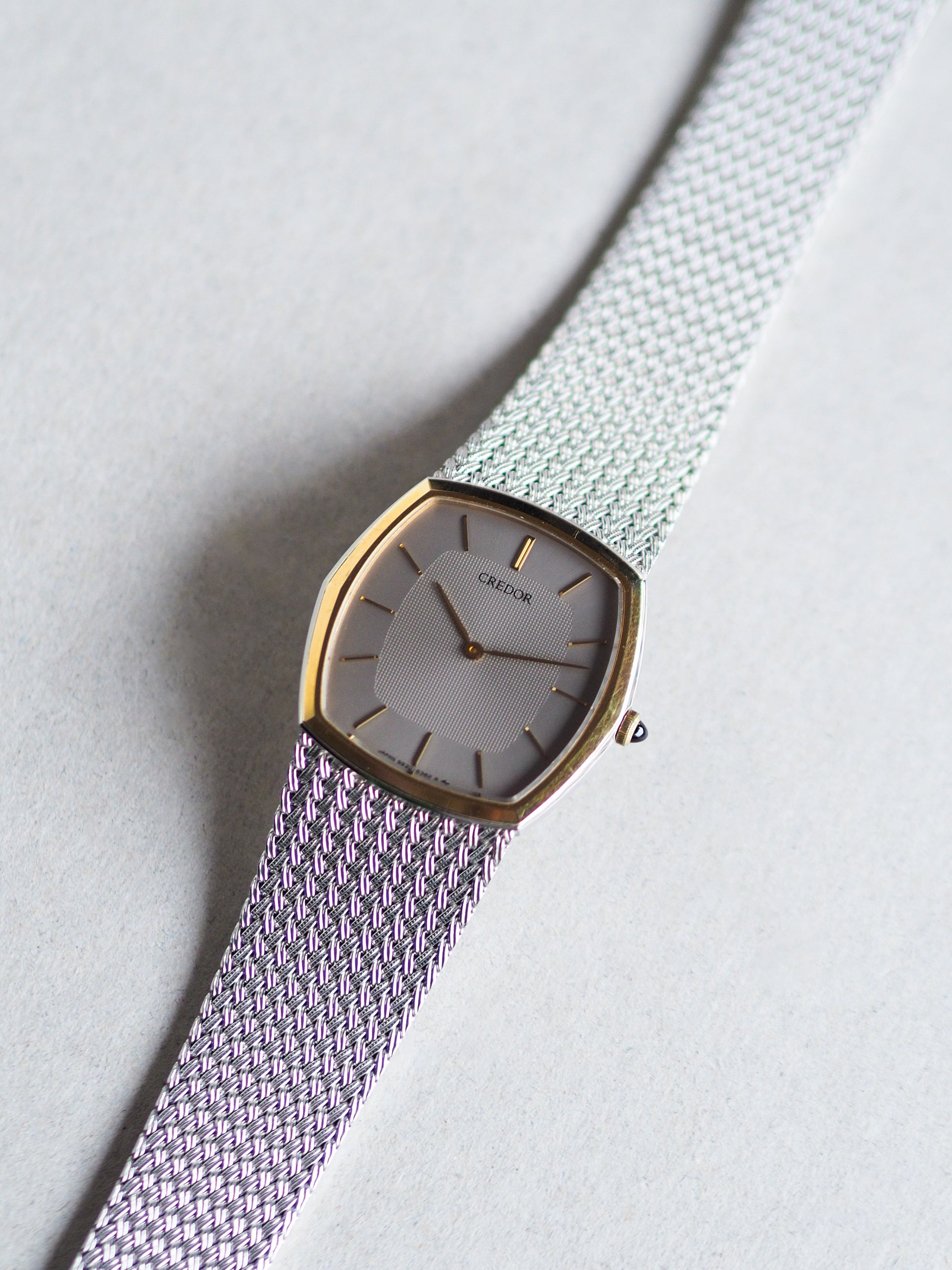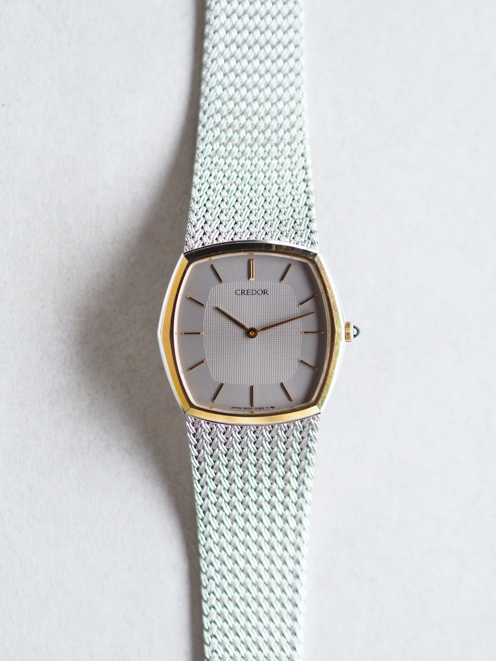 Presented here is the Credor 5930-5392 from 1985, a classically elegant two-tone watch featuring a refined hexagonal case with a 14KT gold bezel and an integrated woven-style bracelet. The sophistication extends to its silver-gray dial, which blends a lighter outer ring with a darker, hobnail-textured inner frame. The minimalist dial design includes only the Credor logo, slim gold-tone indices and hands, and is complemented by a matching gold cabochon-style crown.