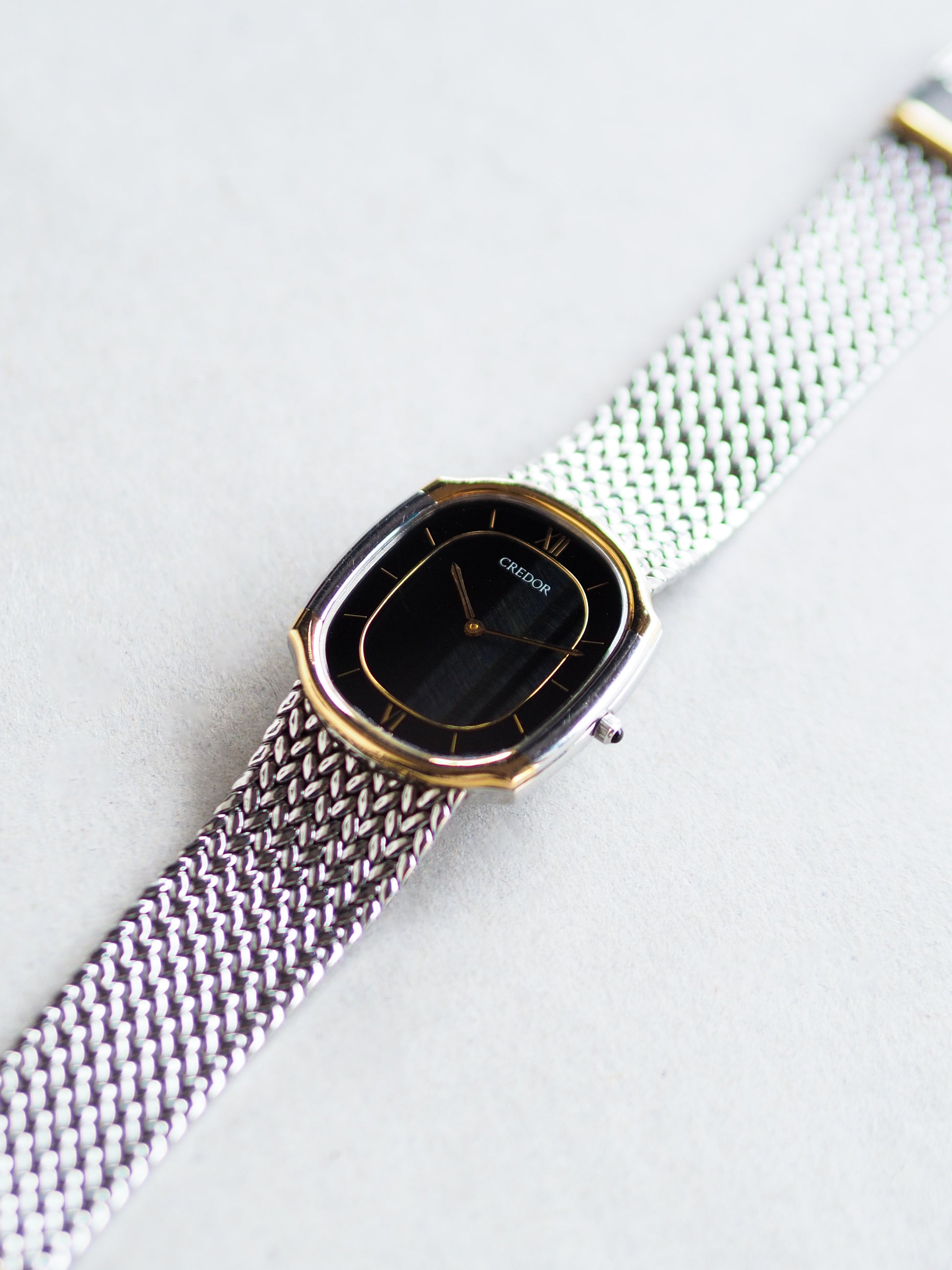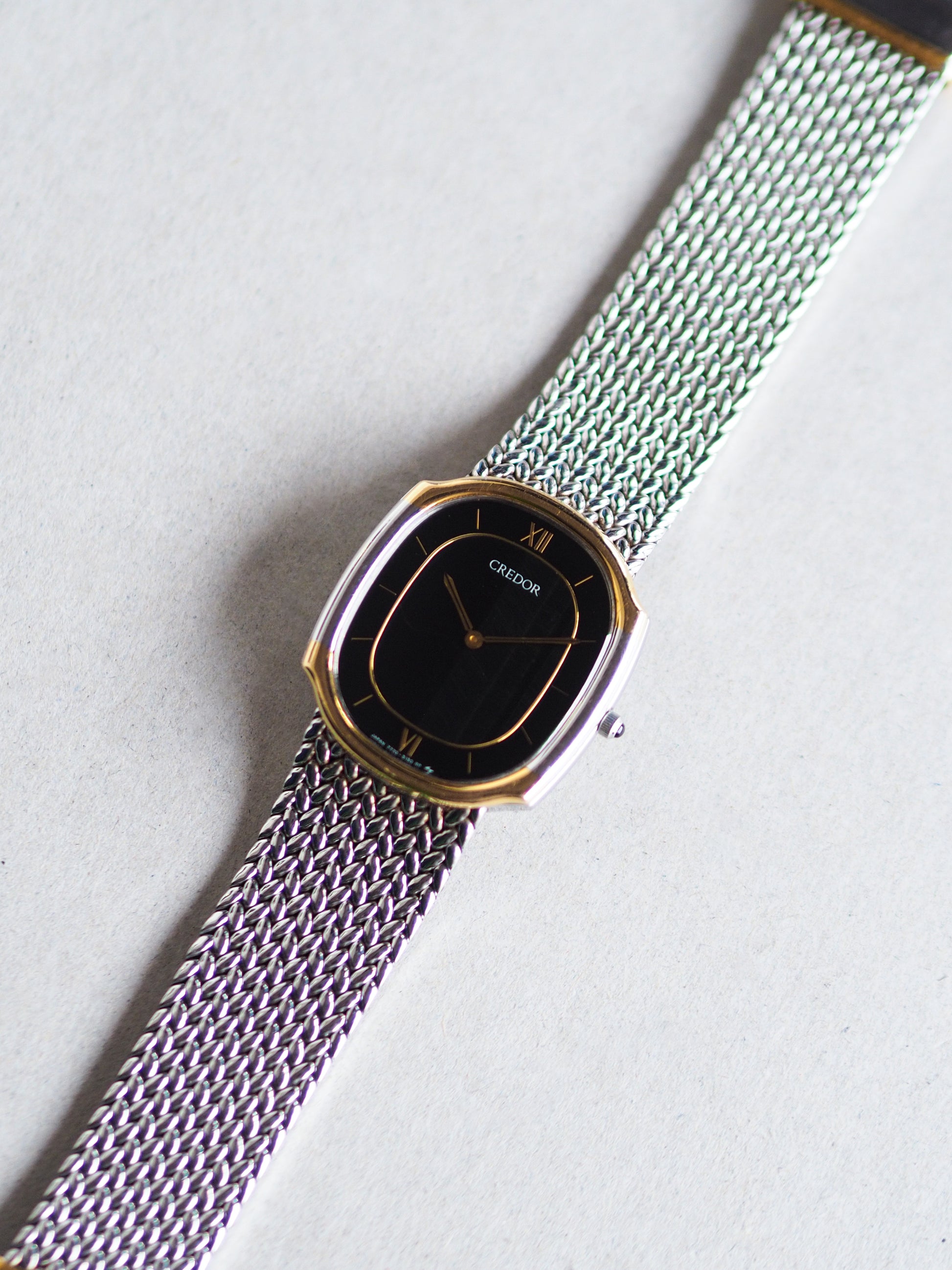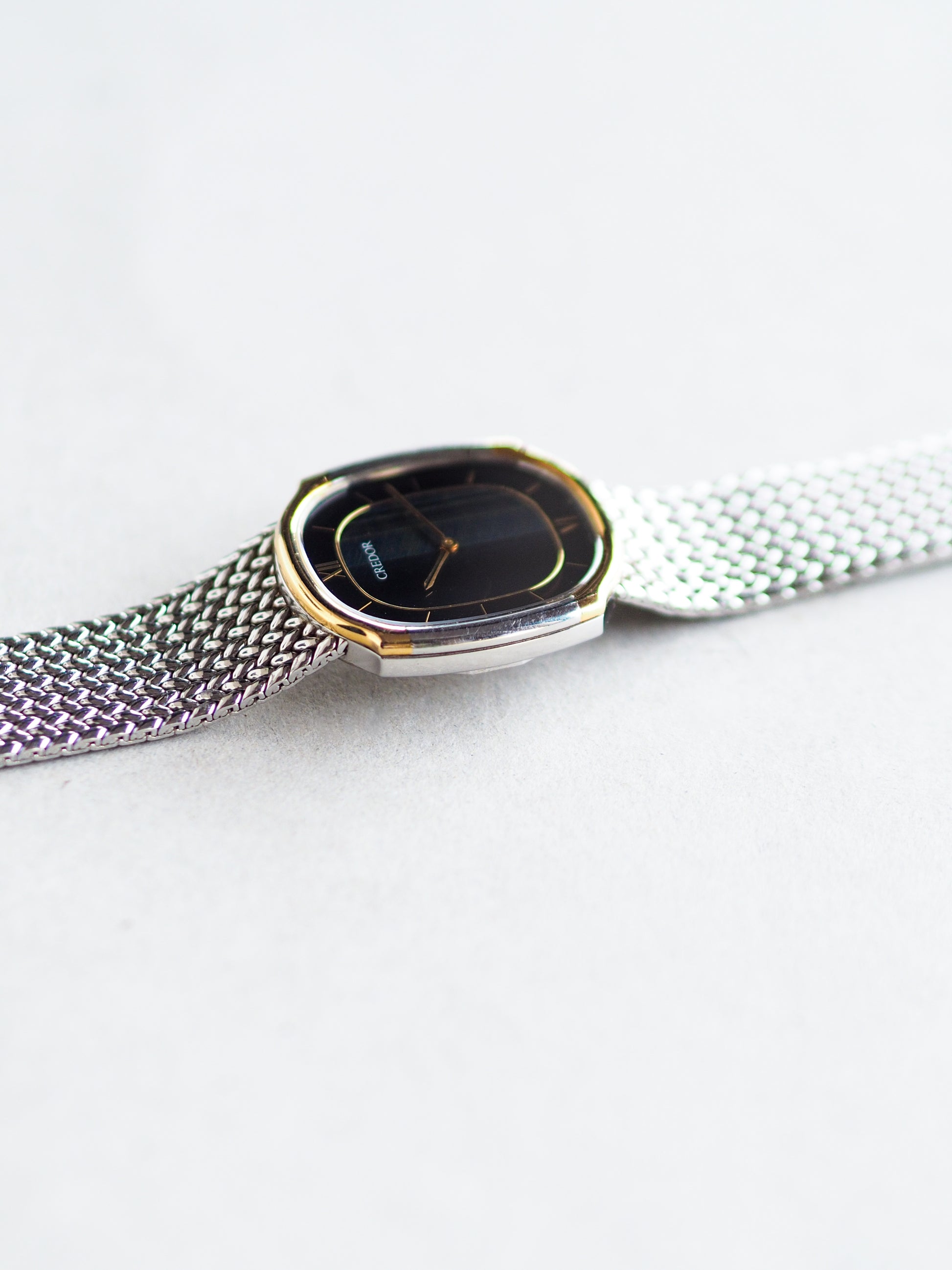 This Credor 7770-5141 from 1985 is a beautiful example, featuring an elegant oval-shaped case and an integrated woven-style bracelet. Adding to its luxurious appeal is an 18KT gold bezel and a striking black marble dial. A closer look reveals a unique split texture—half solid black and half with a wavy linen pattern—combined with Roman numeral indices and sword-style hands to create a refined, classic appearance that embodies the spirit of the Credor brand.