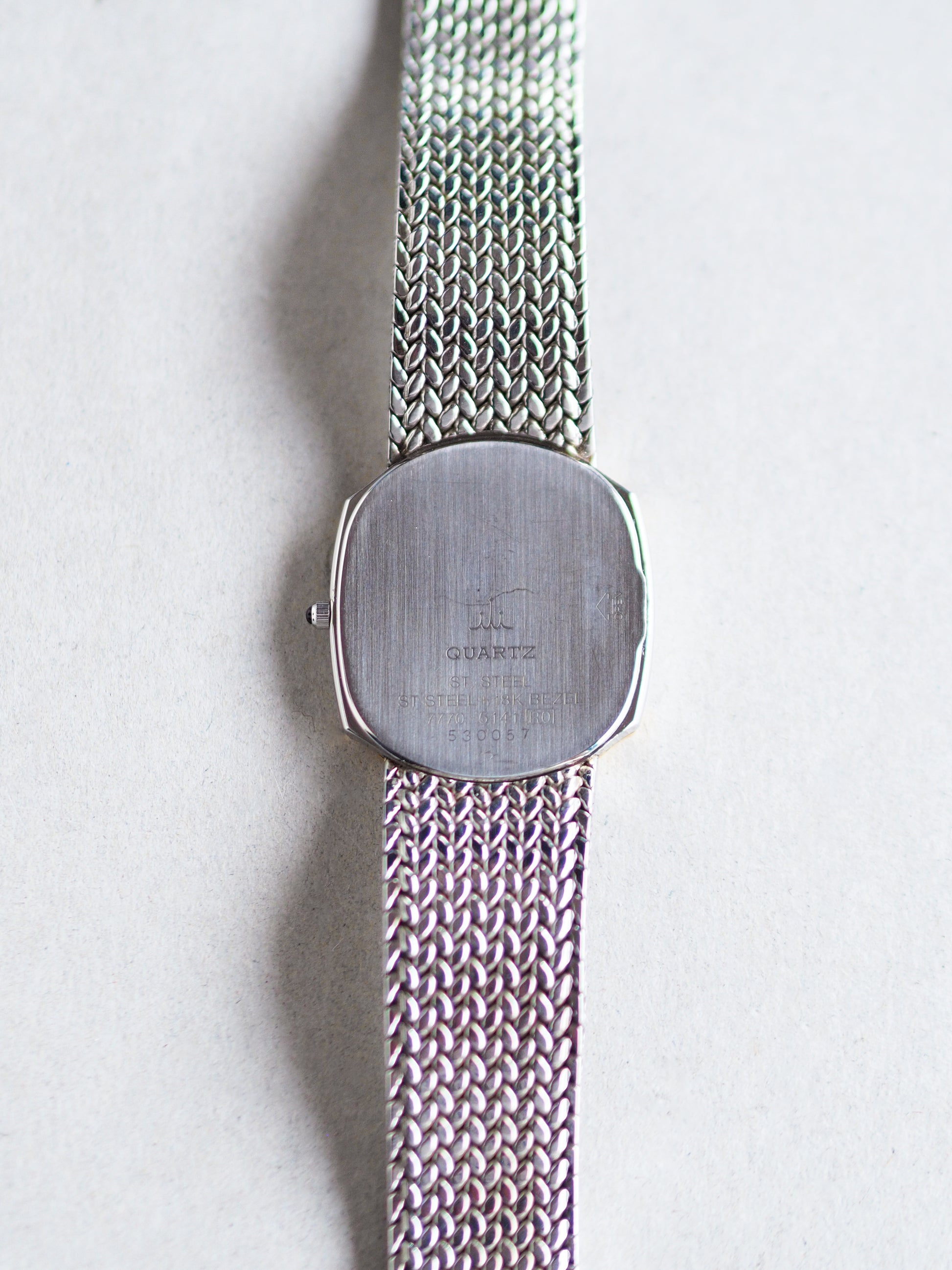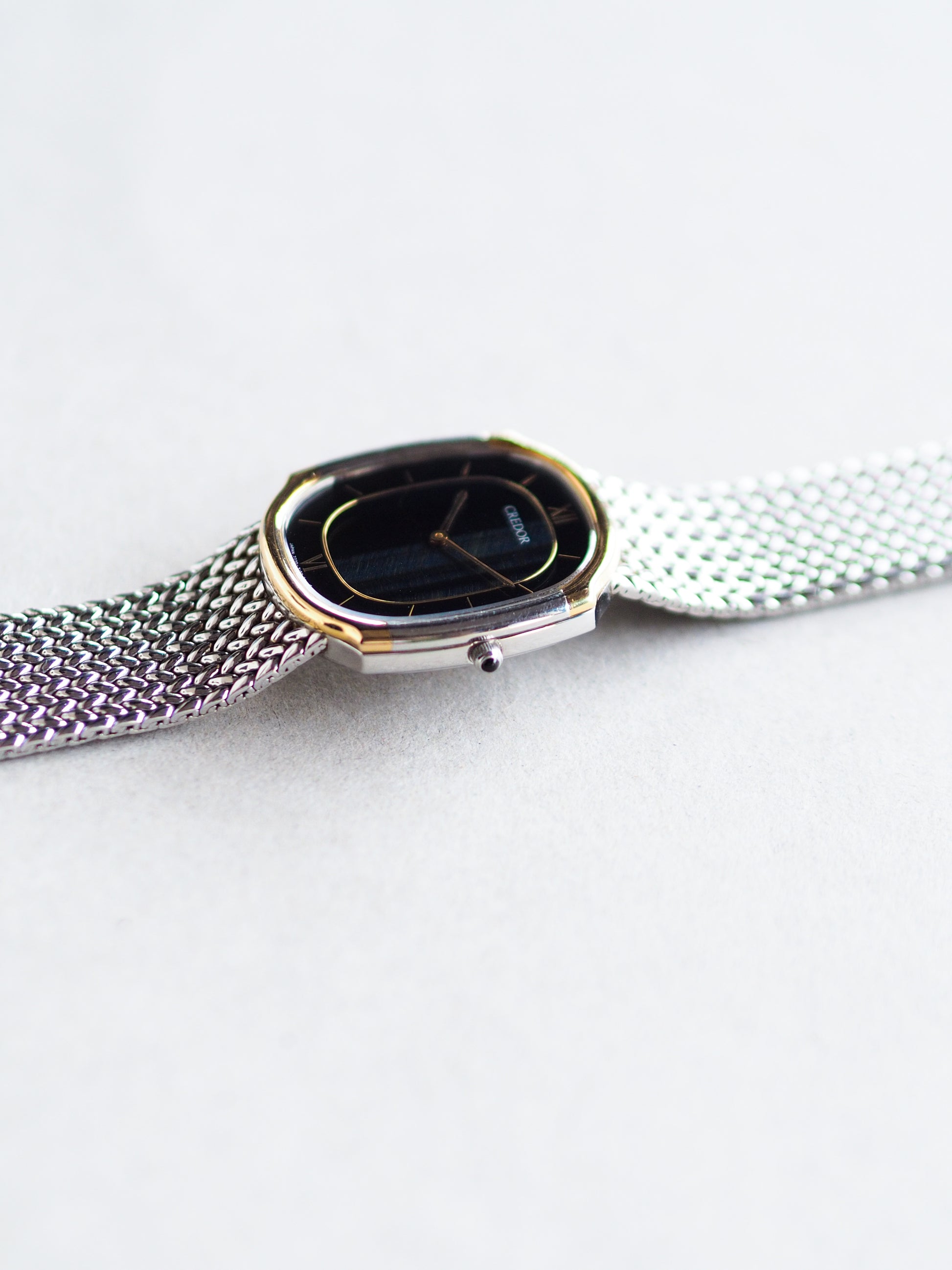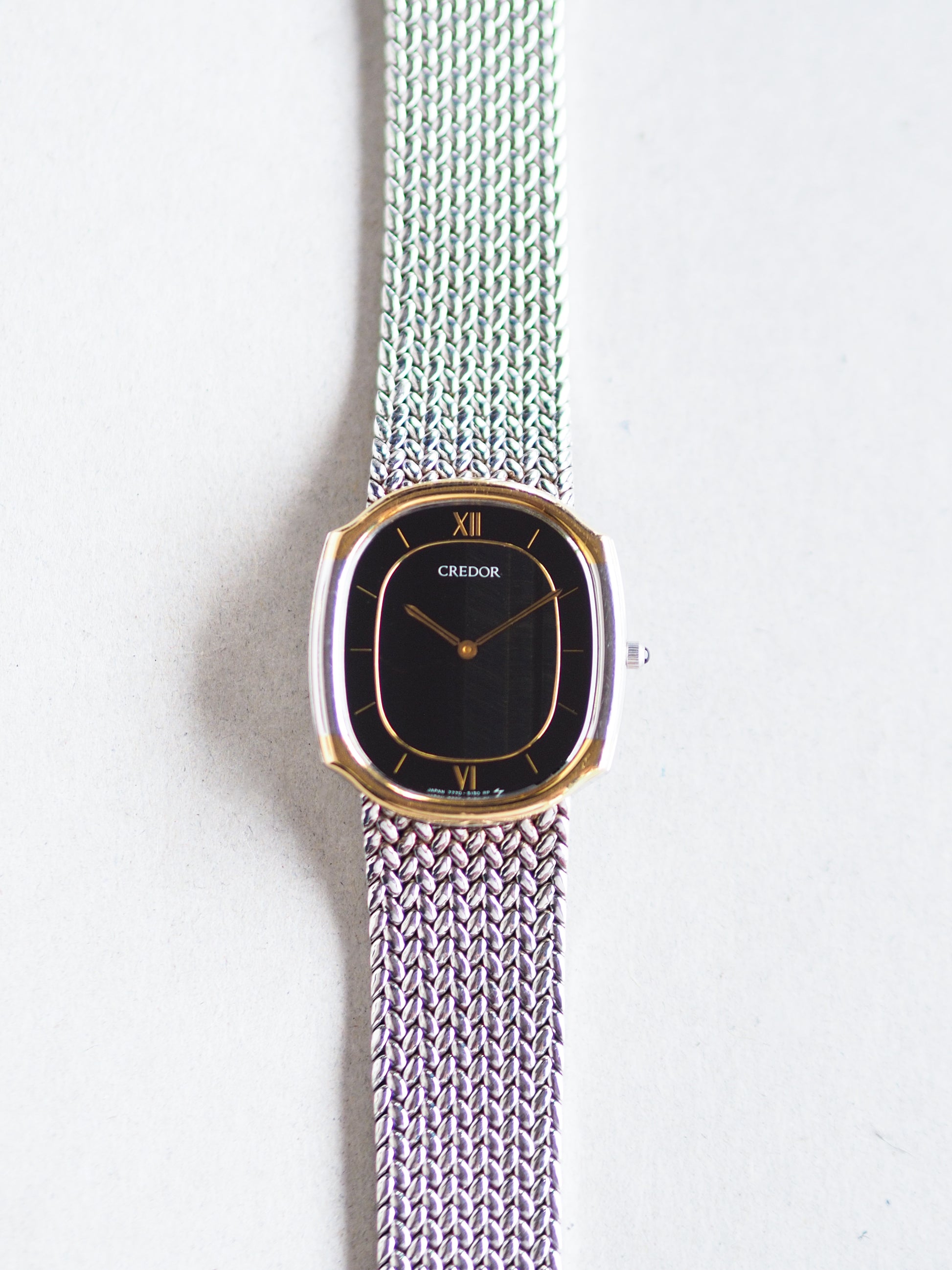 This Credor 7770-5141 from 1985 is a beautiful example, featuring an elegant oval-shaped case and an integrated woven-style bracelet. Adding to its luxurious appeal is an 18KT gold bezel and a striking black marble dial. A closer look reveals a unique split texture—half solid black and half with a wavy linen pattern—combined with Roman numeral indices and sword-style hands to create a refined, classic appearance that embodies the spirit of the Credor brand.