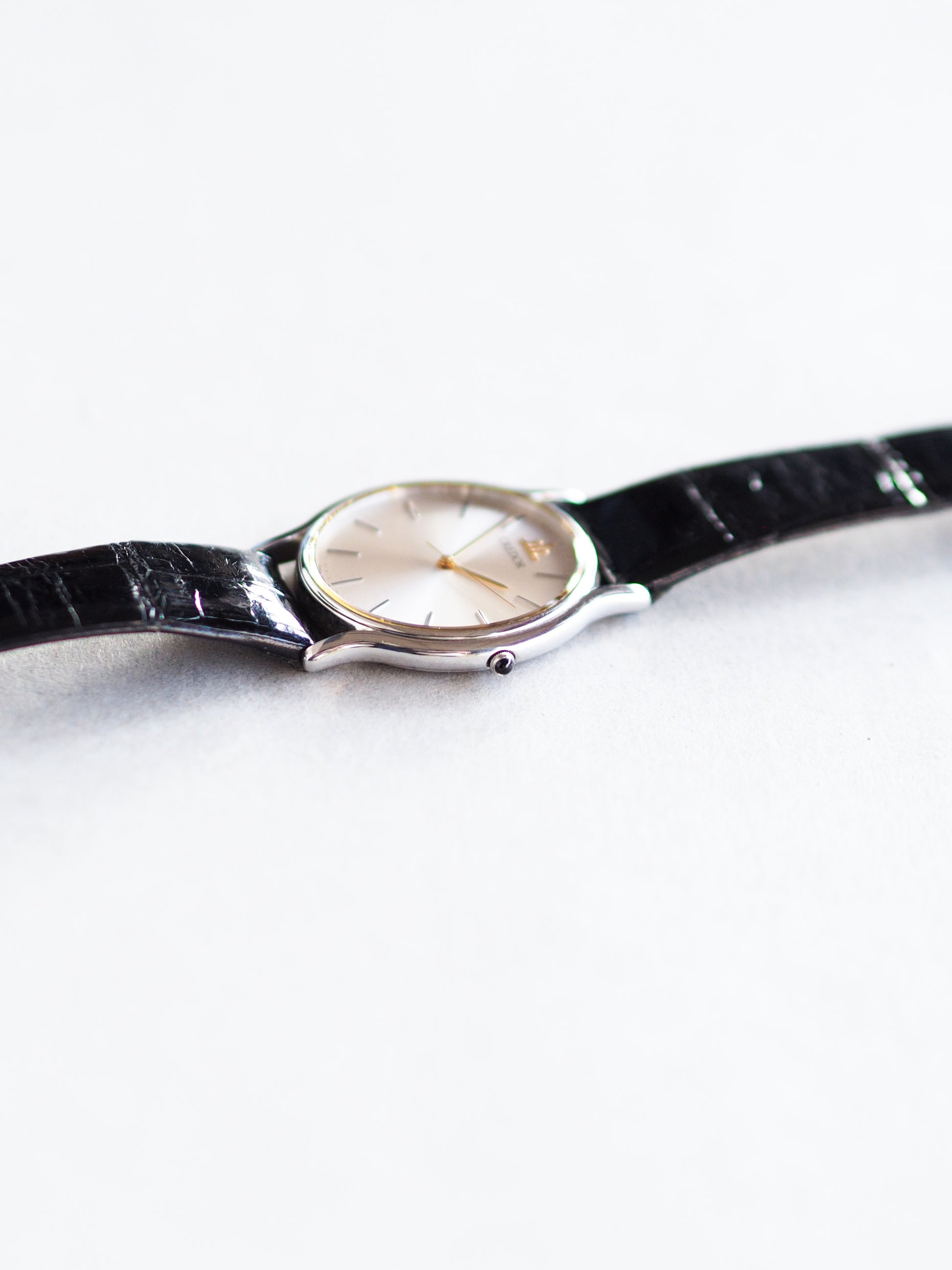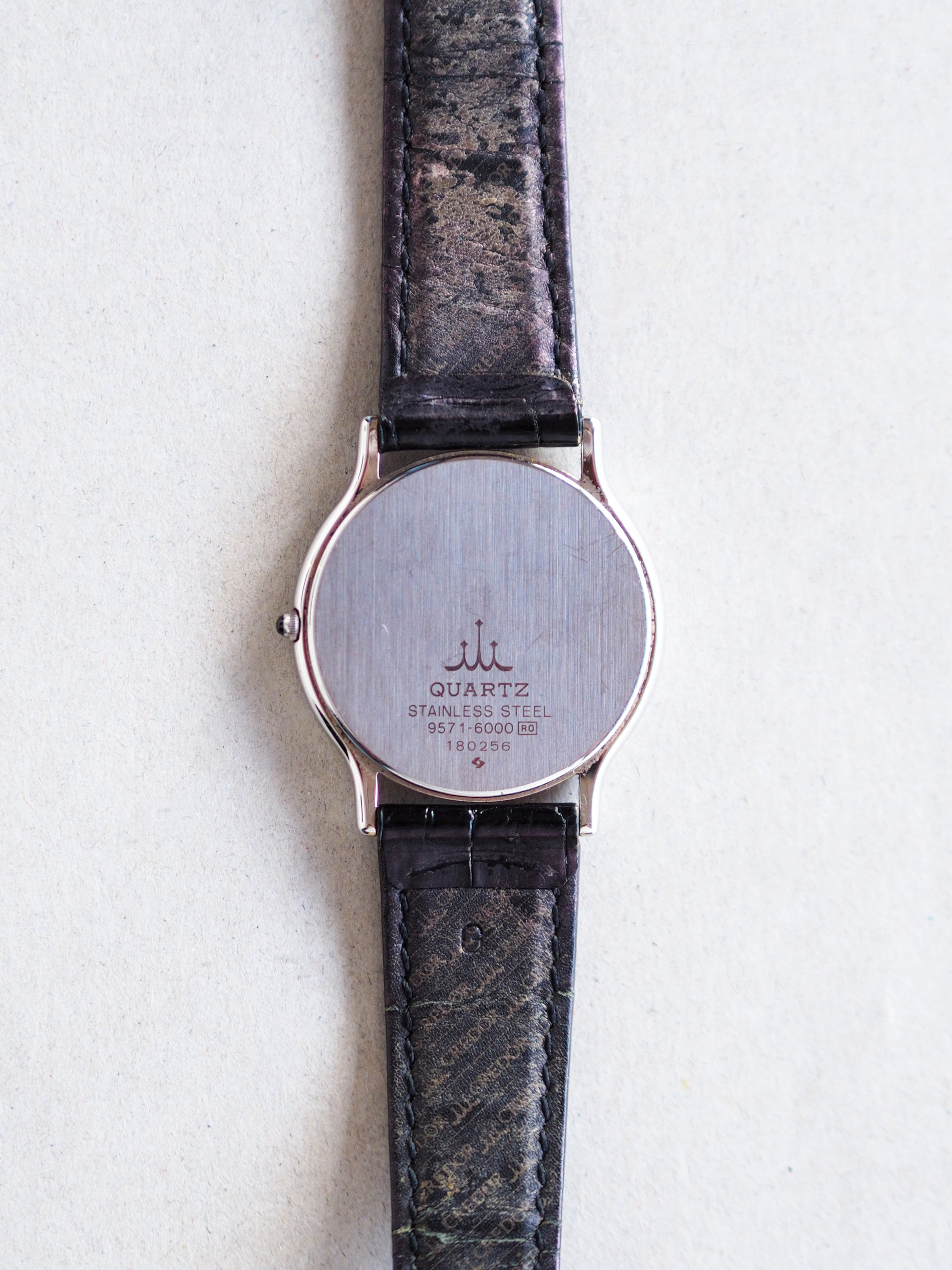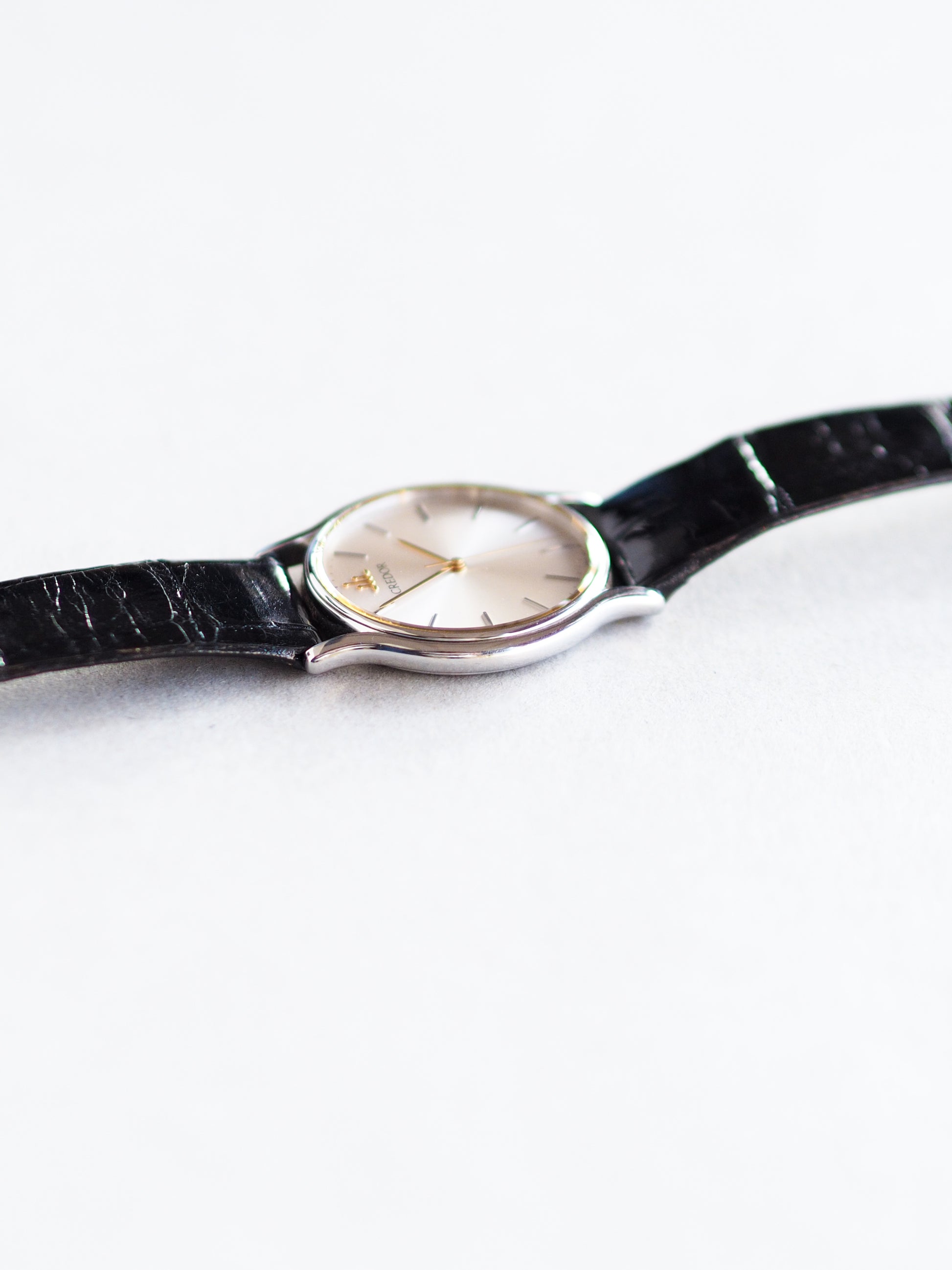 The Credor 9571-6000 is a refined and elegant quartz dress watch from 1991. It features a warm silver sunburst dial, beautifully accented by slim silver stick indices and gold-toned hands. The three-pointed gold Credor logo at 12 o’clock and a gold-accented inner ring add subtle luxury to the minimalist design, while the cabochon crown enhances its sophisticated appeal.