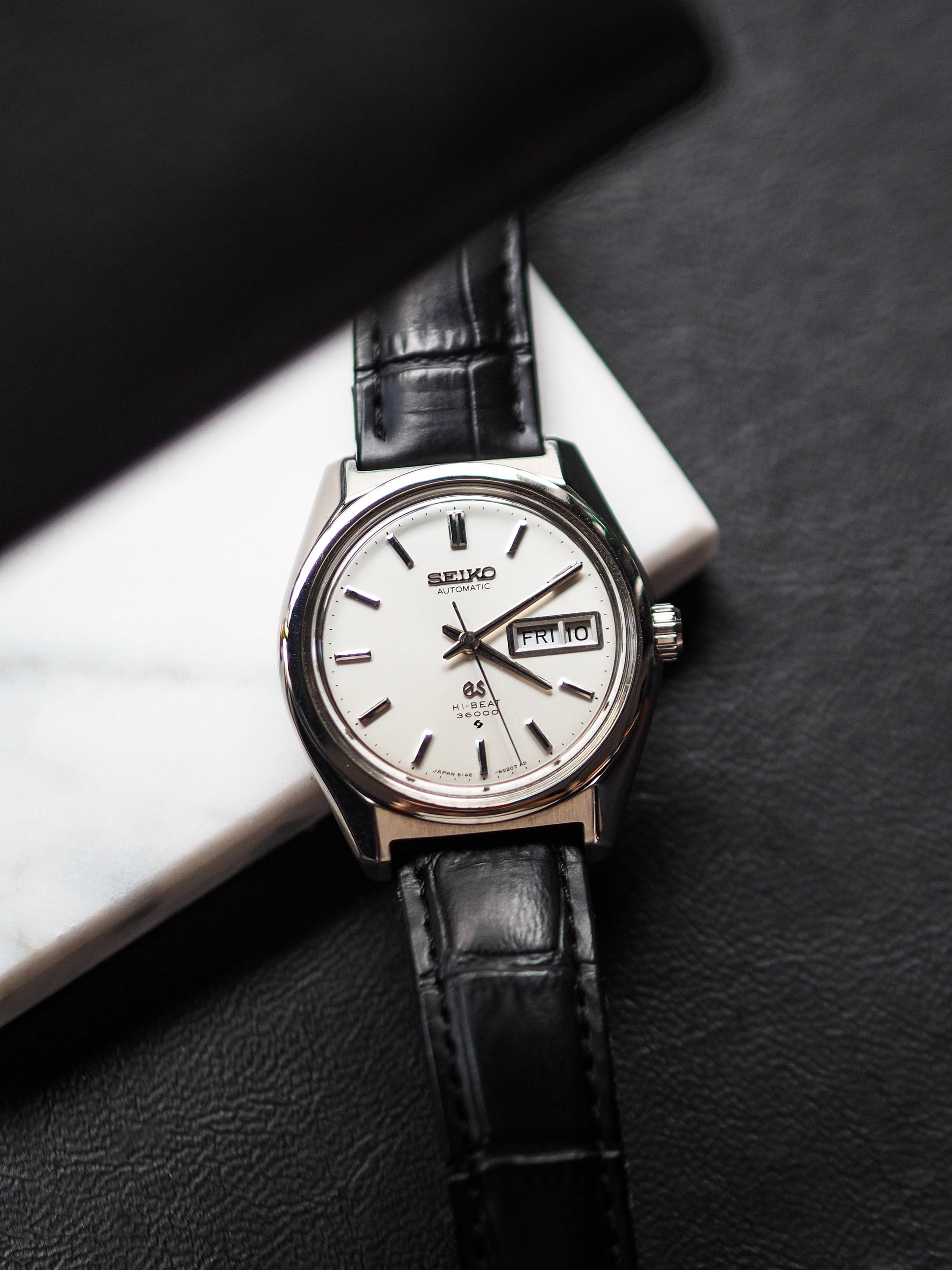 This 61GS from 1969 is a simple yet stunning example of a vintage Grand Seiko timepiece. Great design, outstanding craftsmanship, and expert-level finishing come together to create a wristwatch that exudes high quality in both hand and on the wrist. Its high-beat movement is a feature not found in all vintage Grand Seikos.