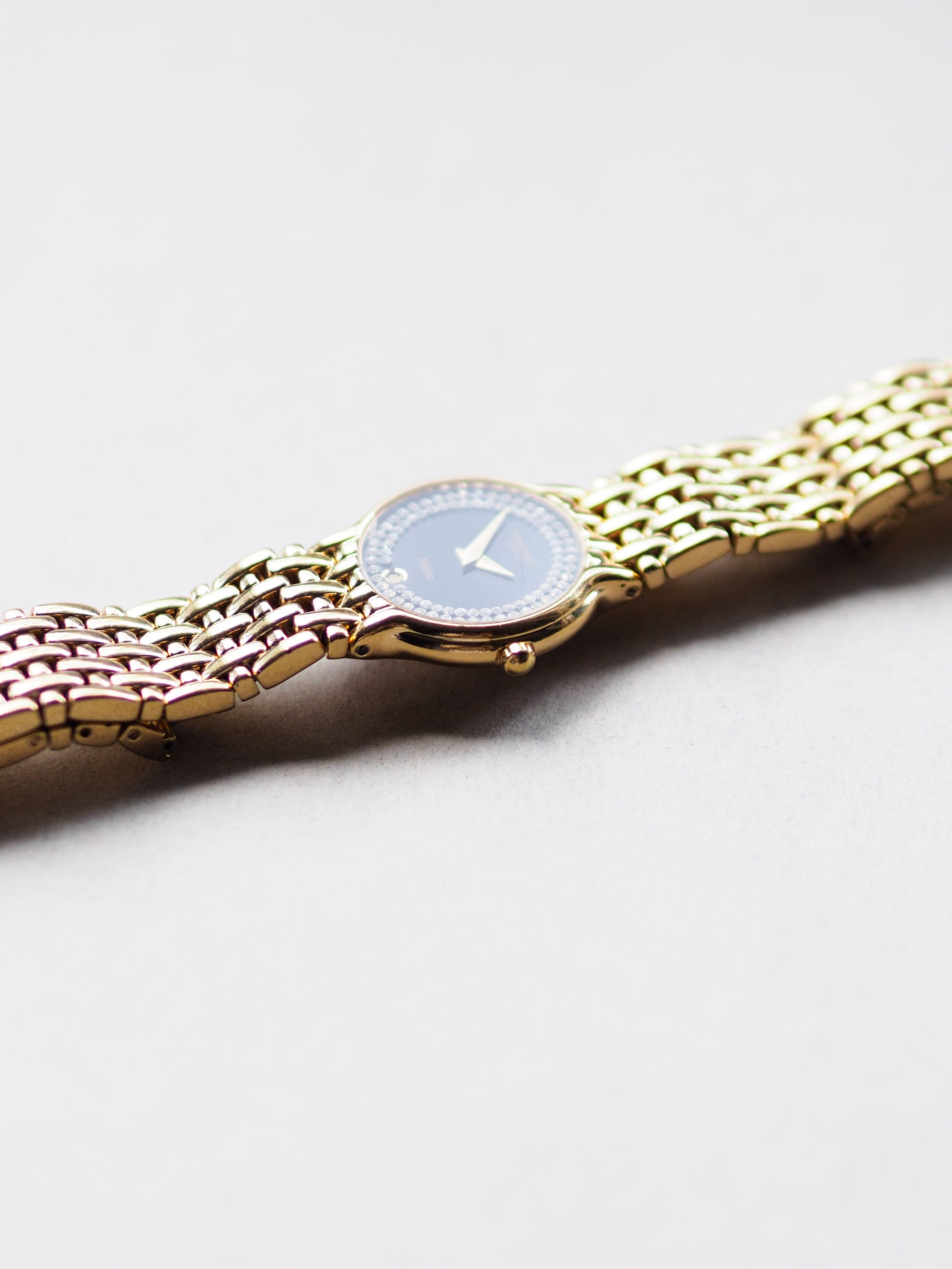 The watch is powered by a quartz movement, offering reliable and accurate timekeeping. It measures 24mm in case diameter and is fitted with an integrated bracelet which fits approximately 16cm wrist size. The dial is clean and well preserved, complemented by a date display at 6 o’clock. The case and bracelet are in very good overall condition, showing only minimal signs of wear consistent with careful use. The crystal shows light surface scratches only, visible upon close inspection and not affecting legibility.