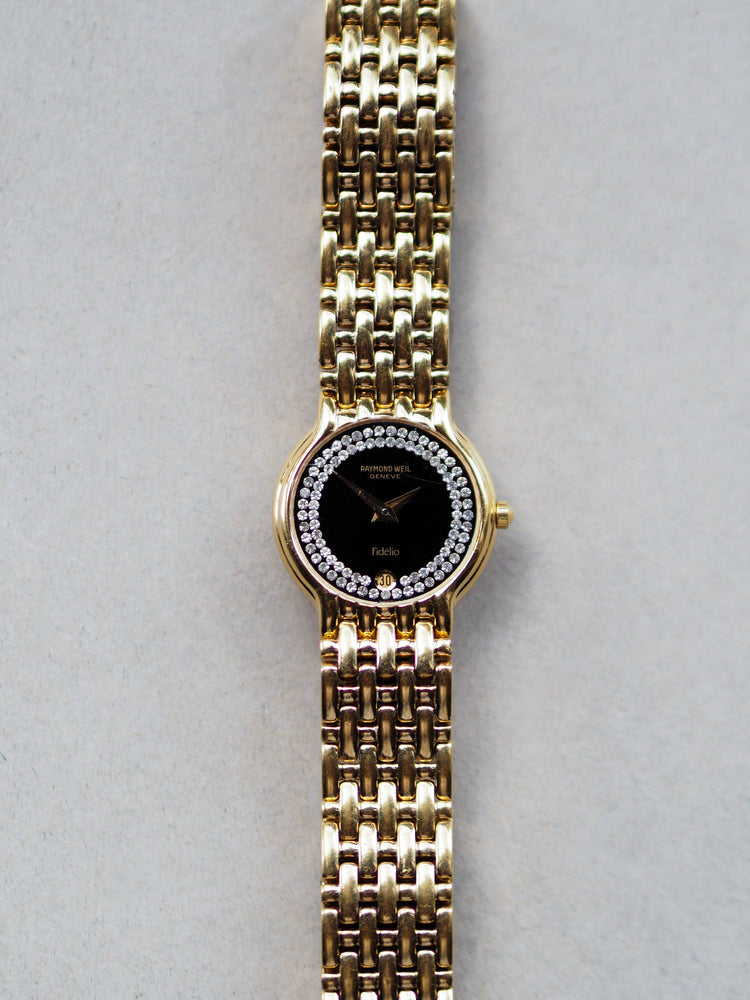 For sale a classic and elegant Raymond Weil Fidelio ladies watch, reference 4702, featuring an 18K gold-plated case and integrated bracelet paired with a refined black dial and diamond-set bezel. A timeless design from Raymond Weil, well suited for both daily wear and formal occasions.