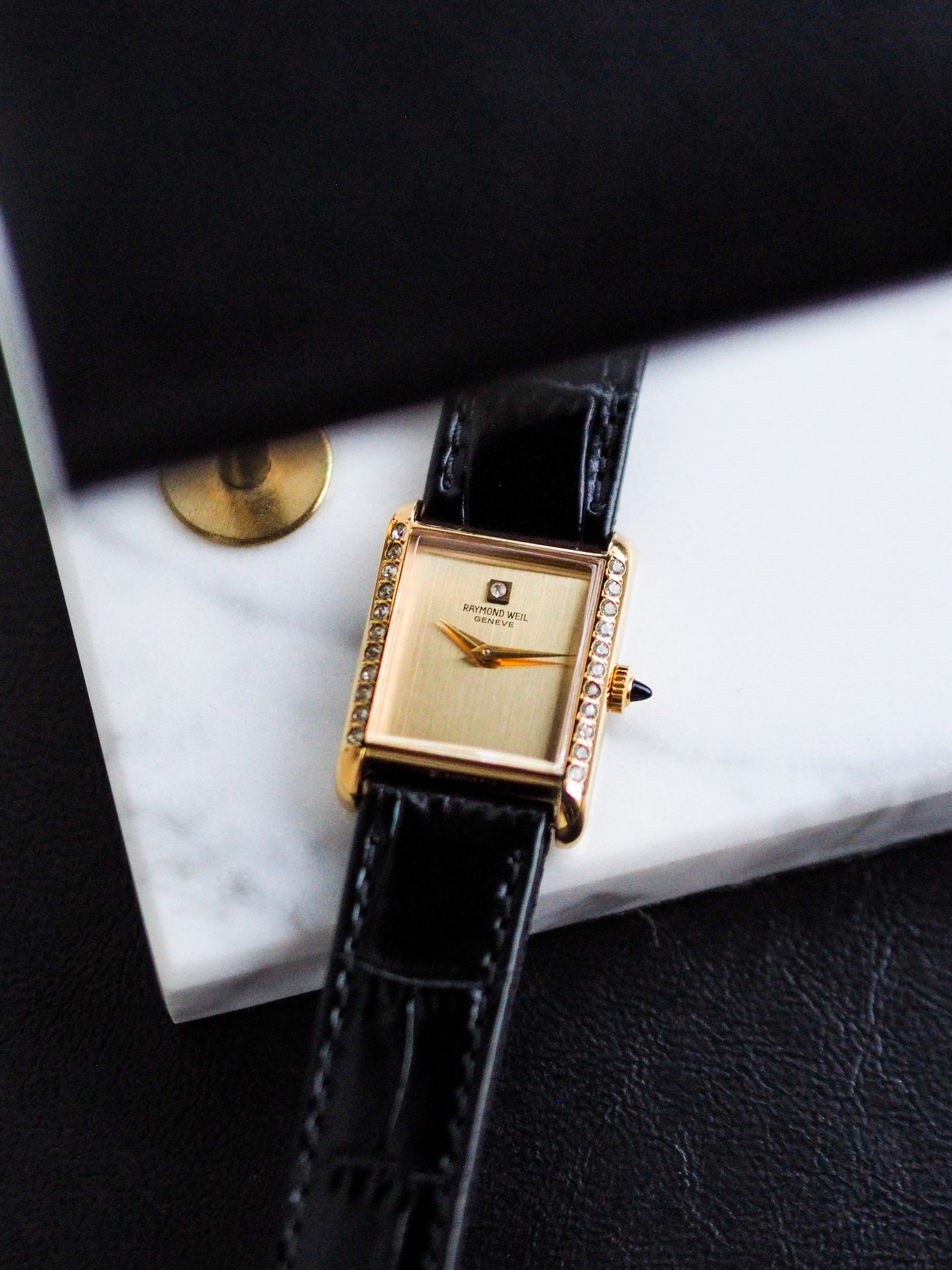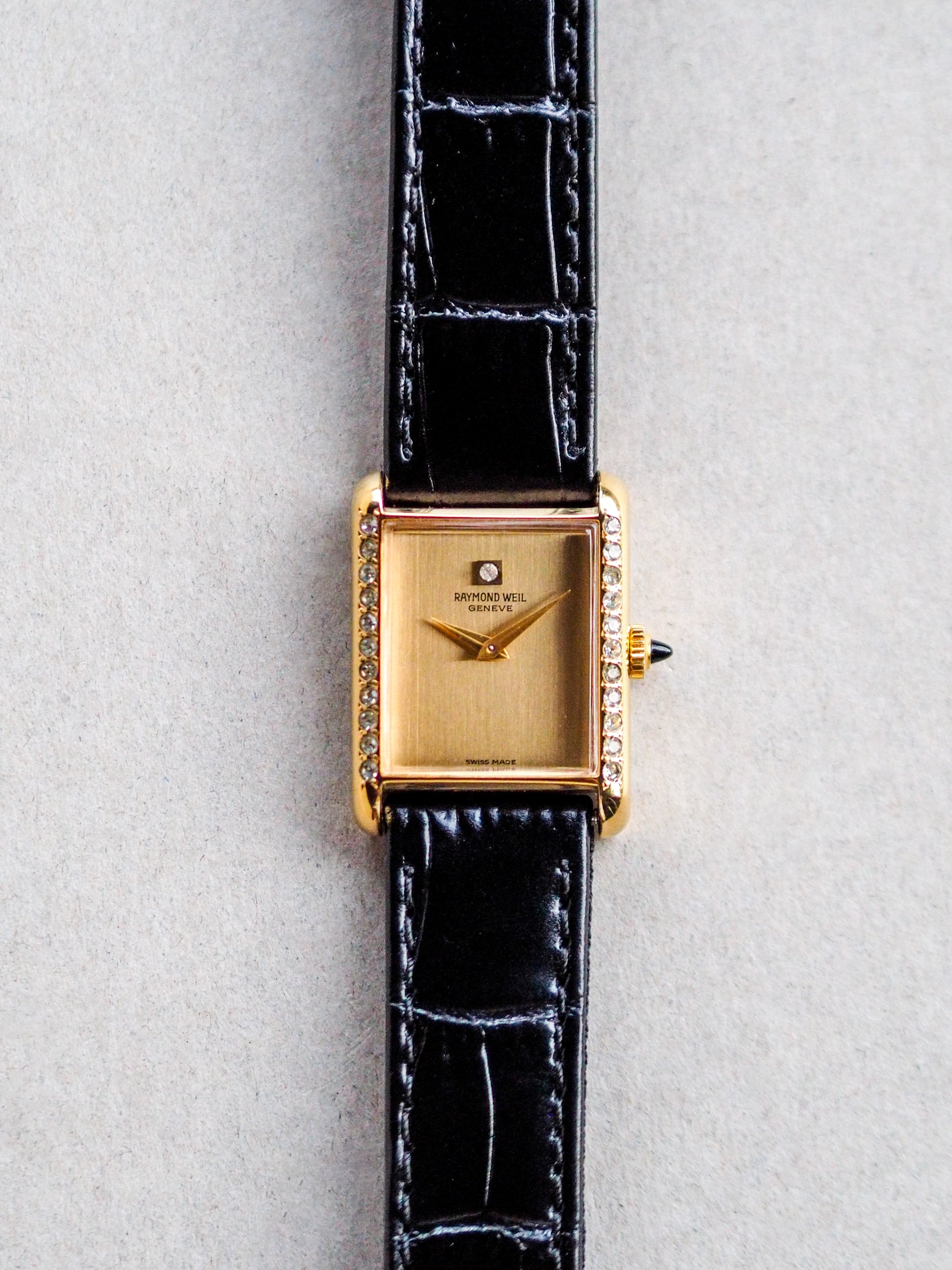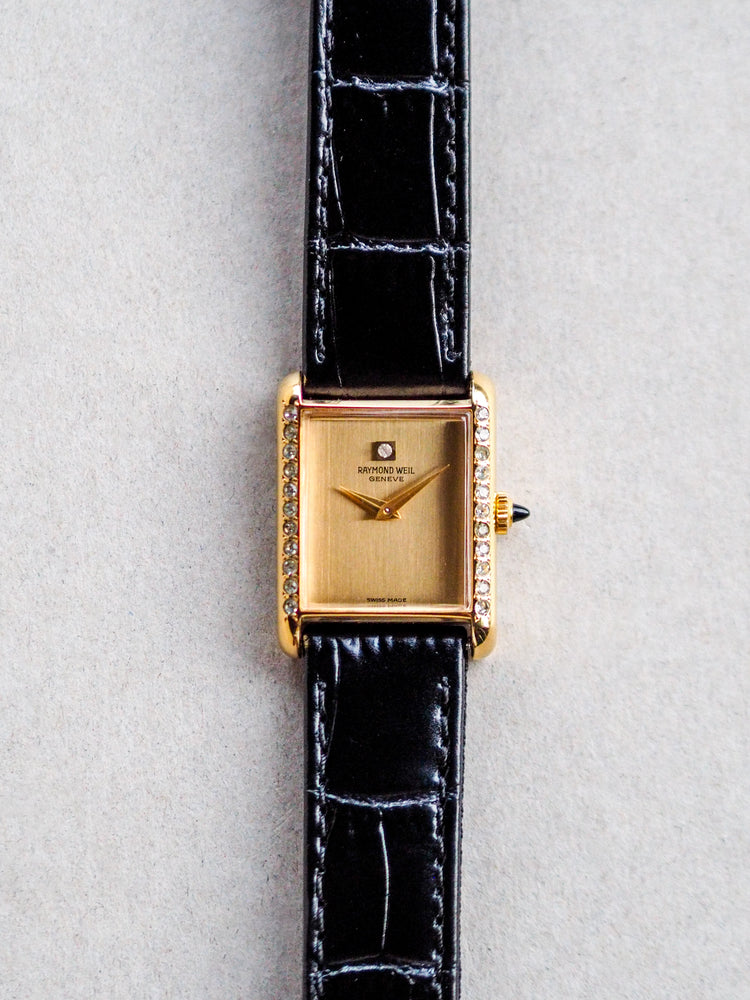 For sale is a 1970s vintage Raymond Weil manual-winding watch, featuring a striking tank shaped design adorned with 11 diamonds on each side of the bezel. The elegant champagne dial is intentionally minimal, highlighted by a single diamond at the 12 o’clock marker, complemented by dauphine-style two-hand display and finished with a black onyx cabochon crown that enhances its refined character.