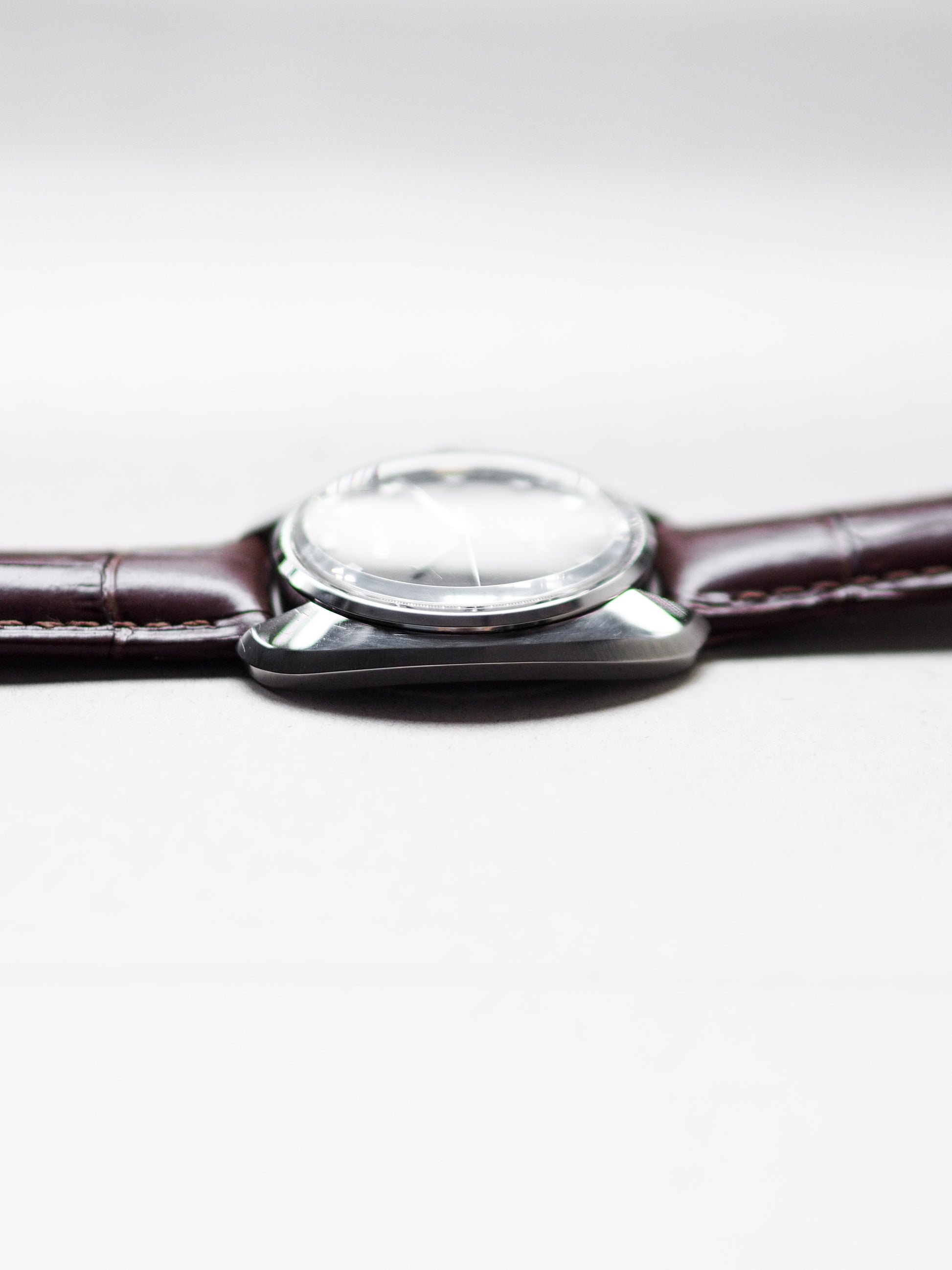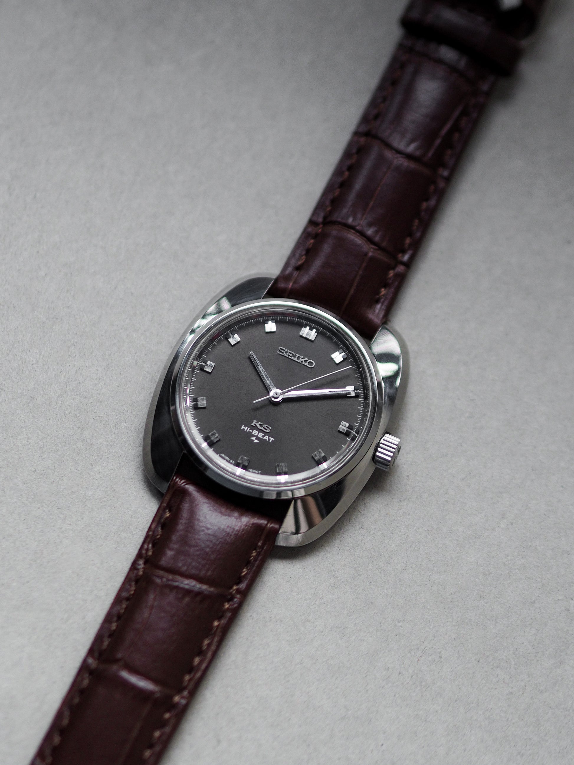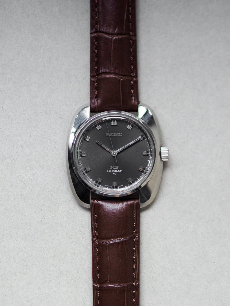 Introducing this unique and rare 1969 King Seiko Ref. 45-8000 in gray dial, designed and manufactured by Daini Seikosha’s Kameido factory. It features the distinct cushion-shaped “Zabuton” case with a polished top and beautifully brushed curved edges, giving the watch remarkable depth and presence.