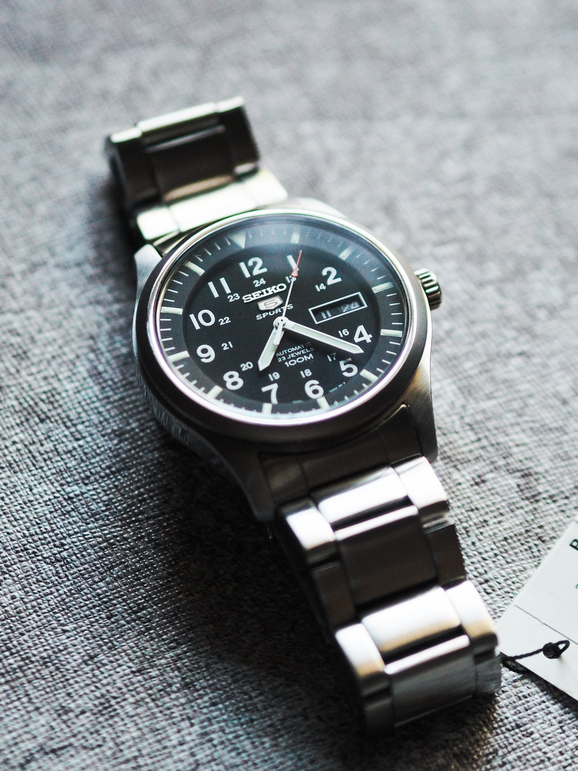 Towards the center of the dial, there's a prominent 12-hour numerical scale, followed by a 24-hour scale a bit inward. This 24-hour scale is a typical feature in military field watches, adding authenticity and practical touch to the timepiece. Additionally, the dial includes an applied Seiko 5 logo with the word "Sports" below it. At the 6 o'clock position, you'll find the words Automatic, 23 jewels, and 100M.