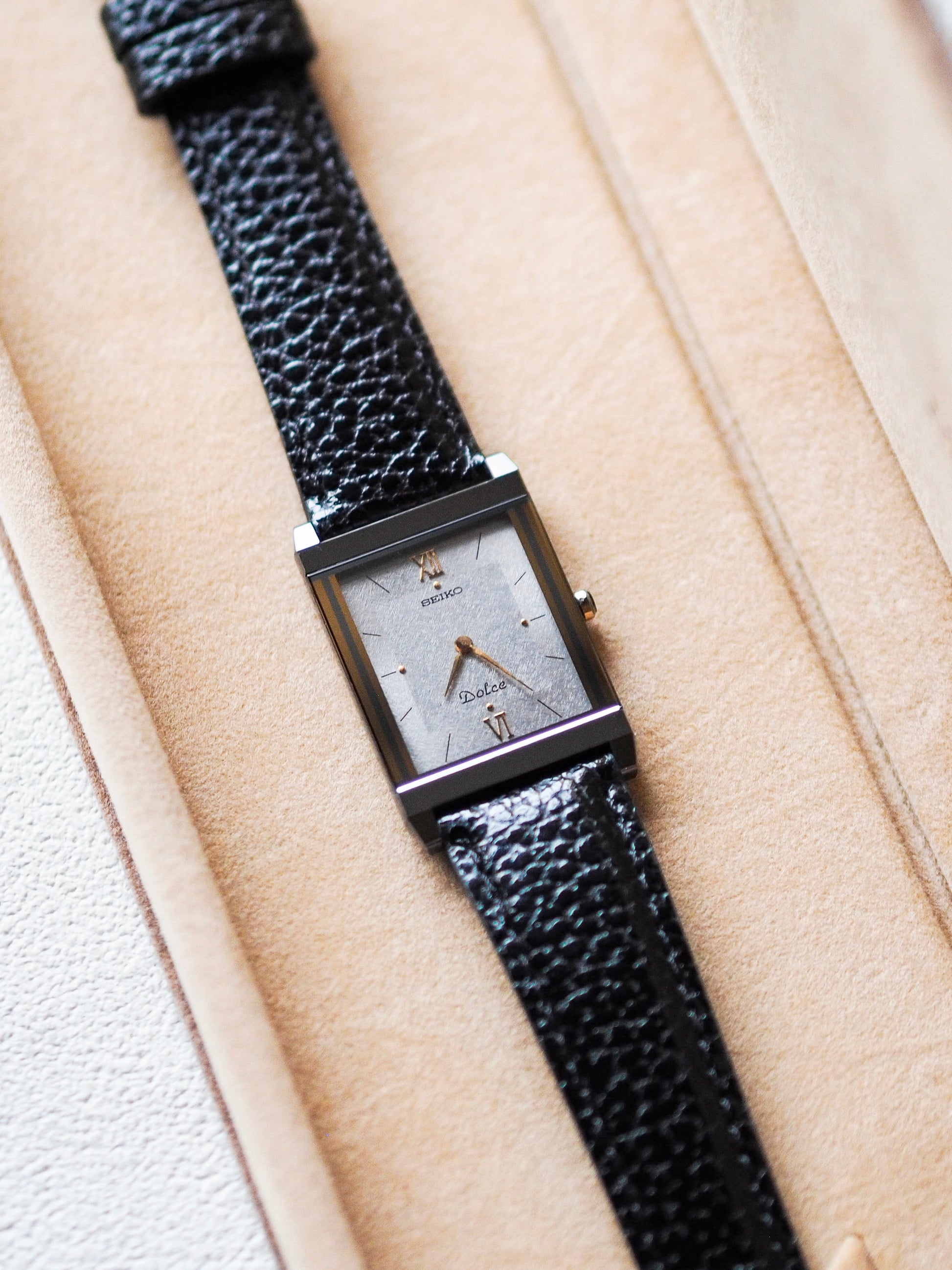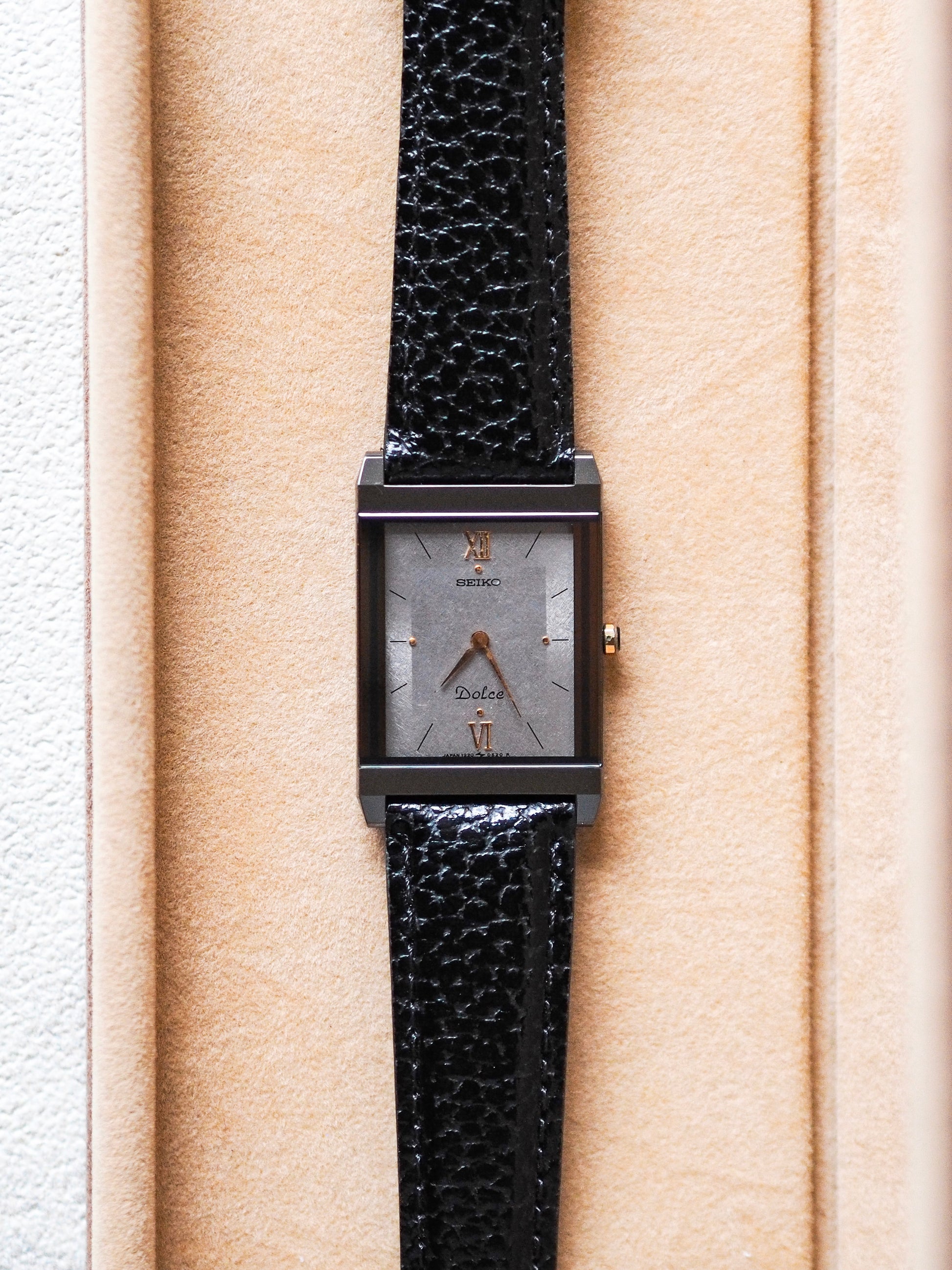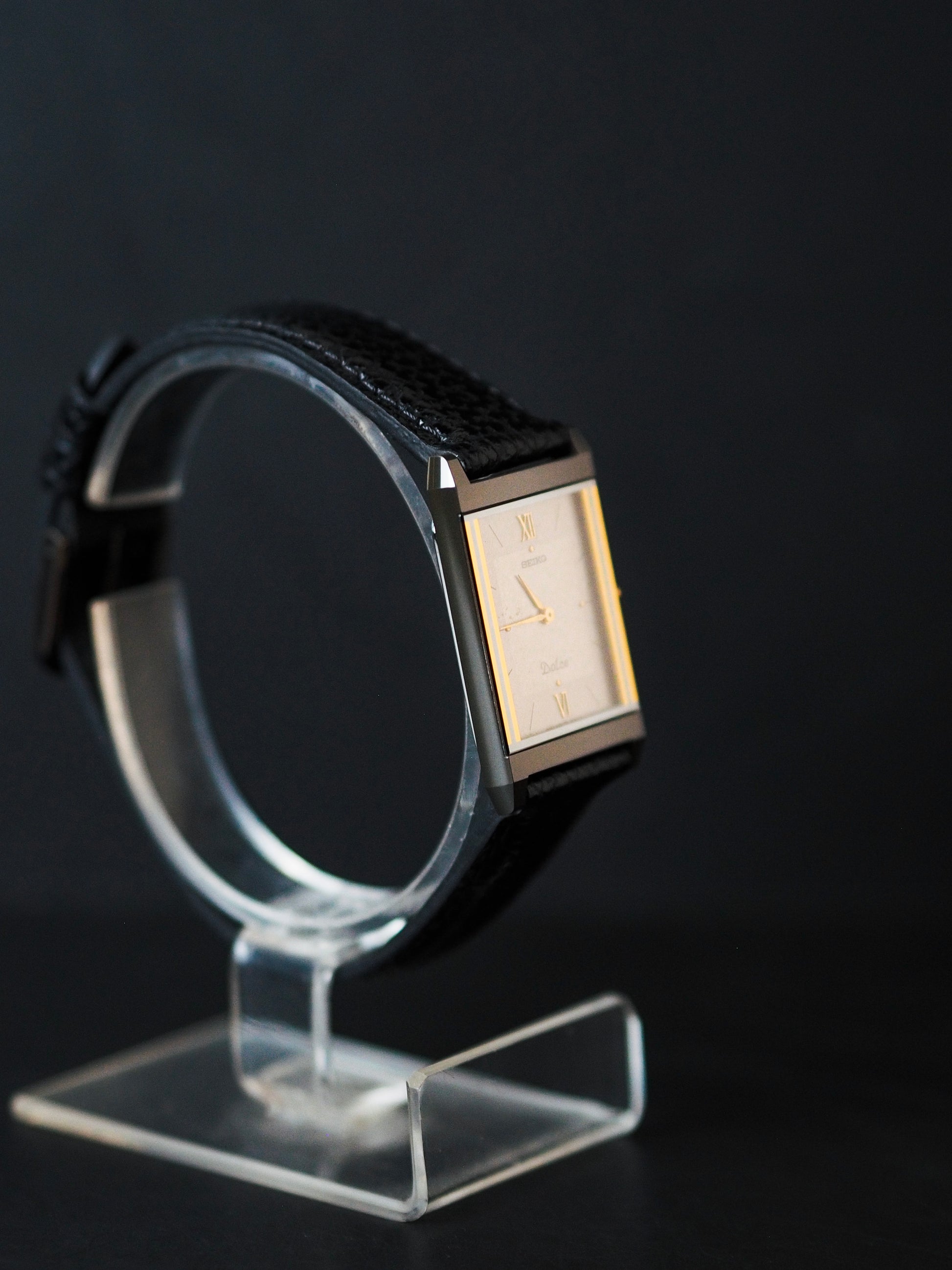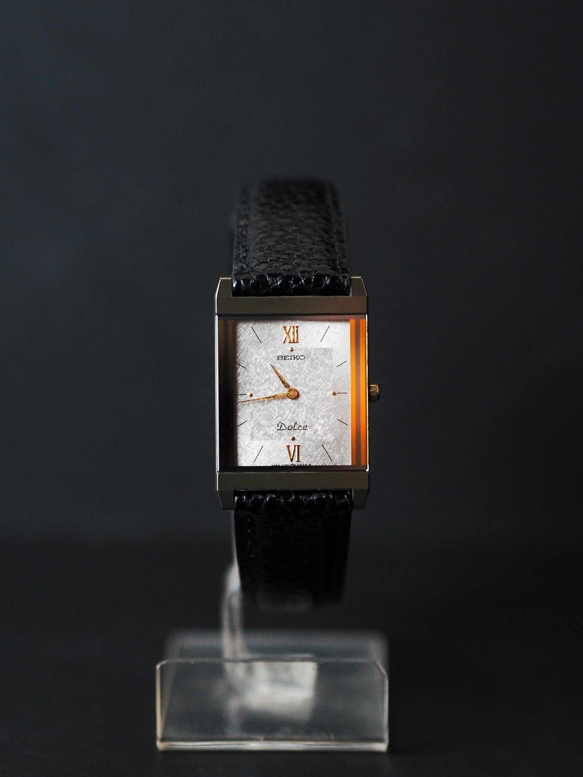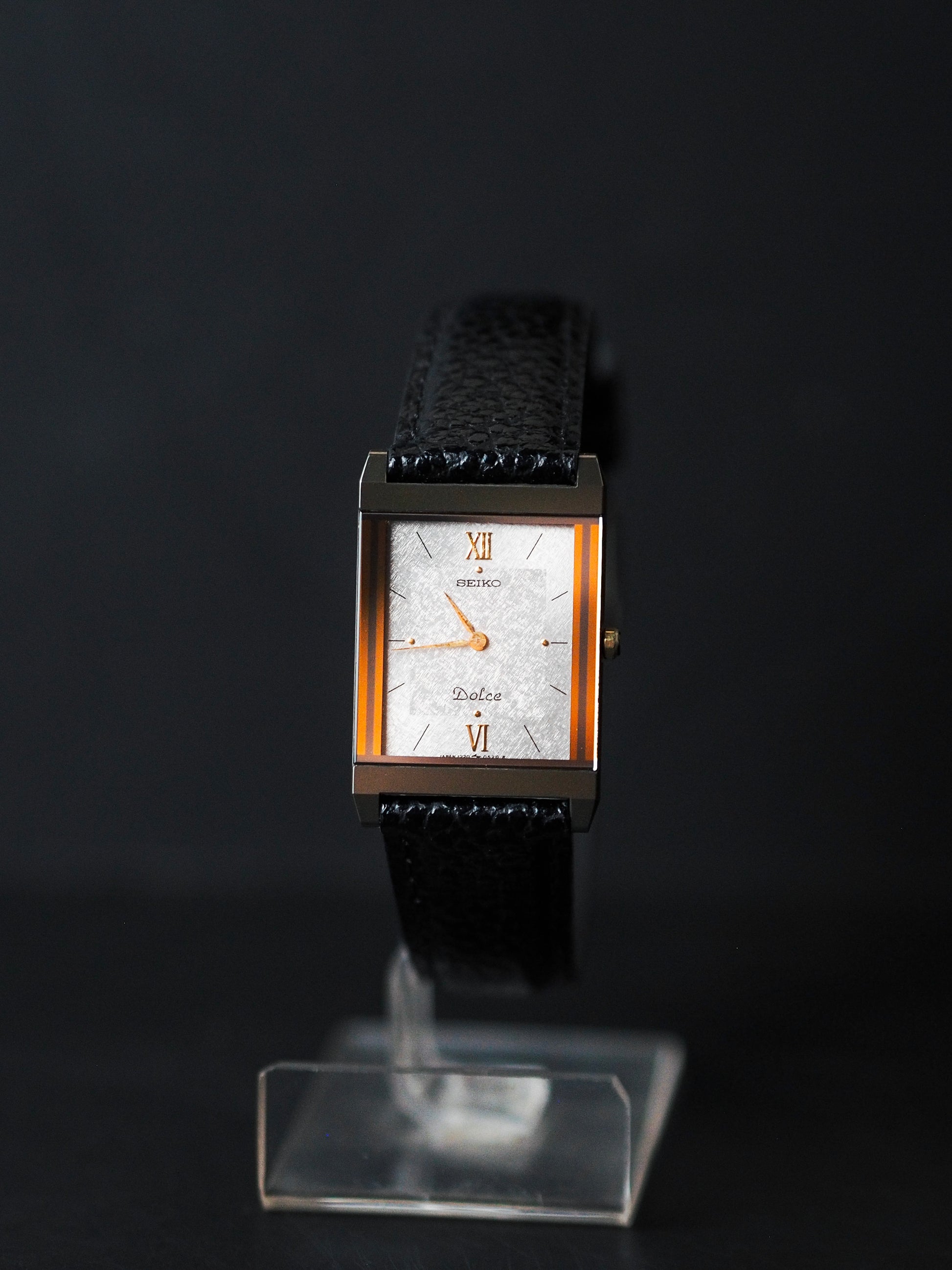 The Seiko 1220-5300 from the Seiko Dolce range, once a luxury lineup in the 1980s, still catches the attention of wearers with its striking tank look and beautiful dial.