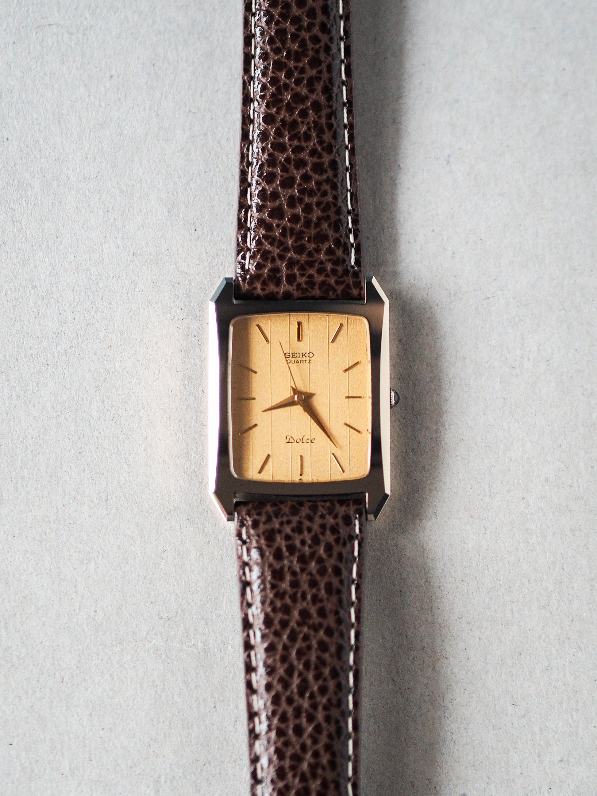 The 1984 Seiko Dolce presented here is a standout example from this exclusive lineup. It features a remarkable tank-shaped case with a distinctive curvy front side, setting it apart from conventional tank designs. Enhancing its luxurious appeal, the watch boasts a curved sapphire crystal, a refined gold pinstripe dial with sword hands and stick indices, and a cabochon-style stone crown.