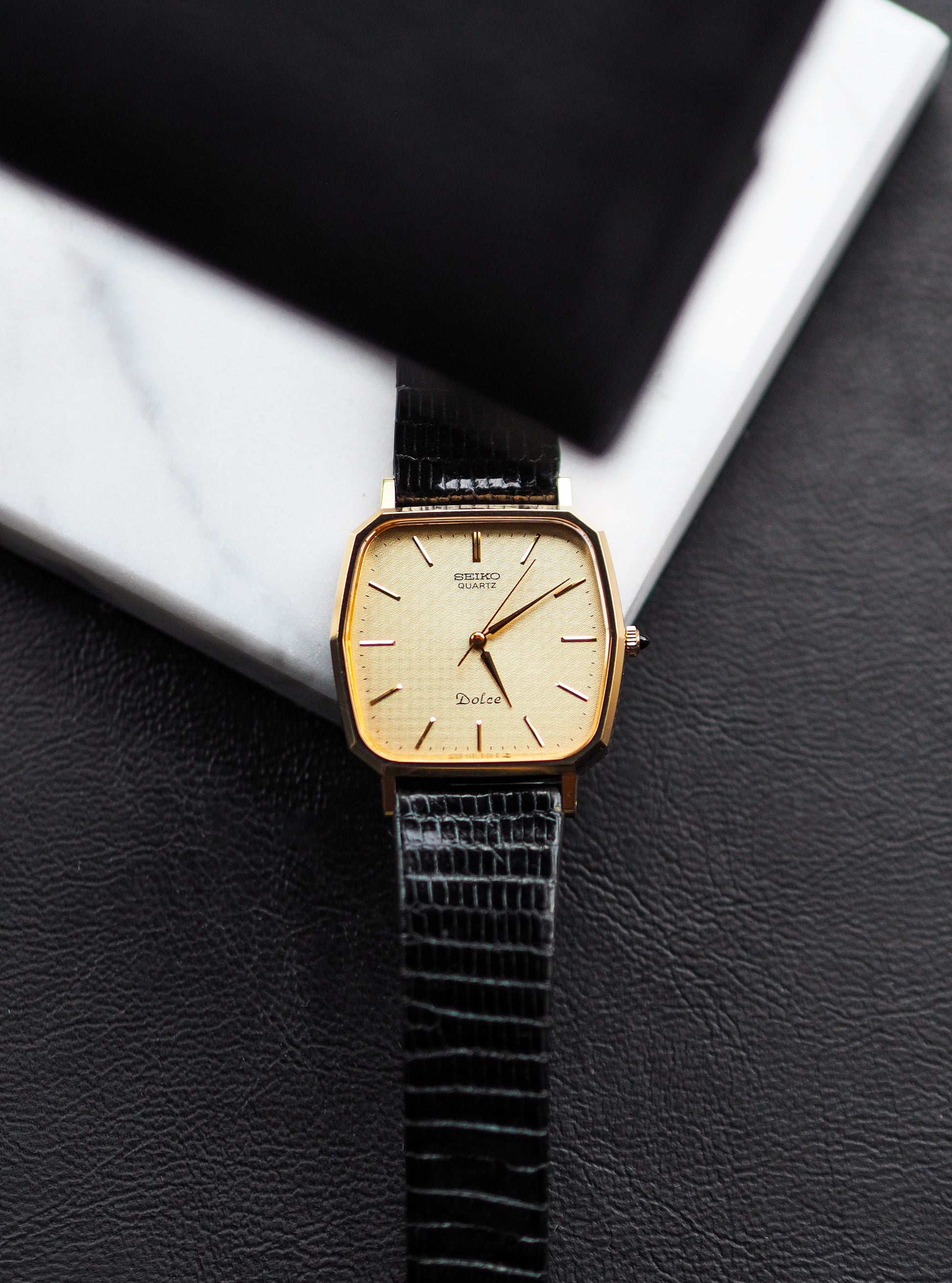 The watch is in remarkable condition, retaining its original bracelet and buckle. The dial remains pristine, the SGP case shows minimal wear, the crystal is clear, and the signature onyx crown adds an extra touch of elegance. A true representation of the Seiko Dolce range, this timepiece is both a collectible and a stylish vintage dress watch.