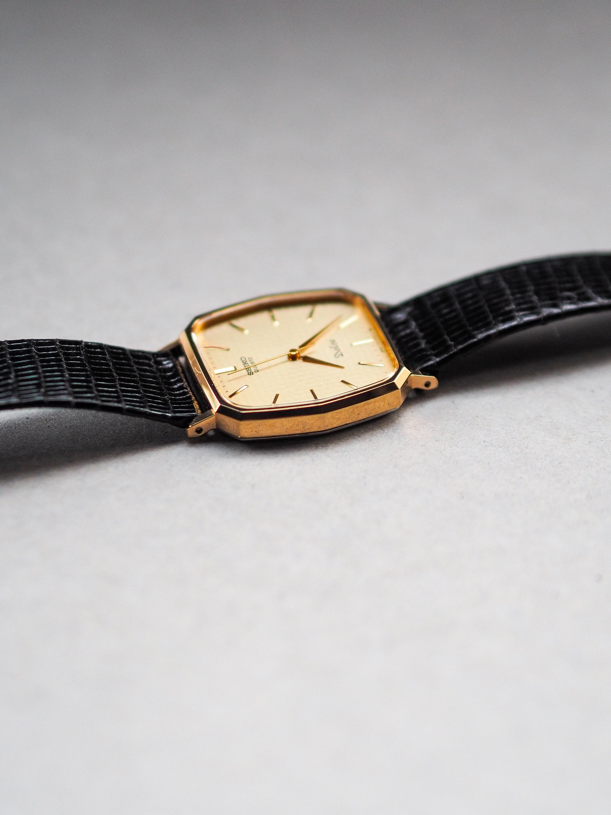 This exquisite Dolce from 1987 stands out with its rare decagon-shaped design, housed in a solid gold-plated (SGP30) case measuring 32mm (to the crown) by 35mm. Its refined champagne-textured dial is complemented by gold stick indices and elegant sword-style hands, exuding timeless sophistication.