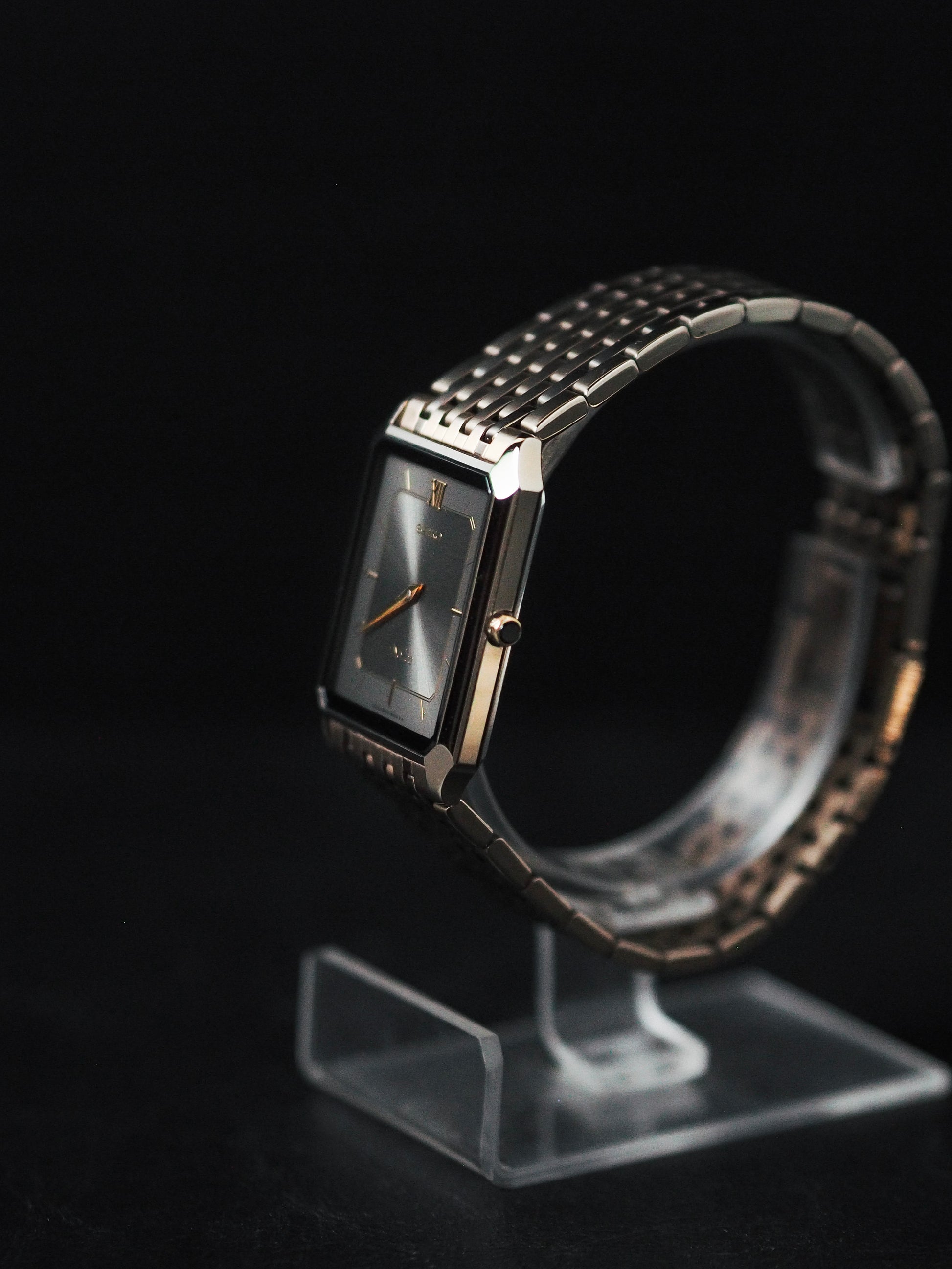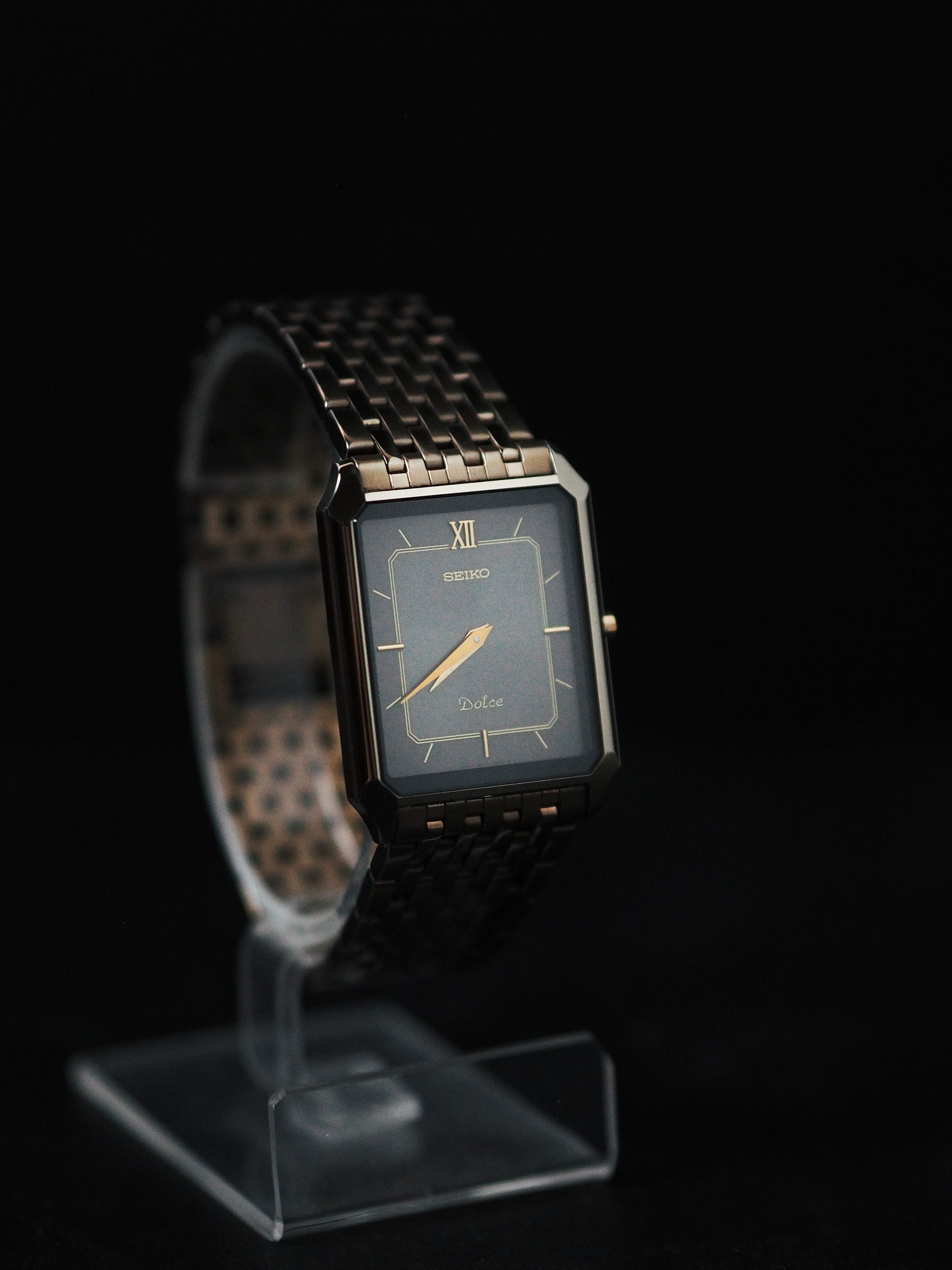 Introducing the Seiko Dolce 8N40-5050, a stunning vintage dress watch. It showcases a darker-tone gold color tank case with curvy edges, adding to its classic appeal. The gray sunburst dial is adorned with gold stick indices and hands. Notably, Dolce's attention to detail, with Roman numerals marking the twelve-hour mark on the indices. The inner dial features a gold frame, while the inner side of the case boasts a black frame, giving it a beautiful dual-tone color appearance.
