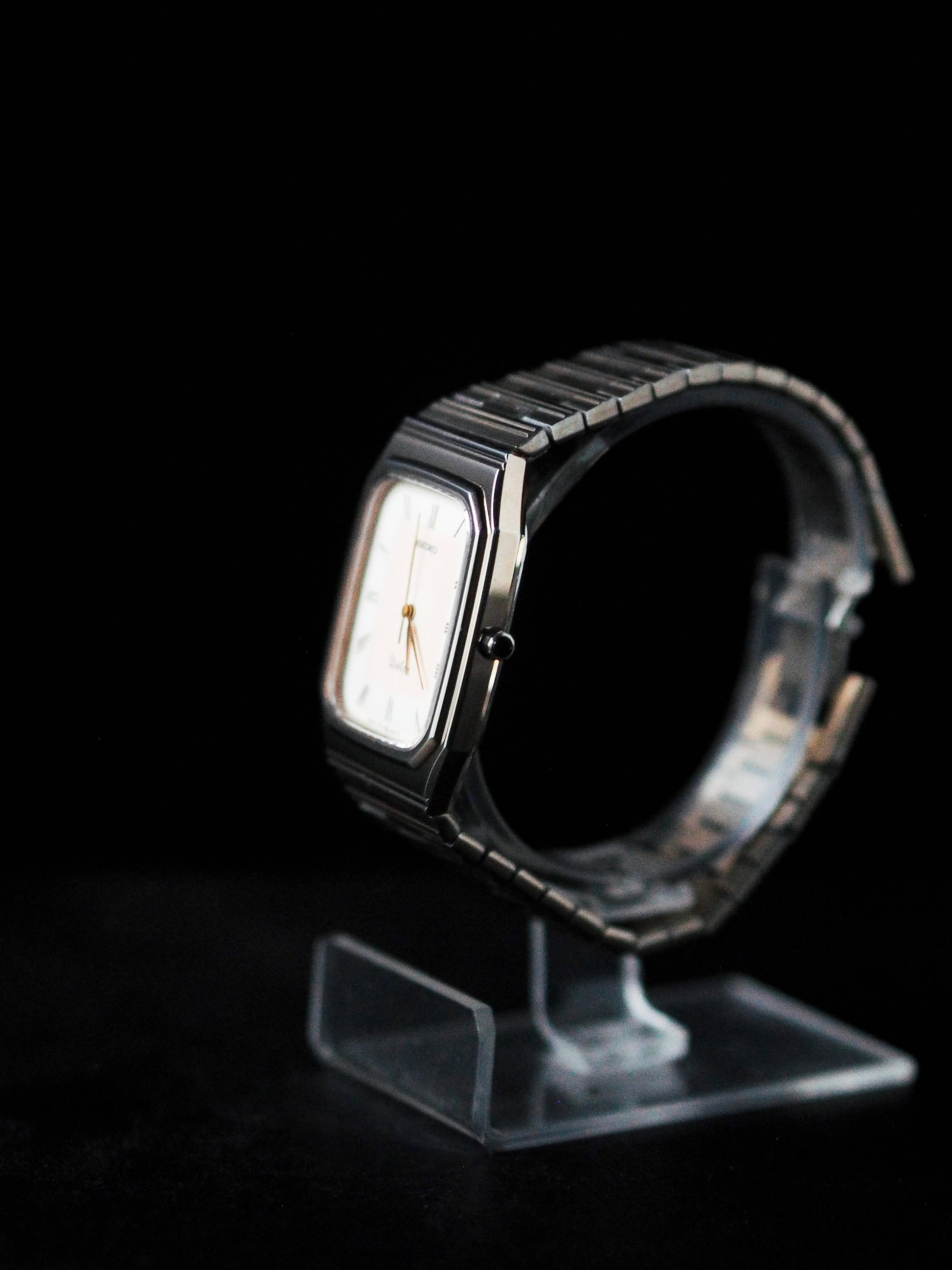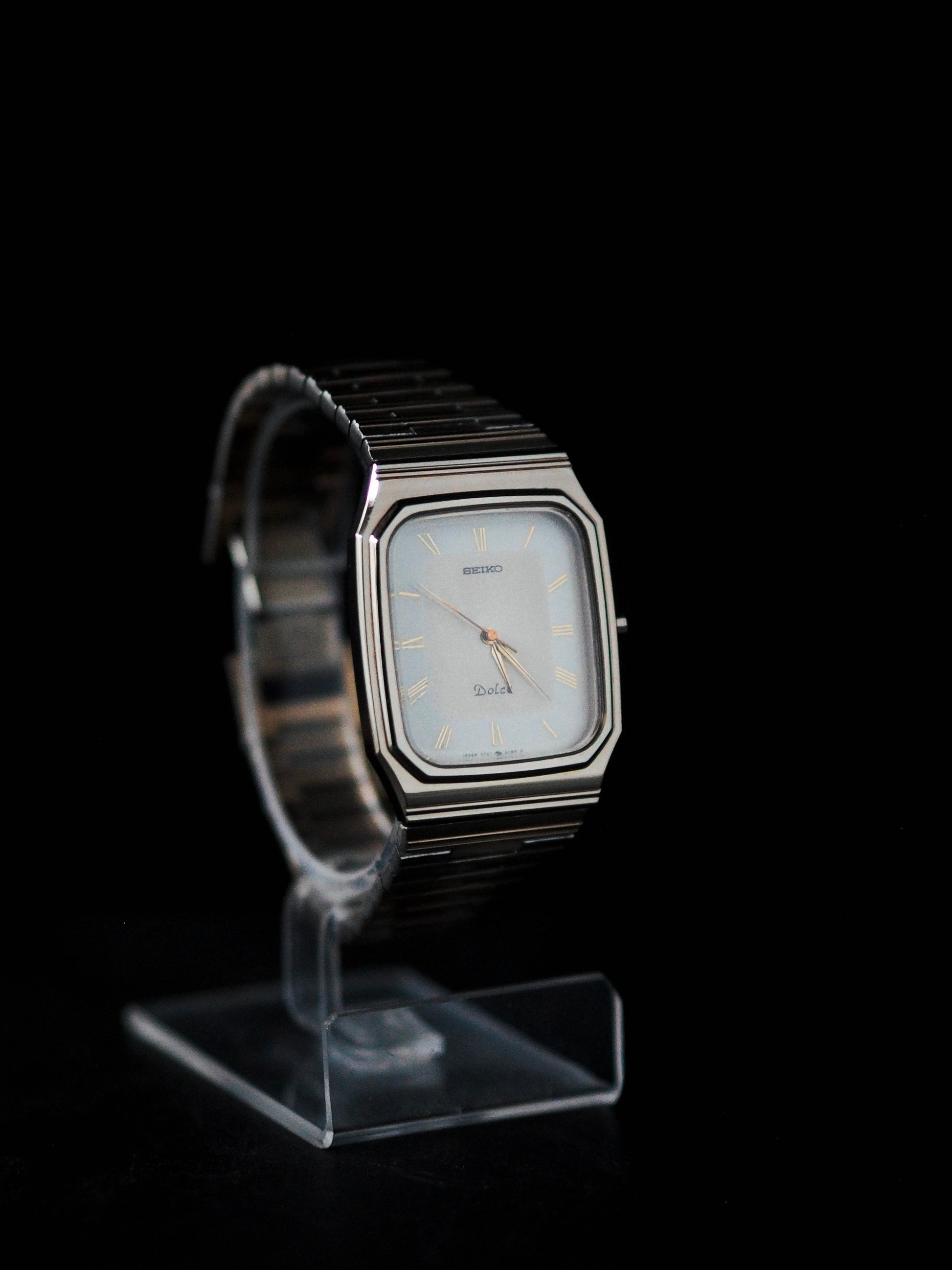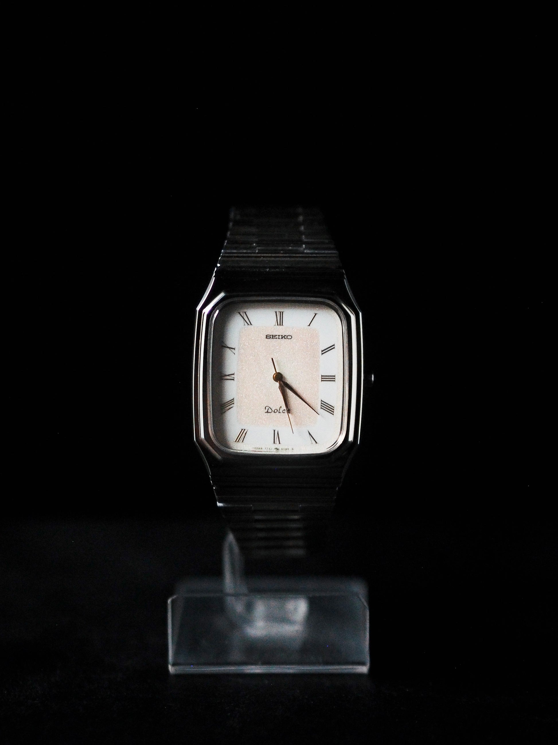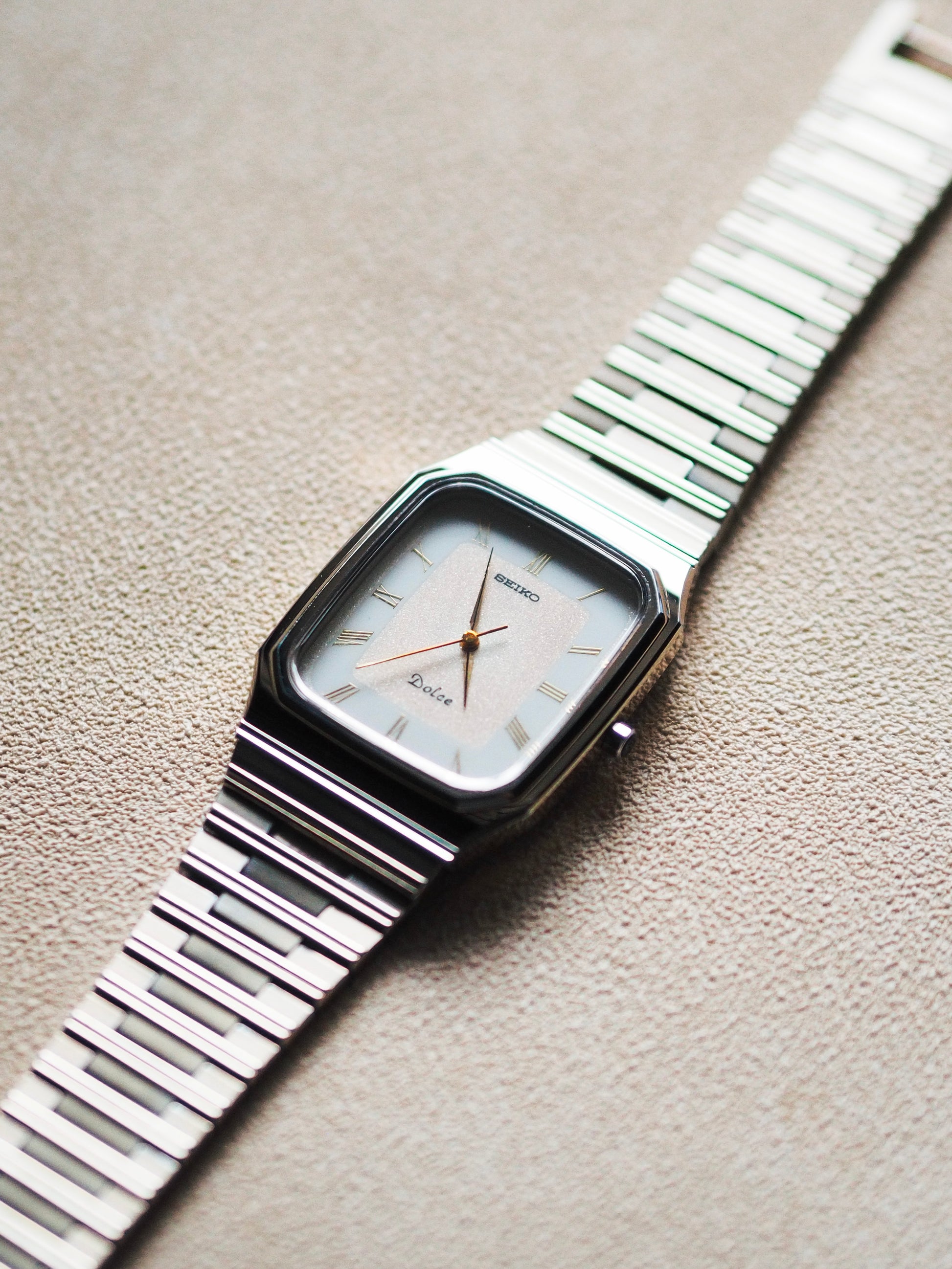 Such as this Seiko Dolce tank 7741-5130, which has an integrated bracelet that fits measurements within +/- 17.5 cm and a gorgeous two-tone salmon dial with shimmering shines under certain lighting conditions. The watch also has sword-shaped hands and gold Roman indices. The sapphire crystal and tungsten carbide casing of the watch have kept it in excellent condition overall.
