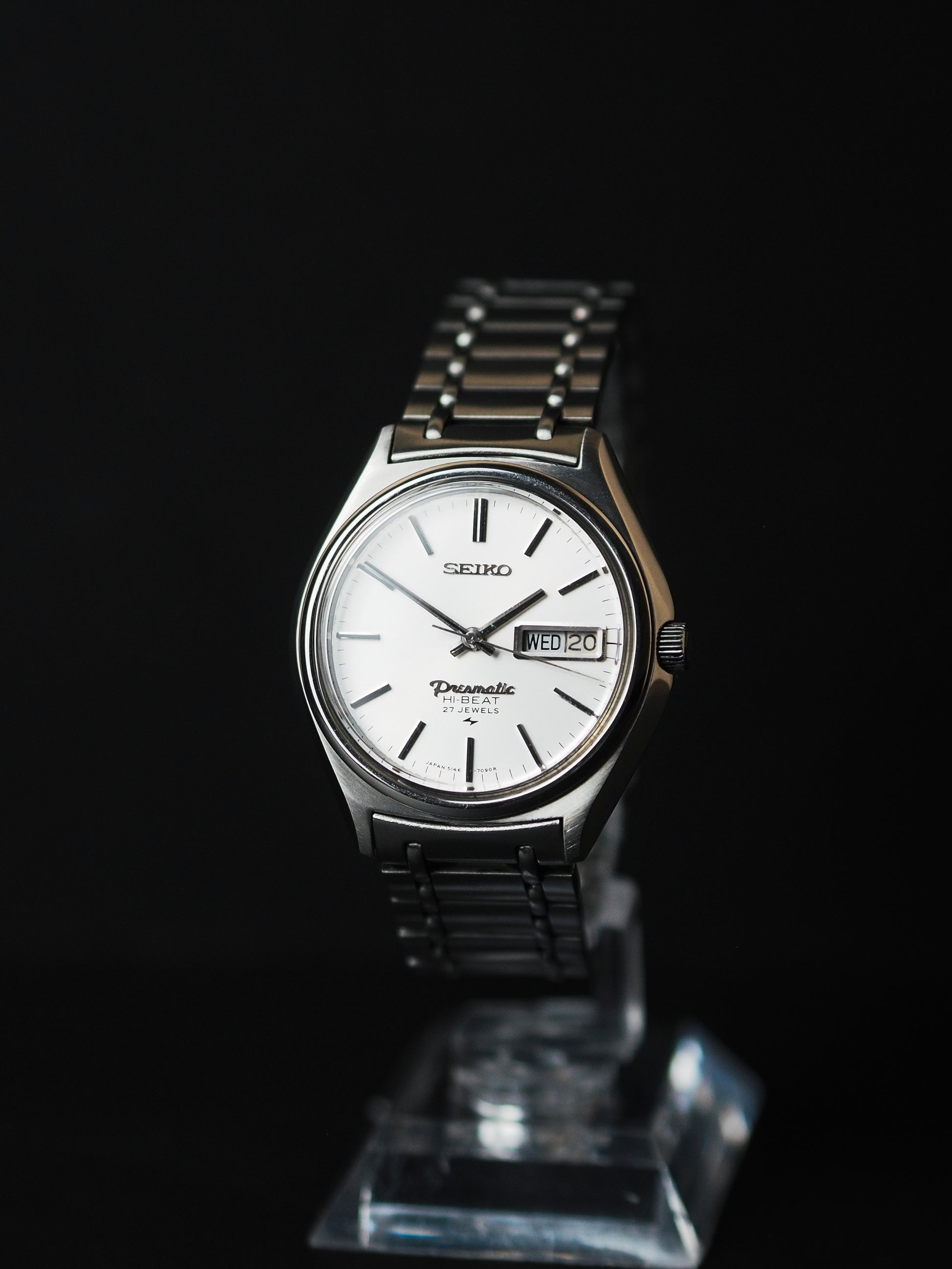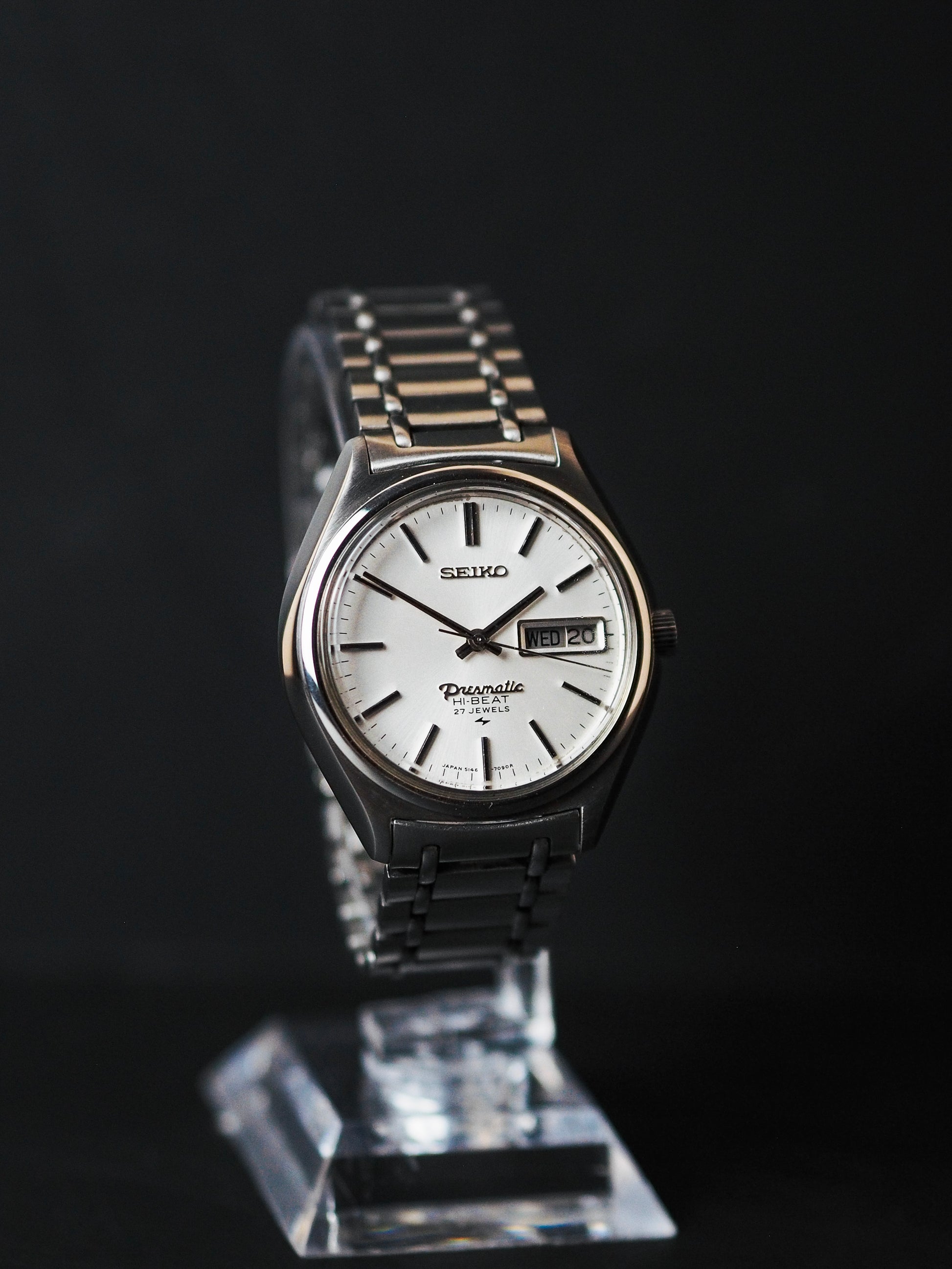 The Seiko 5146-7060, from 1970, features a simple classic white sunburst dial with applied stick indices, a day-date window, and the highlight of the Presmatic logo, similar to the Grand and King Seiko, asserting its higher-end status in the Seiko lineup. It also has the Hi-Beat logo printed above the 6 o'clock position.