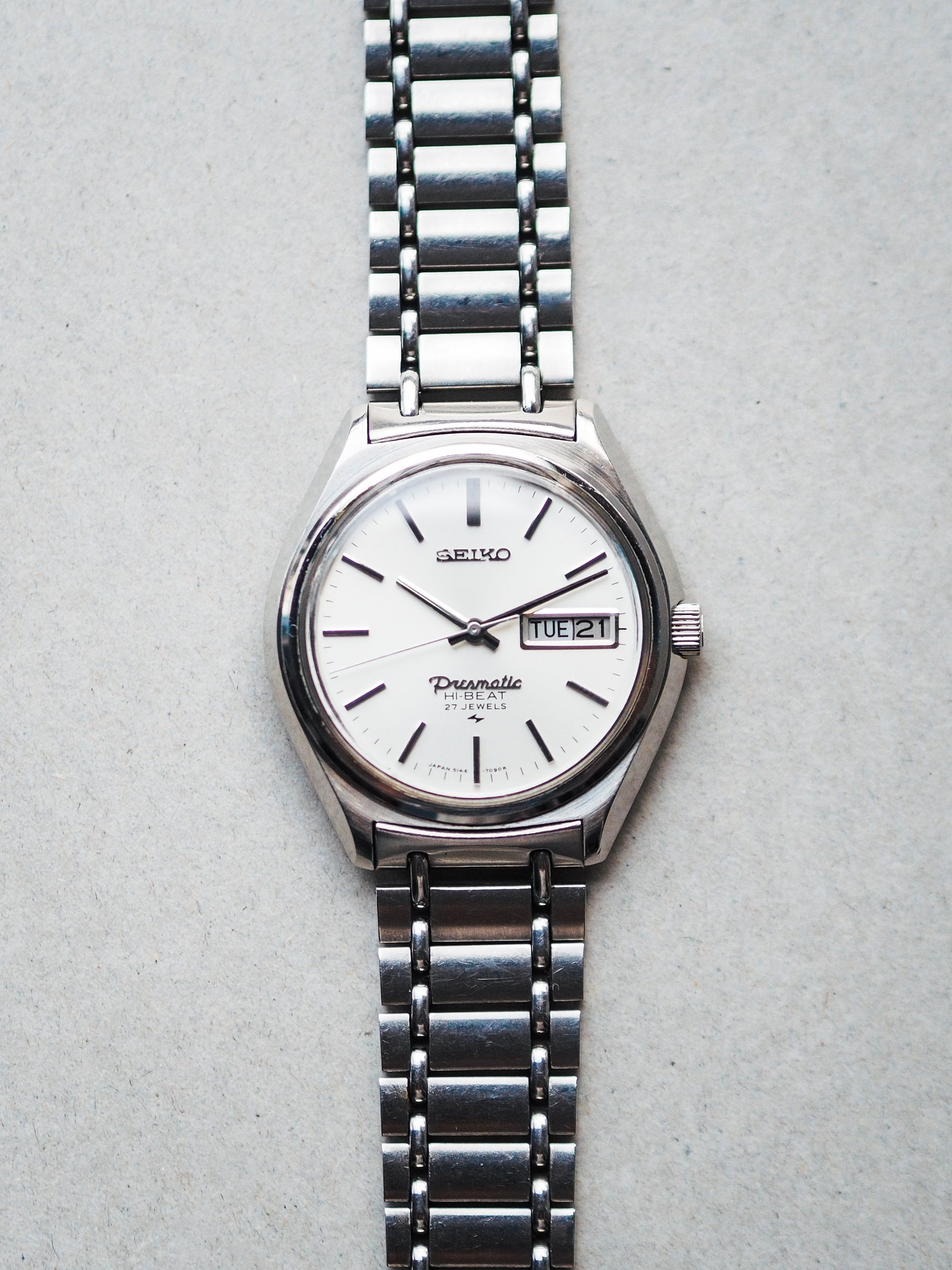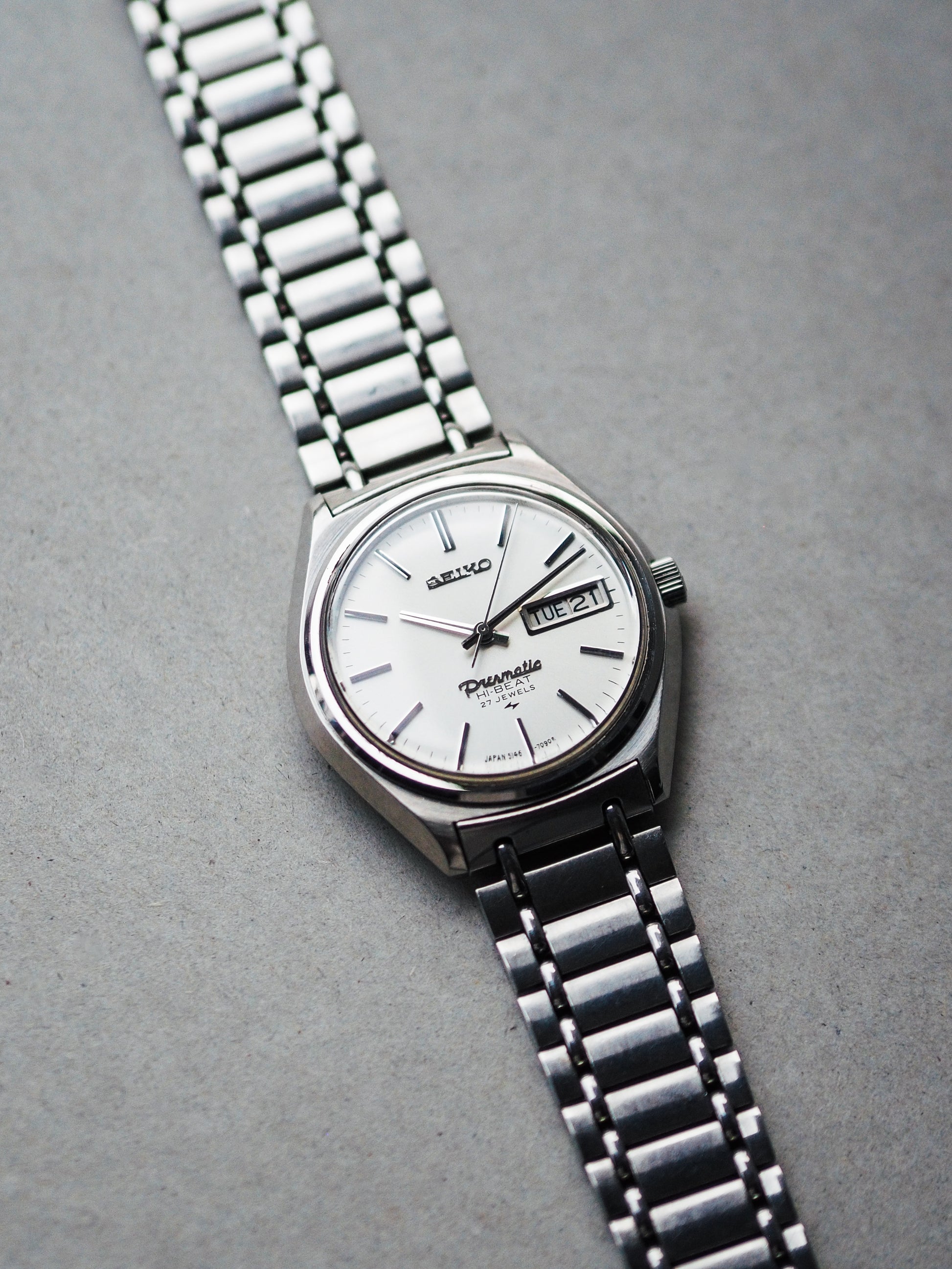 The Seiko 5146-7060, from 1970, features a simple classic white sunburst dial with applied stick indices, a day-date window, and the highlight of the Presmatic logo, similar to the Grand and King Seiko, asserting its higher-end status in the Seiko lineup. It also has the Hi-Beat logo printed above the 6 o'clock position.