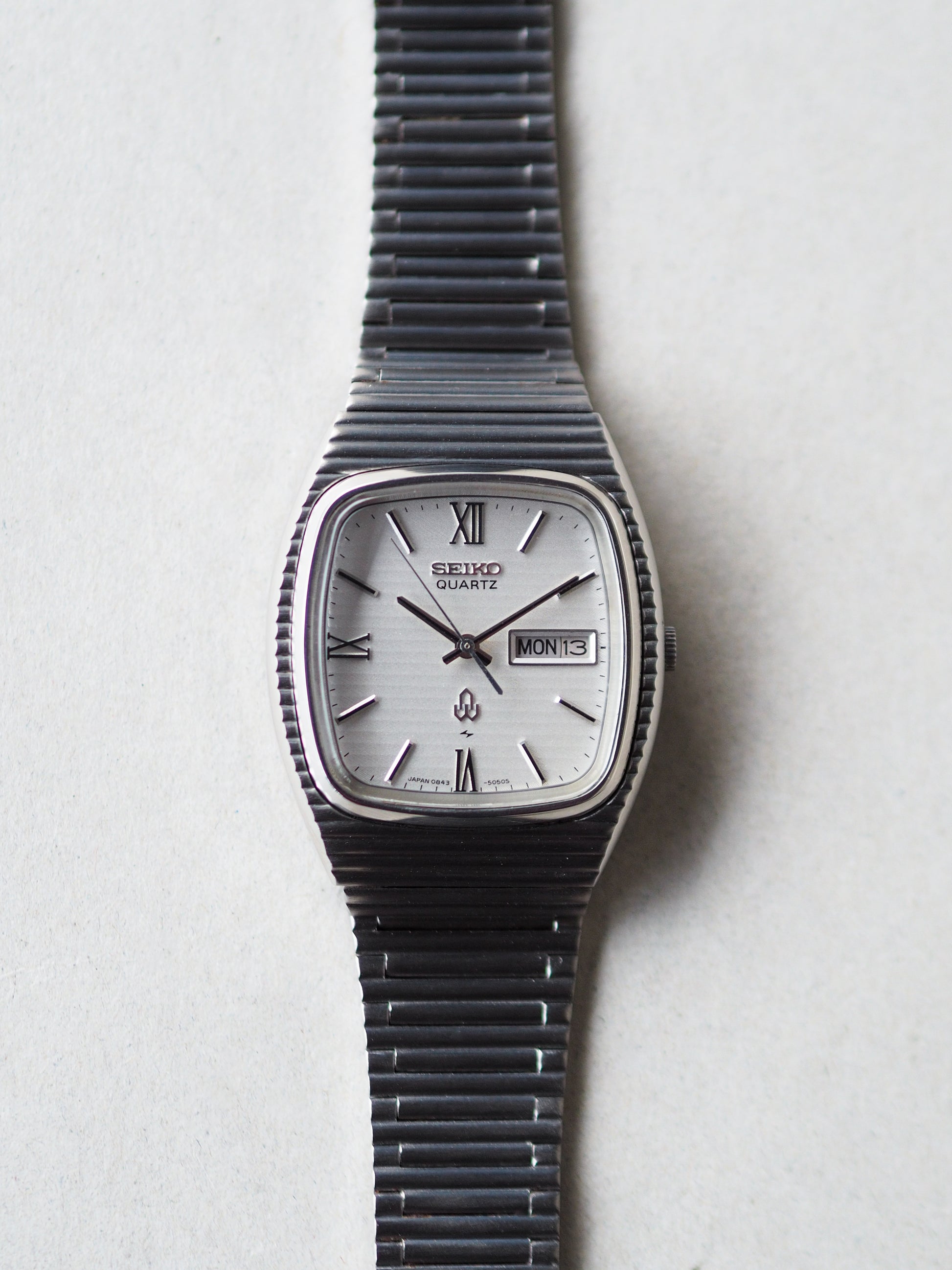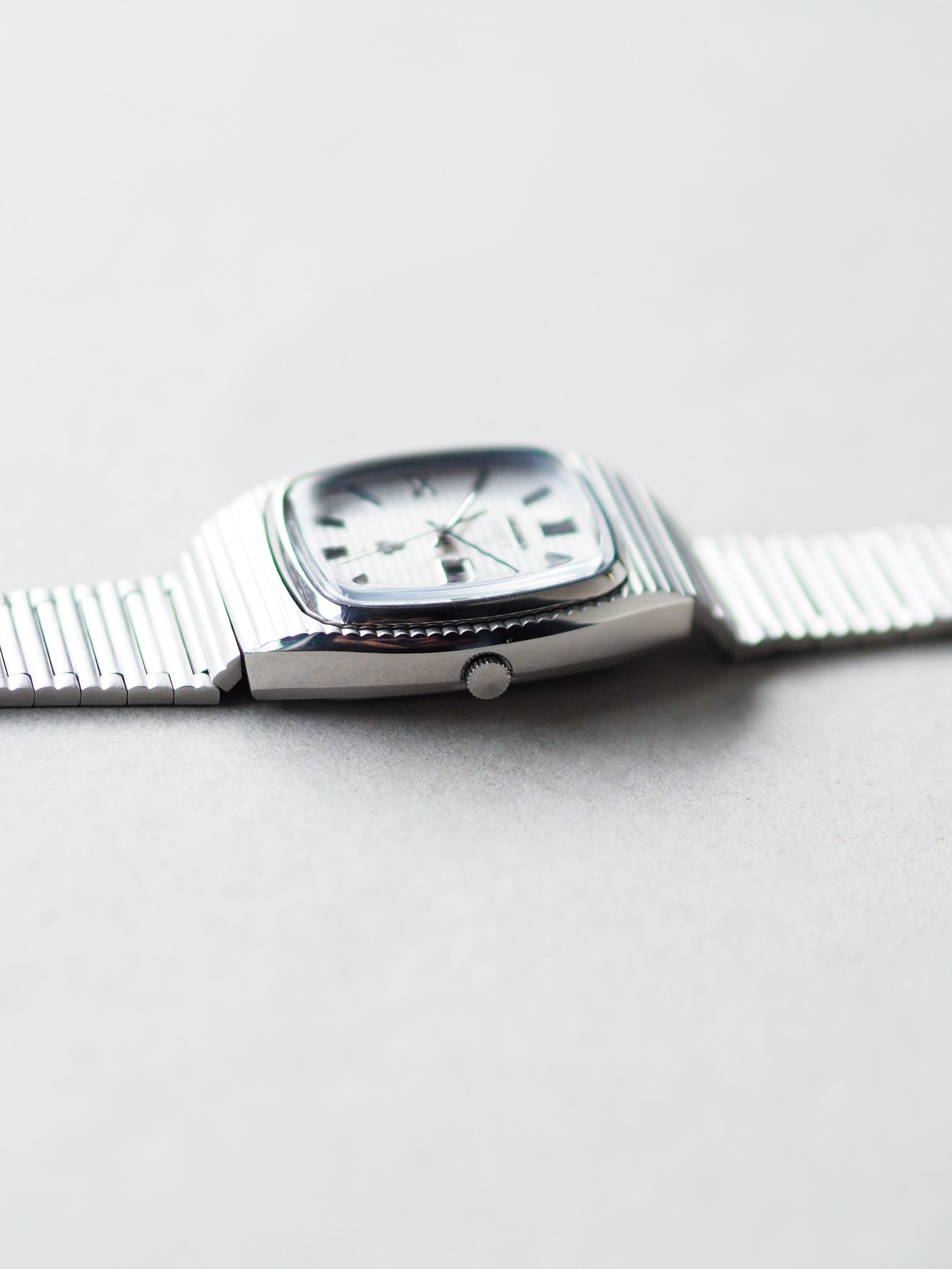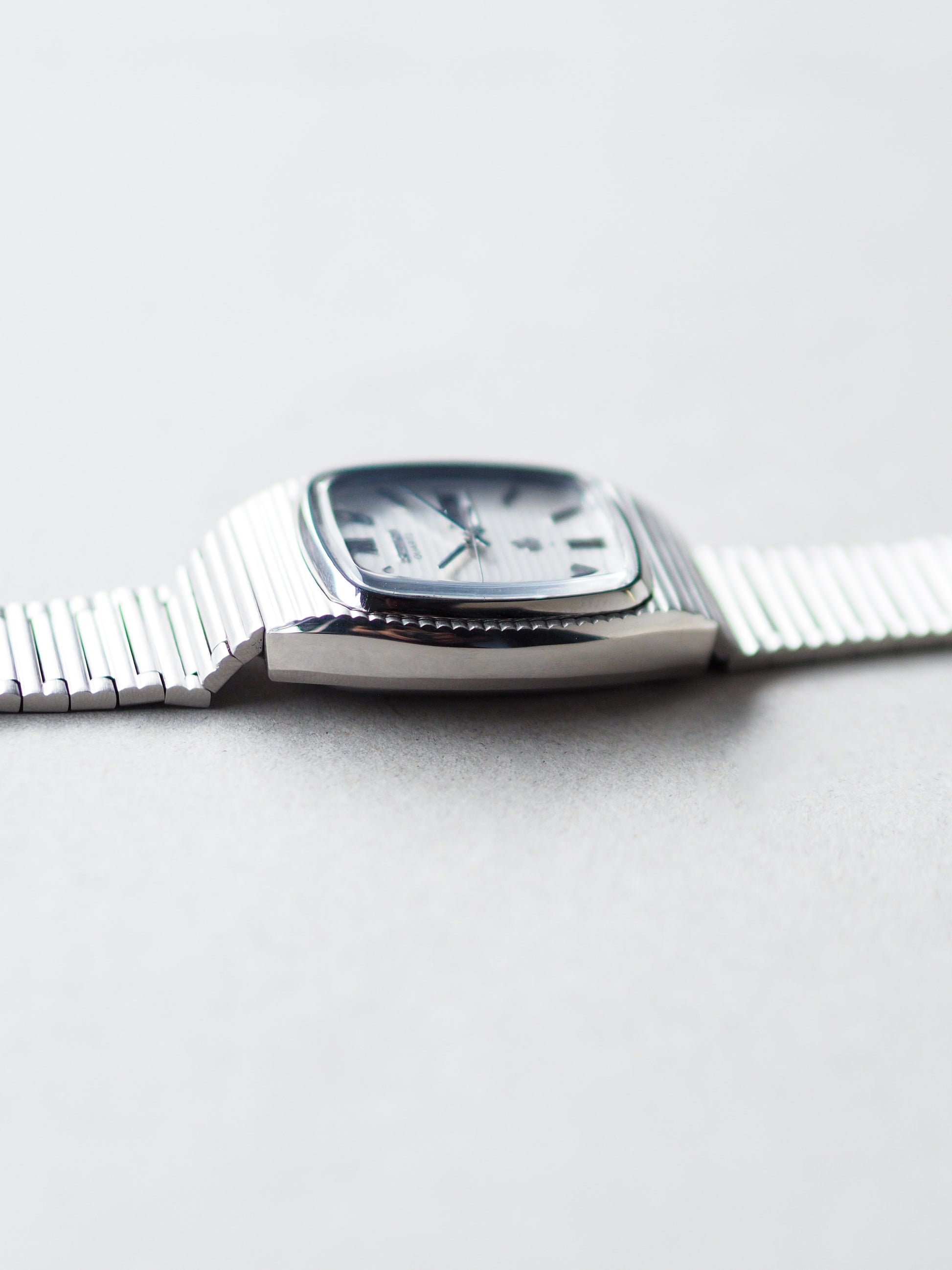 This Seiko 0843-5050 from 1976 is a striking and unique vintage tank watch, defined by its horizontal stripe motif that seamlessly extends across the white dial, case, and integrated steel bracelet. The dial showcases a distinctive layout with a mix of slender indices and Roman numerals at 6, 9, and 12, paired with polished hands and a framed day-date display, and it also gives a shiny rainbow color effects when view under certain angle of light conditions.