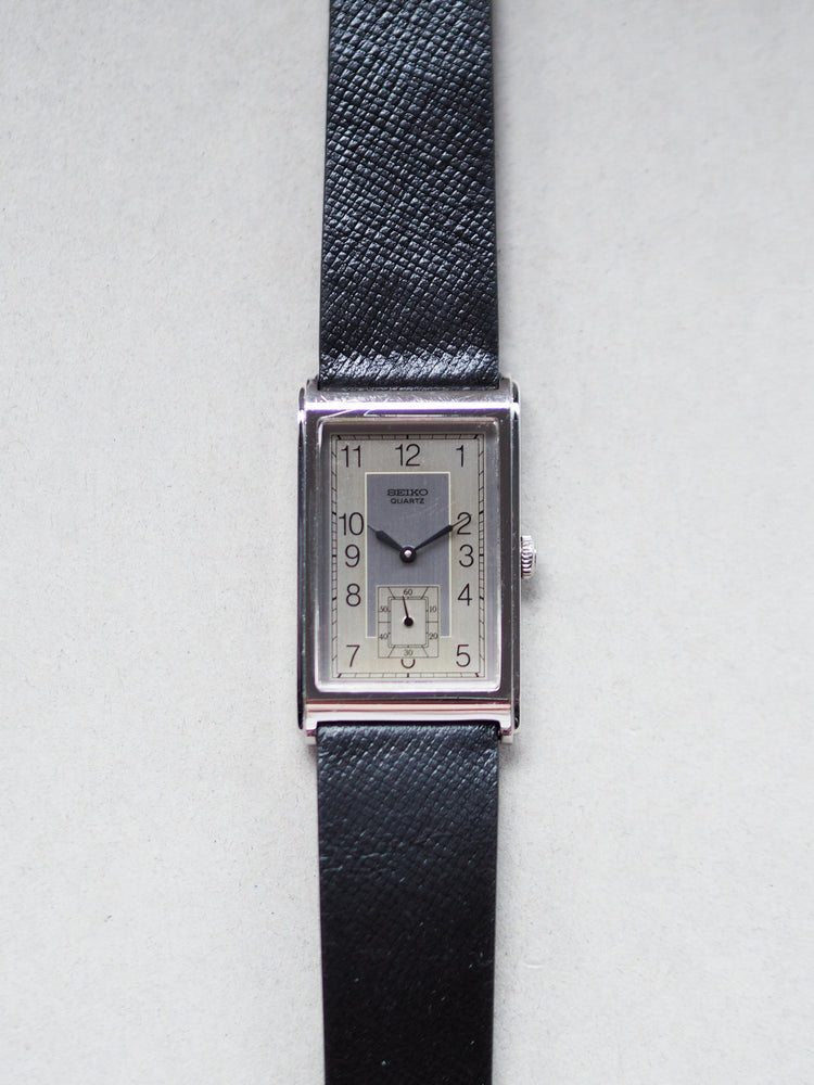 The Seiko 2628-5120, produced in 1982, is a refined vintage tank watch showcasing Seiko’s take on Art Deco-inspired design. Its vertical brushed two-tone silver dial is accented with bold black Arabic numerals, a railway minute track, and distinctive black syringe hands, completed with a sub-seconds register at 6 o’clock—an aesthetic reminiscent of the Jaeger-LeCoultre Reverso Classic Small Seconds.