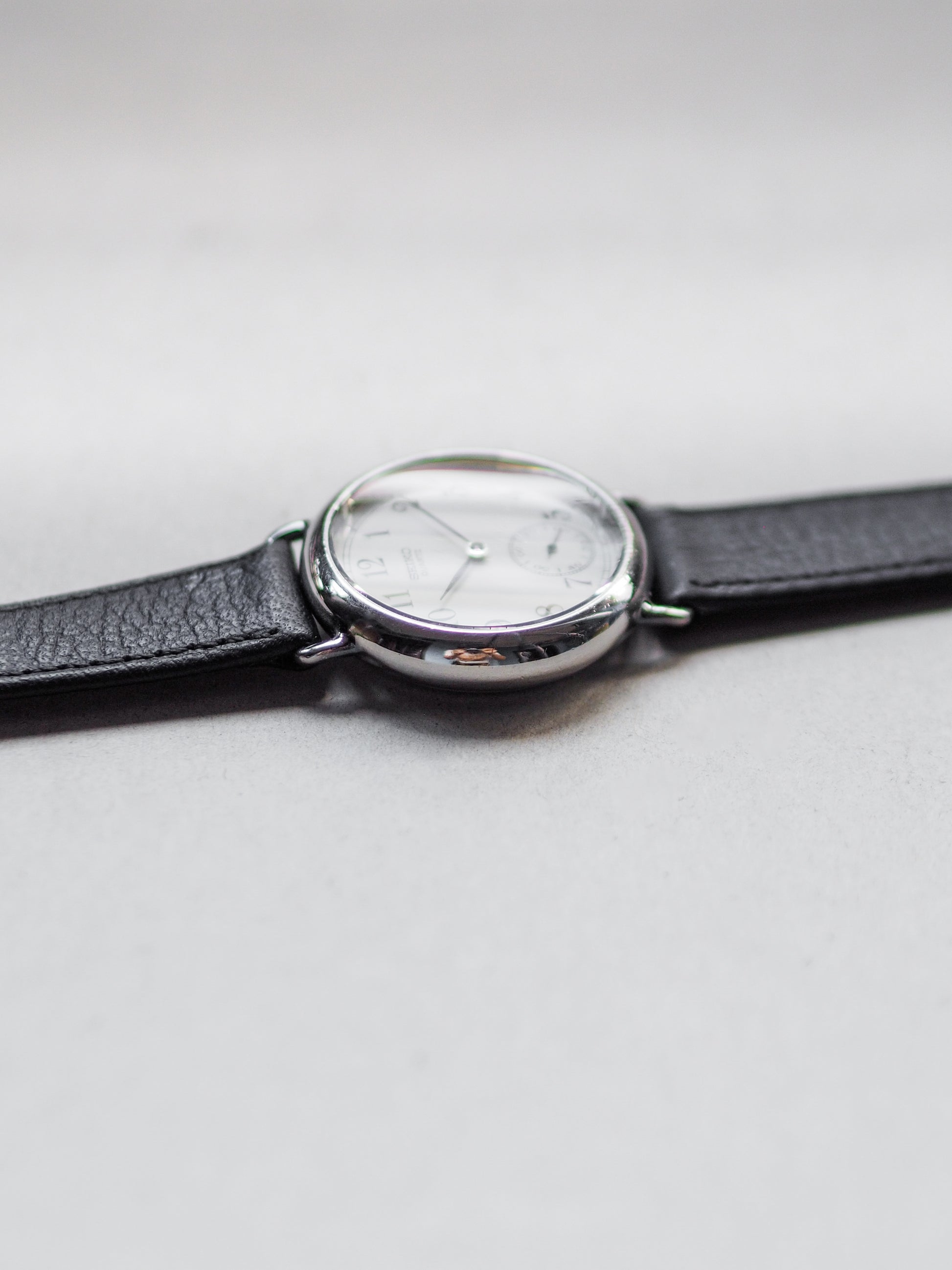 Powered by the 2G28 movement, crafted in the 1980s, this watch was specifically designed to accommodate the sub-seconds dial configuration, enhancing its vintage appeal. The round case shape, combined with classic hinged lugs, gives the watch a timeless, elegant look. The enamel-like white dial is adorned with numeric indices and a rail track minute marker, perfectly complemented by delicate leaf-style hands. The sub-seconds window above 6 o'clock adds an extra touch of sophistication to the design.